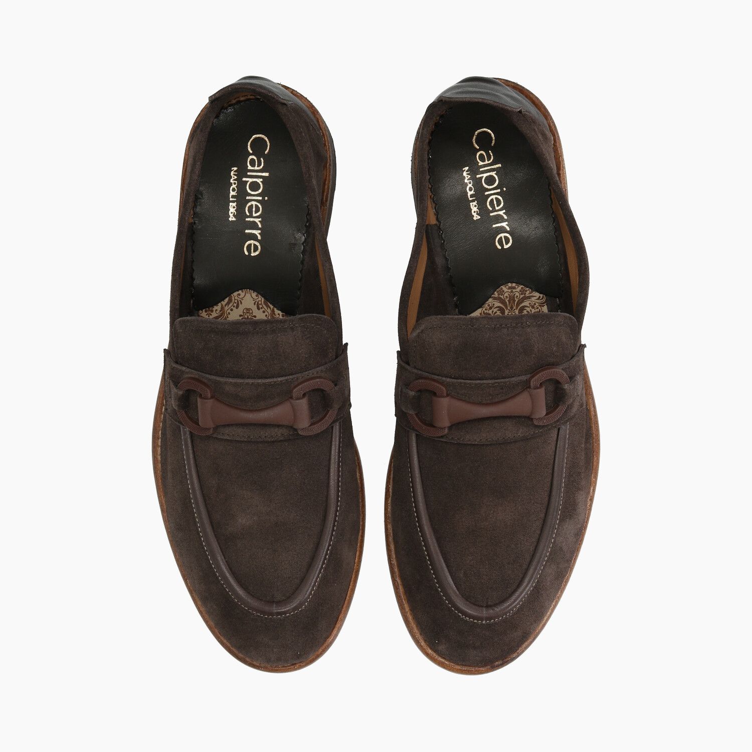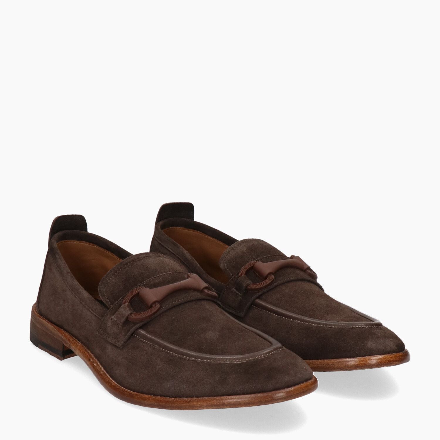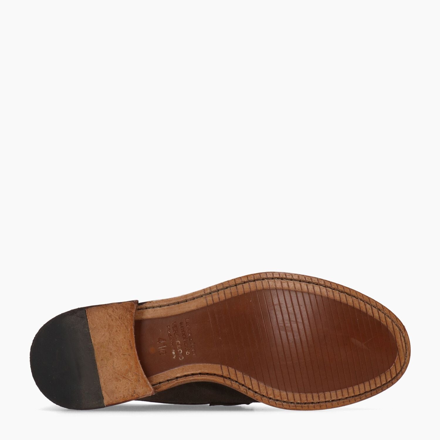 Dunkelbraune Wildlederslipper mit Gummiverschluss und genähter Ledersohle.