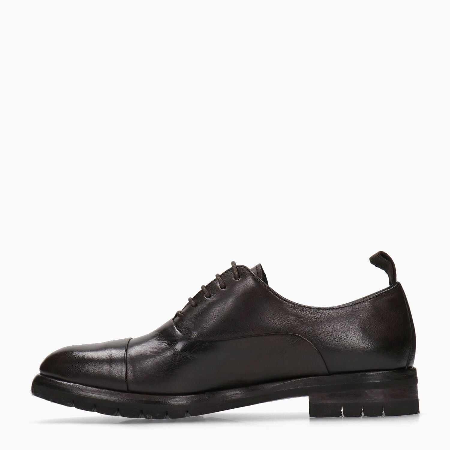 Dunkelbraune Oxford-Schuhe aus Leder mit Zehenkappe, Schlupfkonstruktion für zusätzlichen Komfort und genähter Gummisohle.
