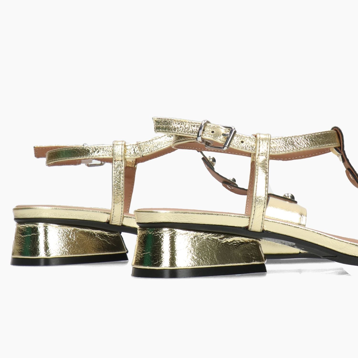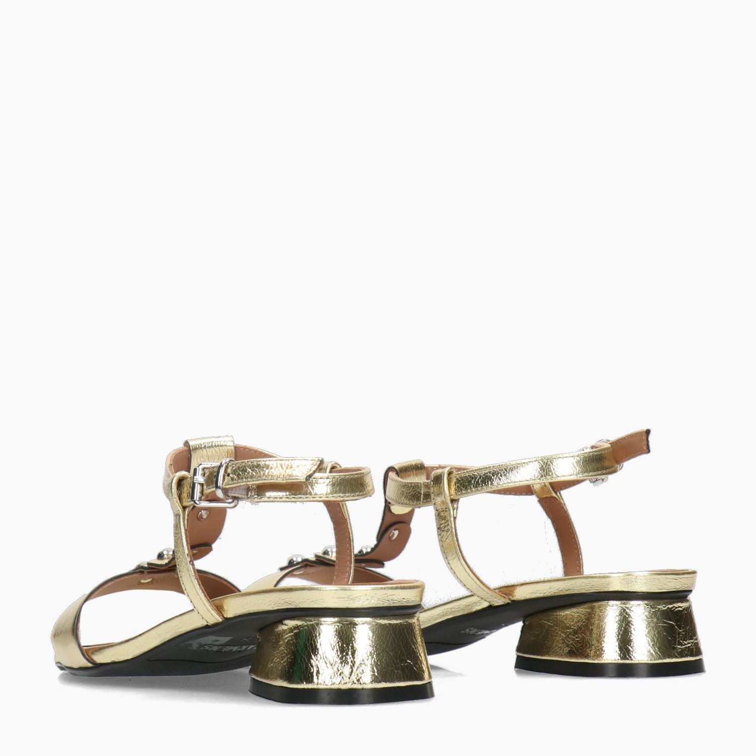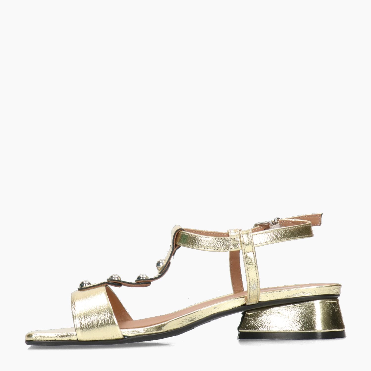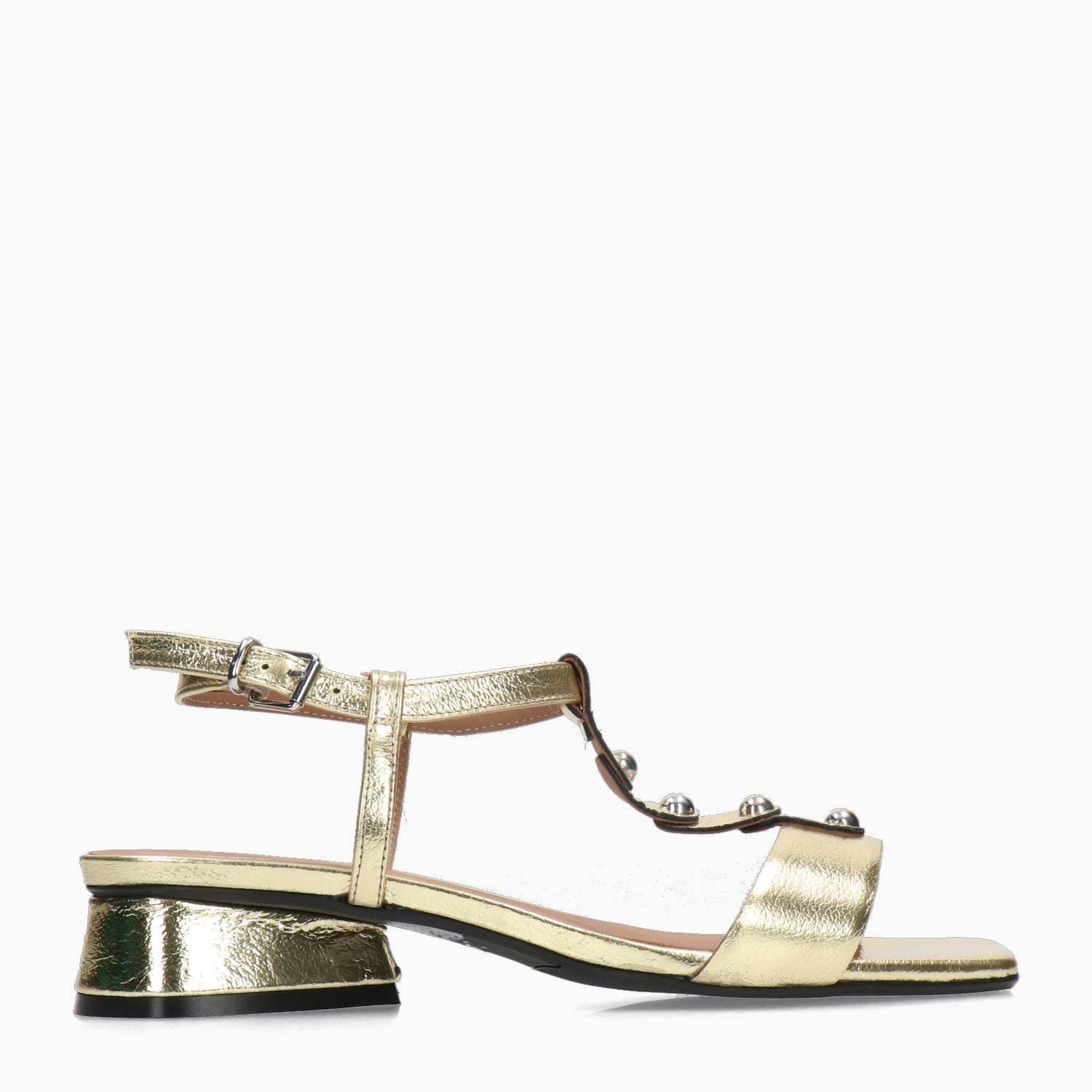 Goldfarbene Sandale aus laminiertem Leder mit nietenbesetztem T-Riemen. Verstellbarer Knöchelriemen. Lederfutter. Gummisohle mit 3 cm Absatz. Carmens Damen-Frühjahr/Sommer-Kollektion.