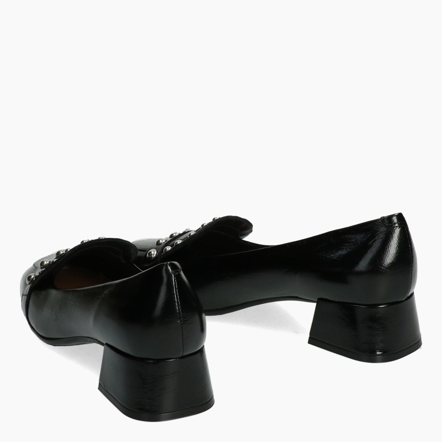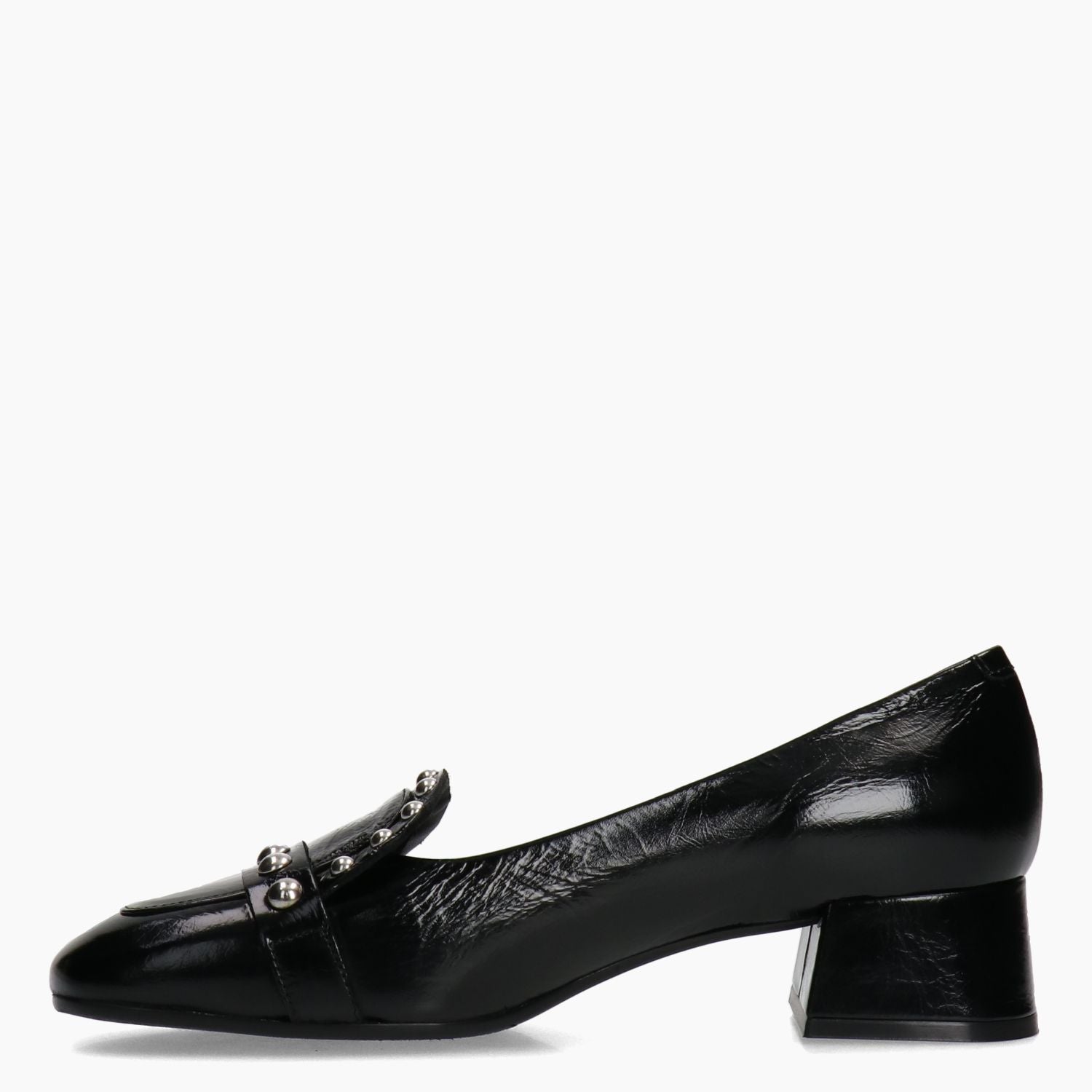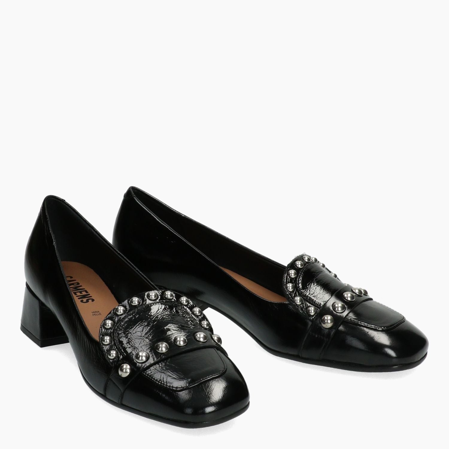 Mokassin mit Obermaterial aus schwarzem Lackleder. Silberne Ziernieten an der Zunge. Lederfutter. Gummisohle mit 4 cm Absatz. Carmens Damen Herbst/Winter Kollektion.