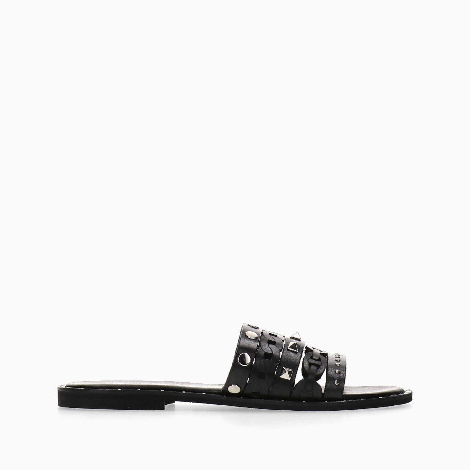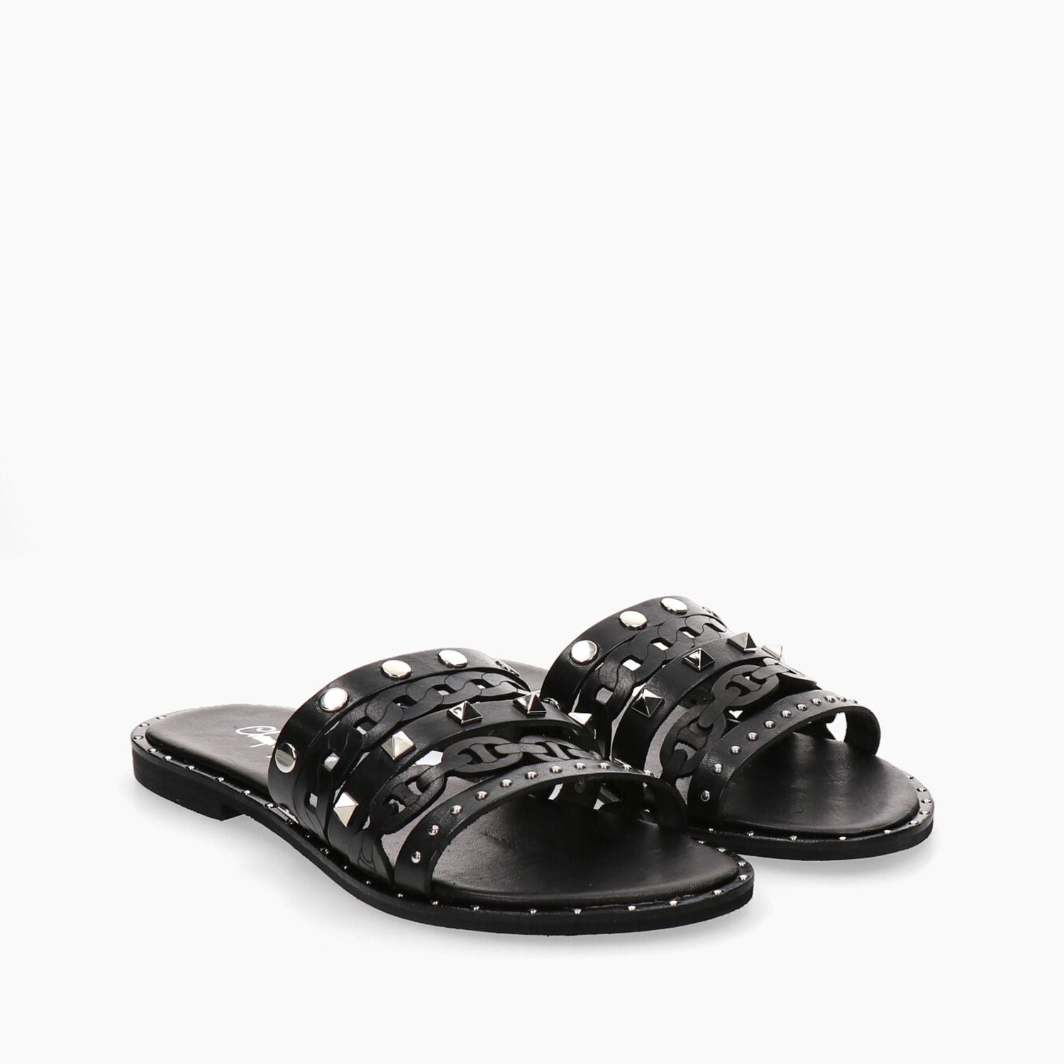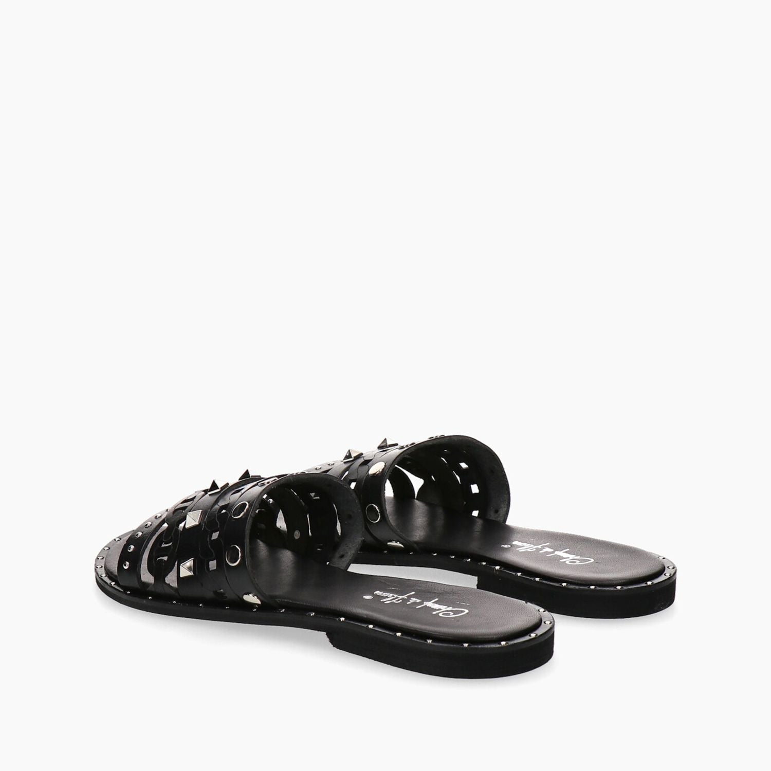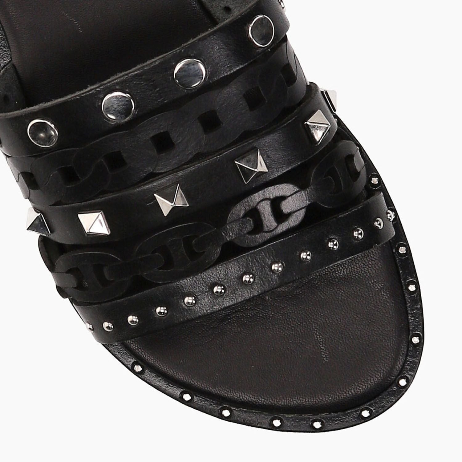 Schwarze Lederpantoffeln mit aufgesetzten Nieten, gepolsterter Innensohle, 10 cm Absatz, Gummisohle.