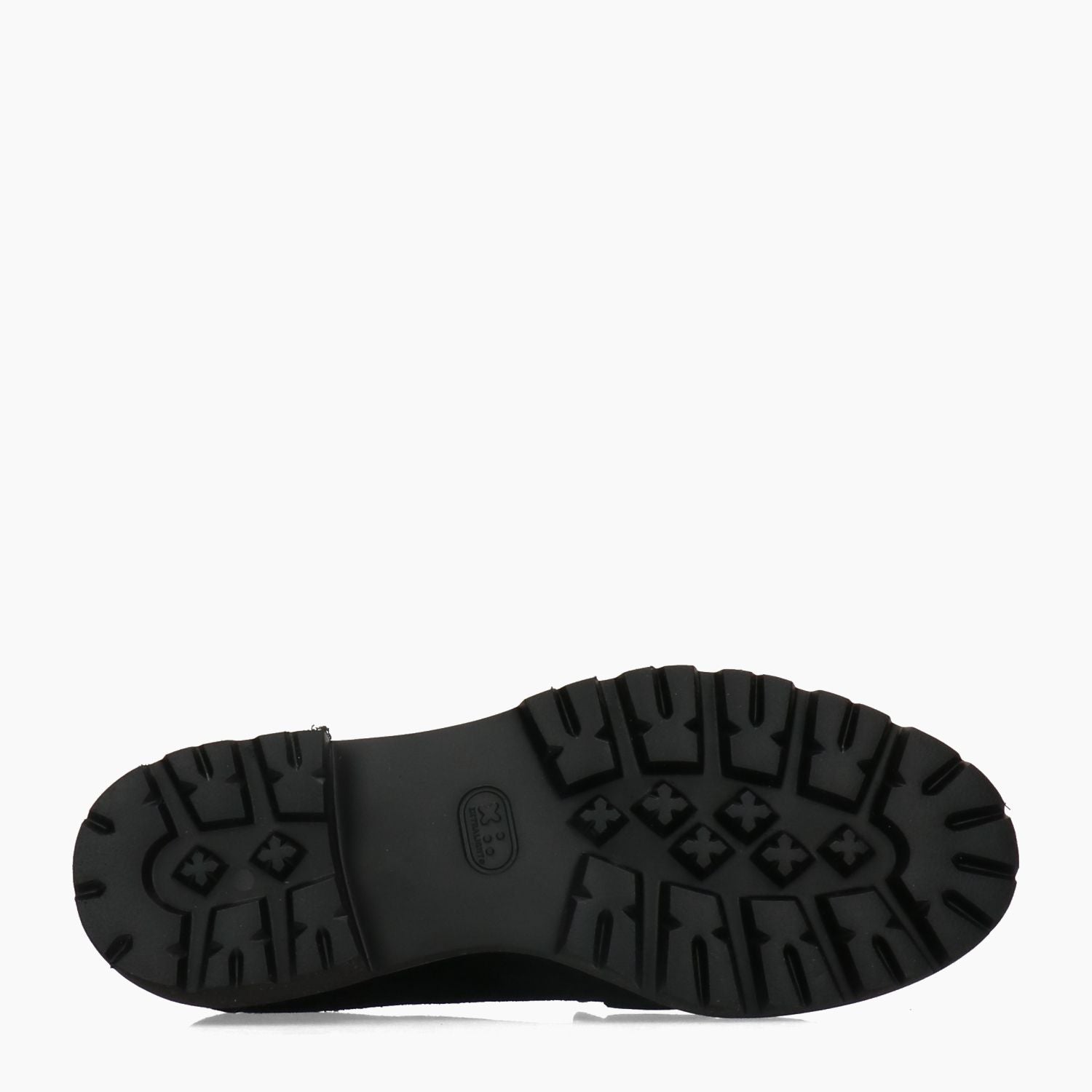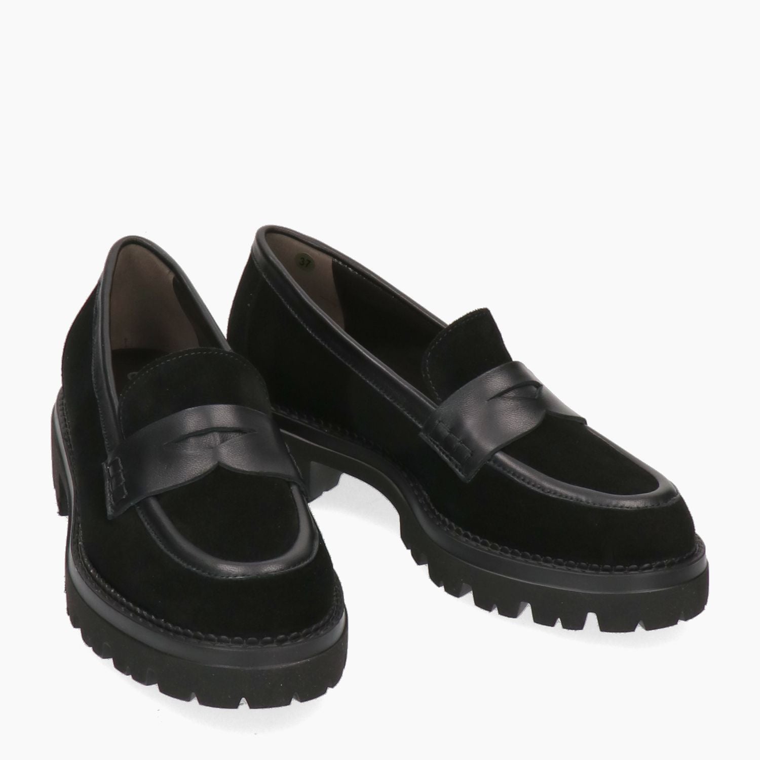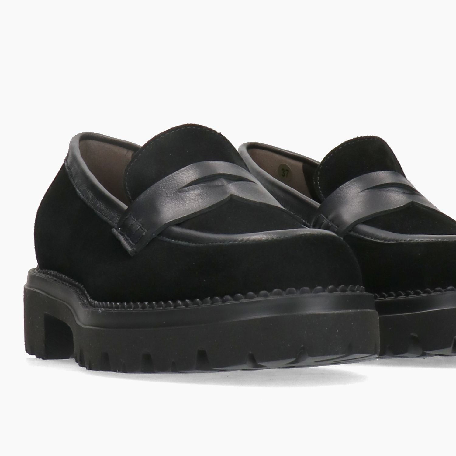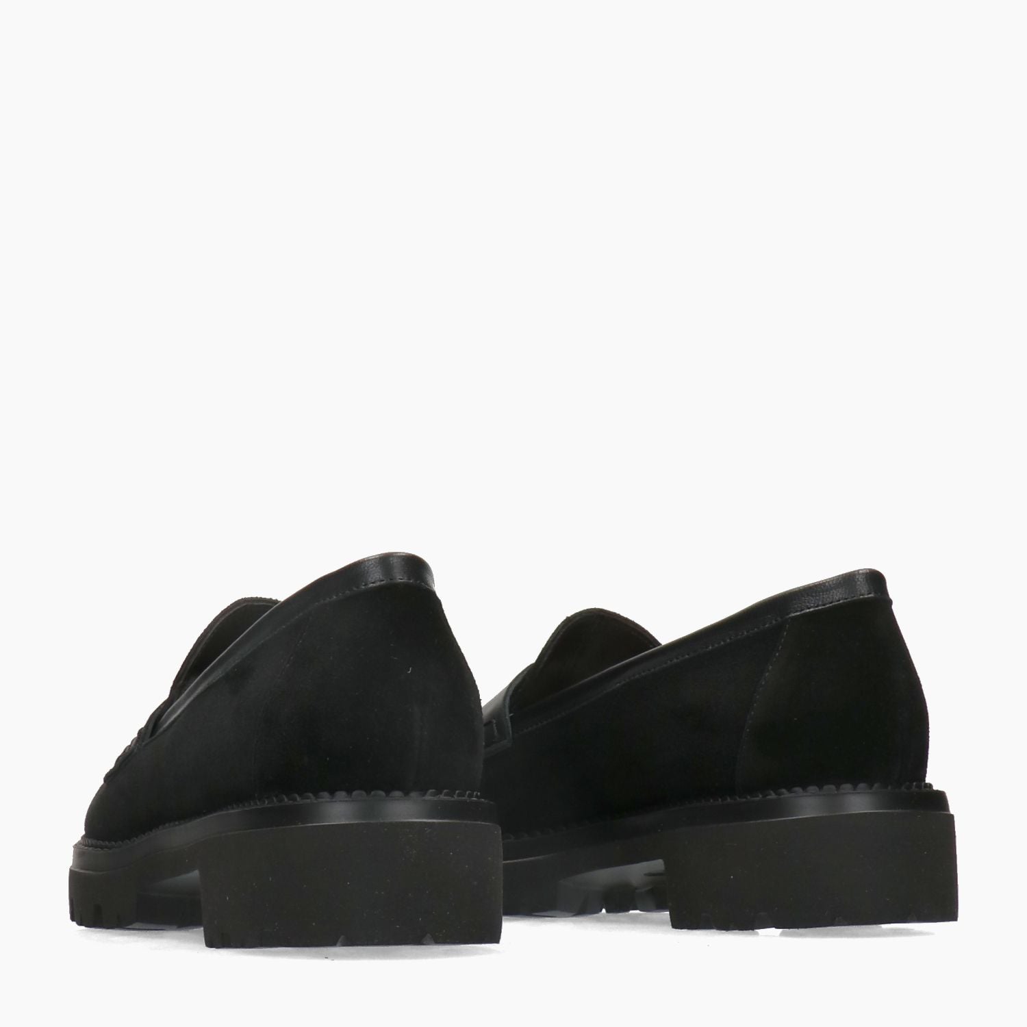 Wildledermokassins mit schwarzem Lederriemen und -besatz. Runde Zehenpartie. Lederfutter. 4 cm hohe, mikroporöse Gummisohle mit Profil. Cinzia Valle Damen-Herbst-/Winterkollektion.