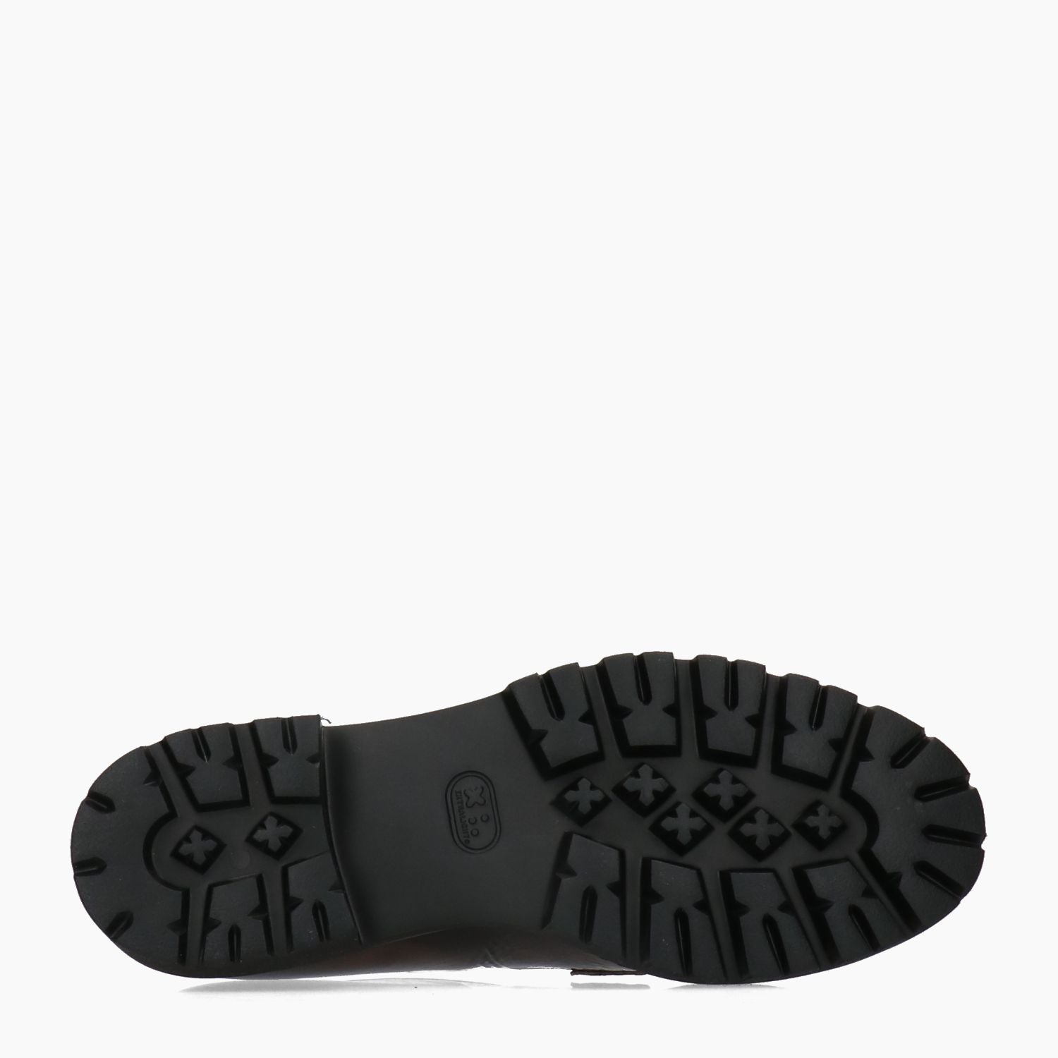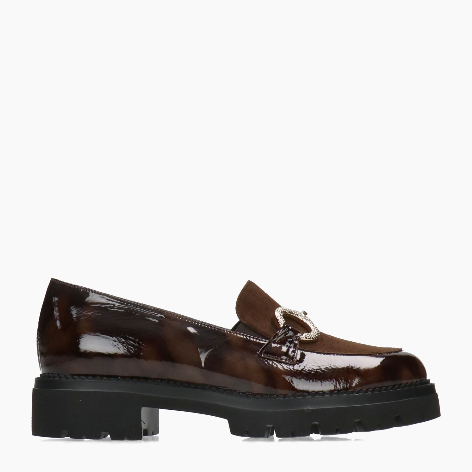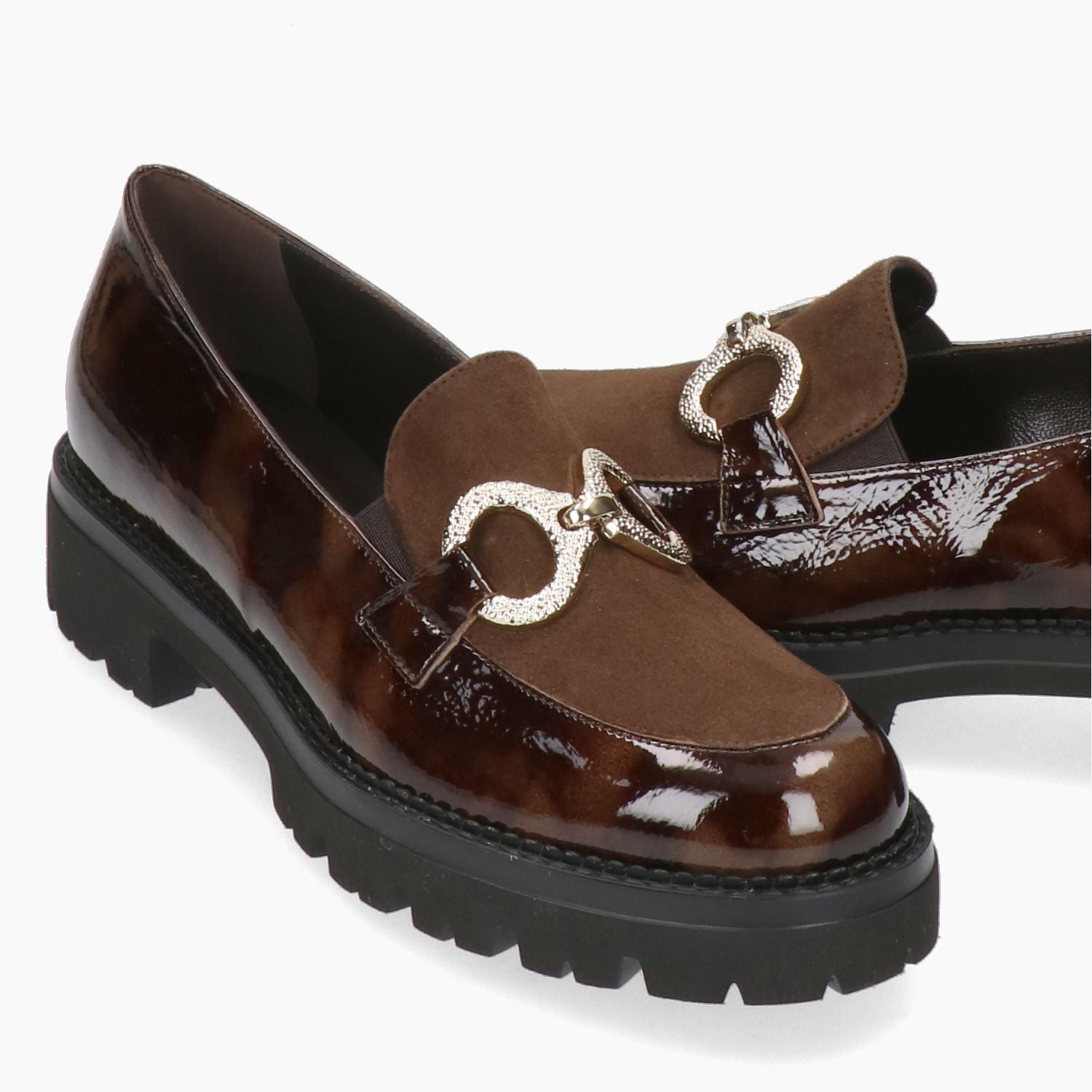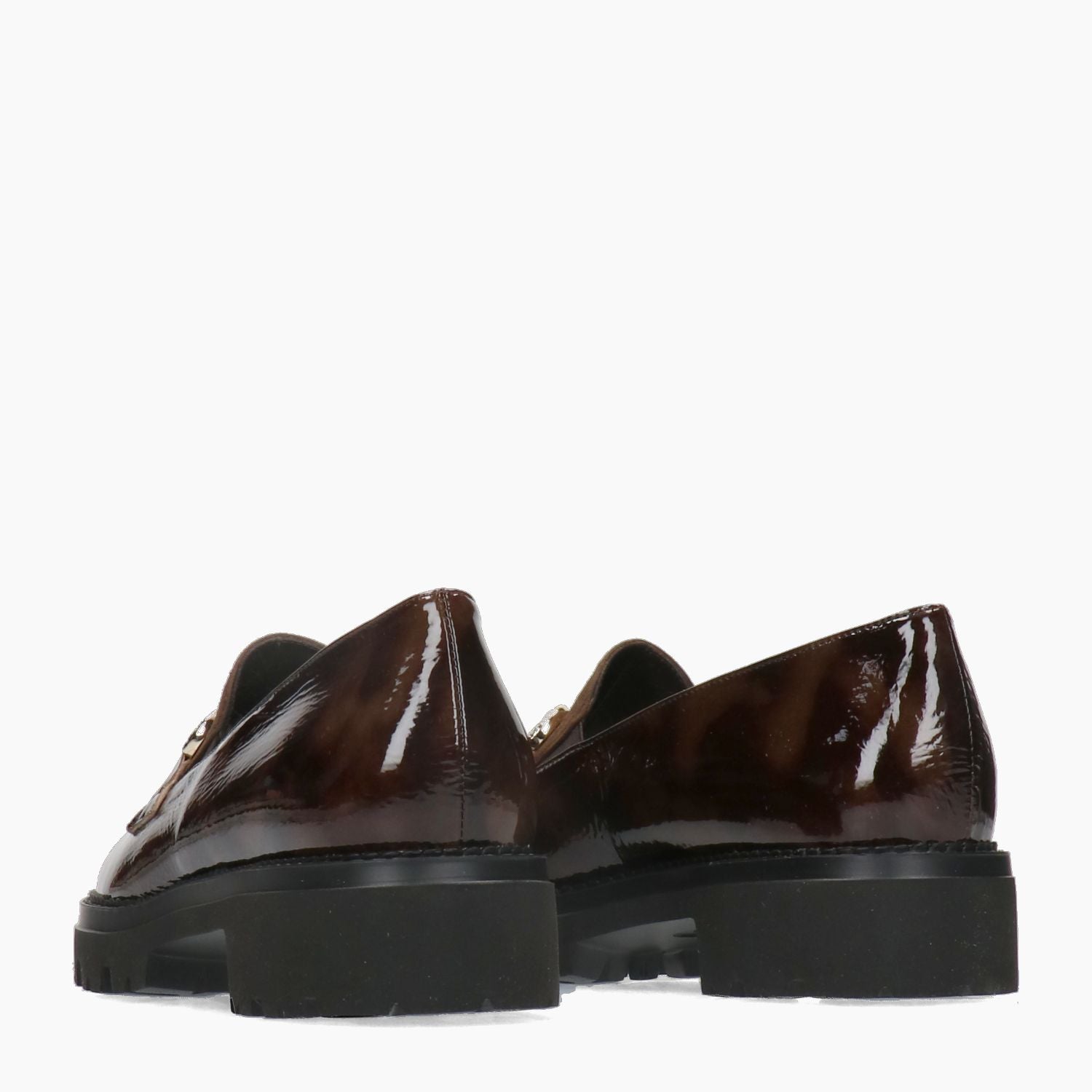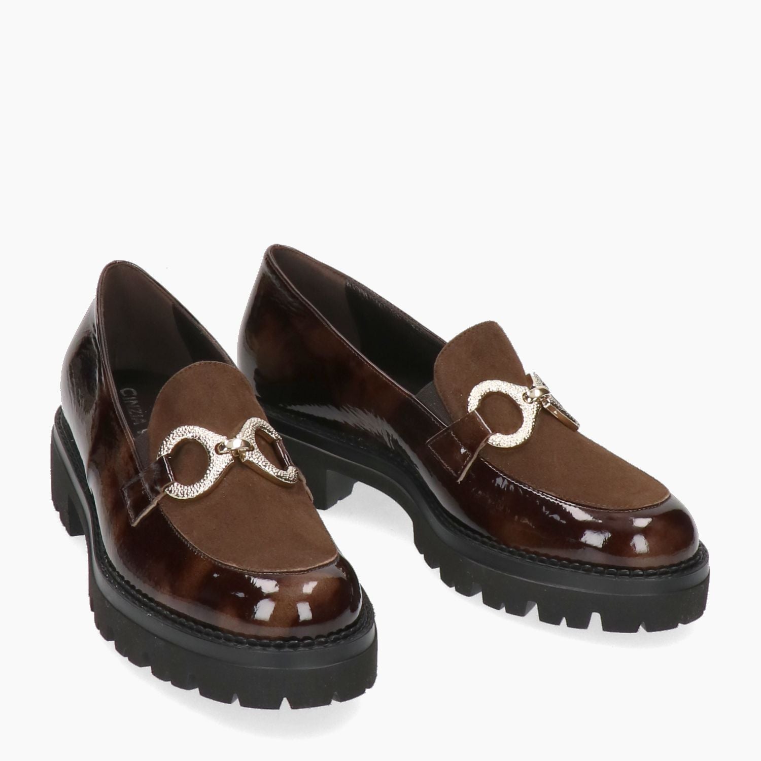 Braune Lackleder-Loafer mit goldfarbener Metallschnalle. Runde Zehenpartie. Lederfutter. 4 cm hohe, mikroporöse Gummisohle mit Profil. Cinzia Valle Damen-Herbst-/Winterkollektion.