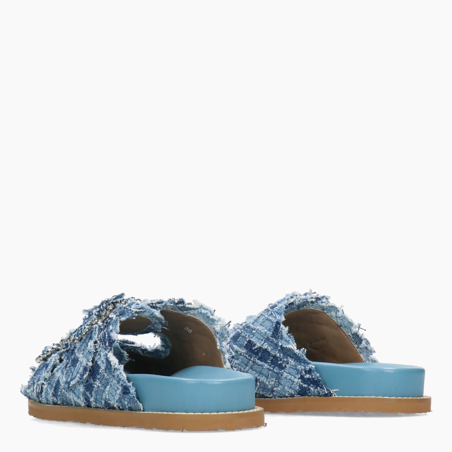 Hausschuhe aus gewebtem Denim. Verstellbare Doppelschnalle mit blauen Strasssteinen. Lederfutter mit passendem, lederbezogenem Fußbett. 3 cm hohe Gummisohle. Korallenblaue Frühjahr/Sommer-Kollektion.