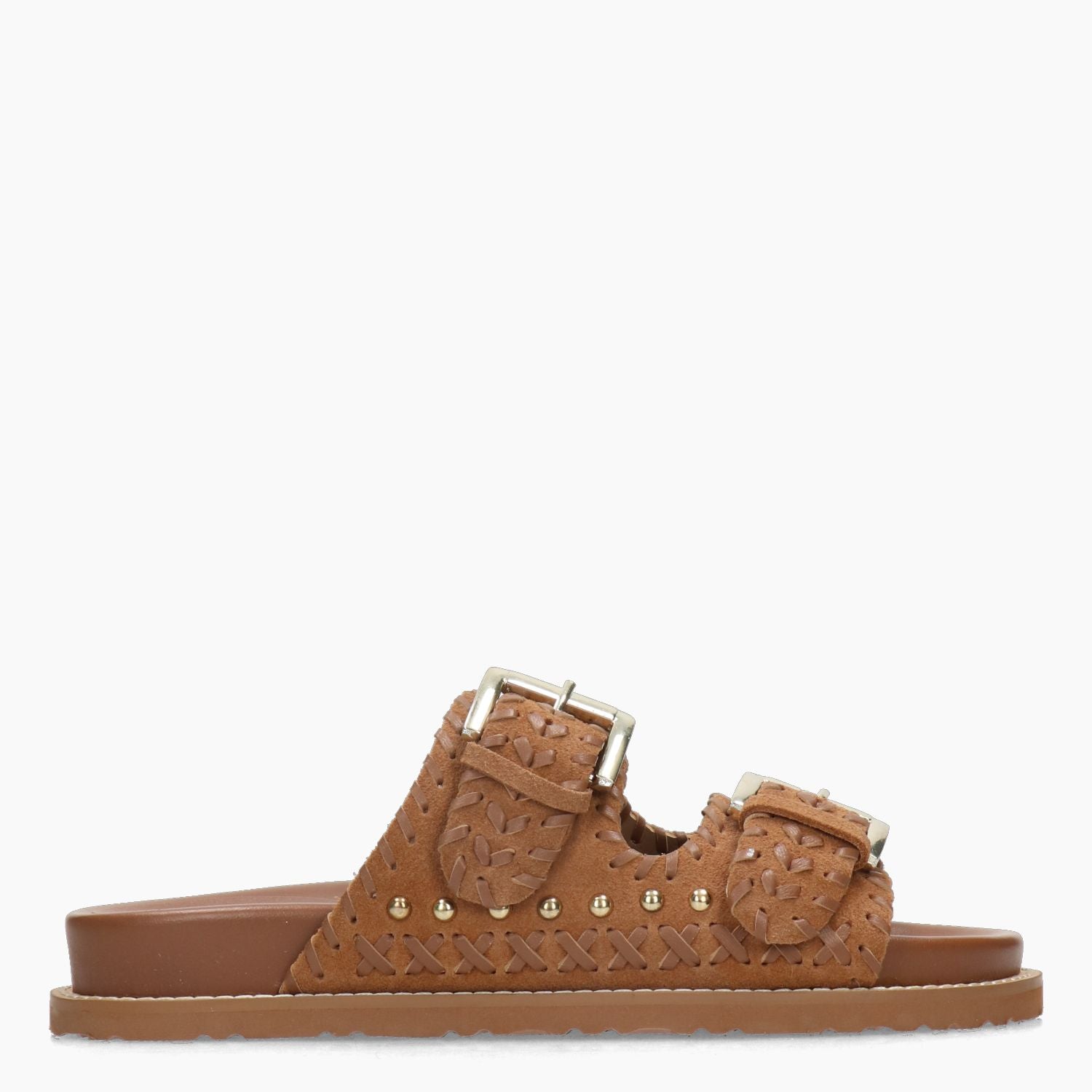 Hellbraune Wildlederpantoffeln mit farblich abgestimmten Ziernähten. Verstellbare Doppelschnalle in Goldoptik. Lederfutter mit farblich passendem, lederbezogenem Fußbett. 3 cm hohe Gummisohle. Korallenblaue Frühjahr/Sommer-Kollektion.