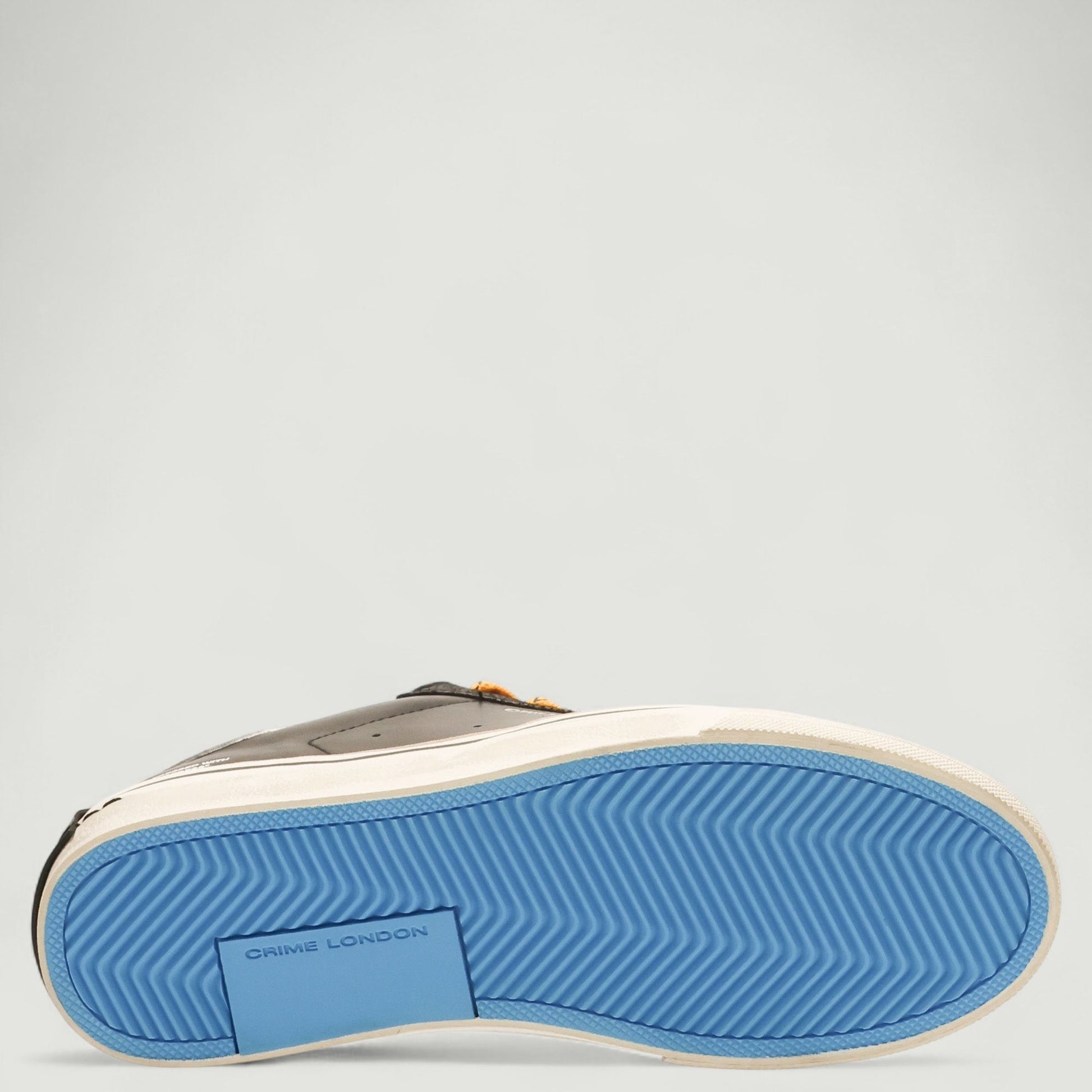 Sneaker mit schwarzem Leder-Obermaterial und Einsätzen aus schwarzem Wildleder. Verschluss mit ockergelben Baumwollschnürsenkeln mit Schriftzug und zusätzlichen grauen Baumwollschnürsenkeln. Logo auf der Zunge. Logo auf der Fersenlasche. Textilfutter mit herausnehmbarer Lederinnensohle. Gummisohle. Aus der Herrenkollektion von Crime London.
