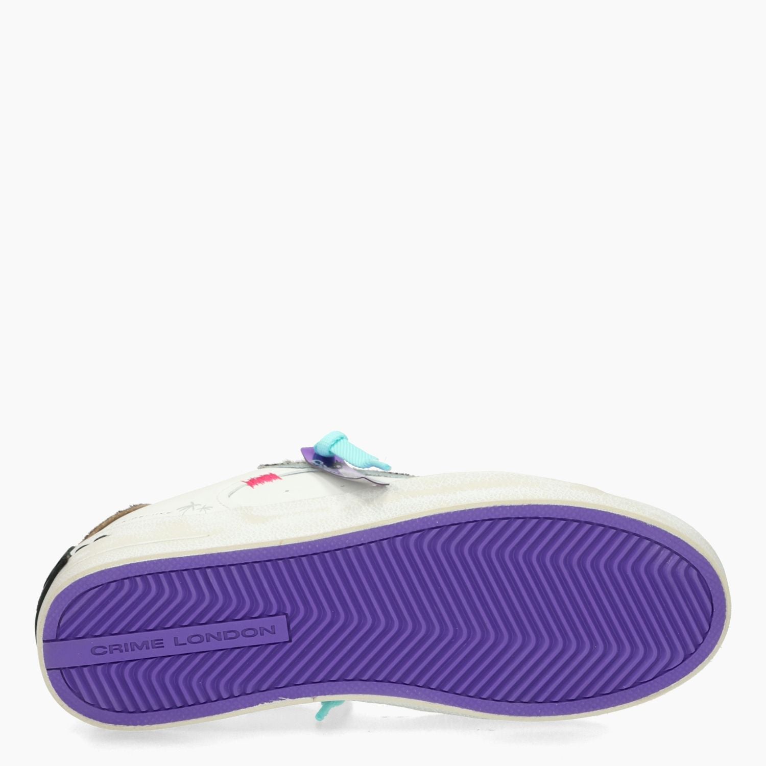Crime London Sneaker mit silbernem Glitzer und weißem Leder-Obermaterial mit Besatz aus Zebra-Ponyfell. Fersenbereich aus gepunktetem Ponyfell. Logo-Zunge. Weiße oder aquamarinfarbene Baumwollschnürsenkel. Futter aus Textil und Leder. 3 cm hohe Gummisohle. Crime London Damenkollektion.