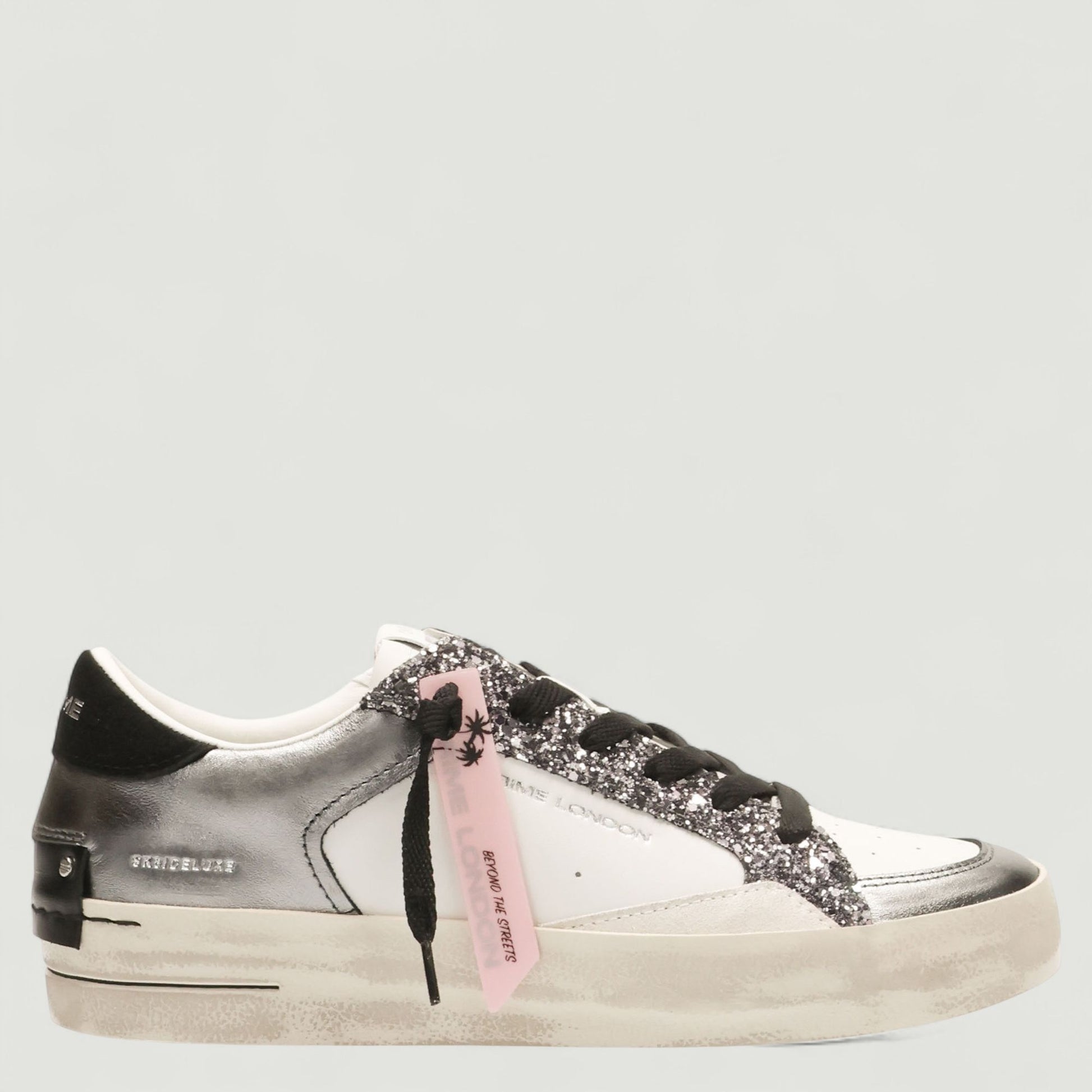 Sneaker mit weißem Leder-Obermaterial und Einsätzen aus anthrazitfarbenem Laminatleder. Schwarze Wildleder-Ferse. Logo-Zunge. Schwarze Baumwollschnürsenkel. Textilfutter mit herausnehmbarer Lederinnensohle. 3 cm hohe Gummisohle. Aus der Crime London Damenkollektion.
