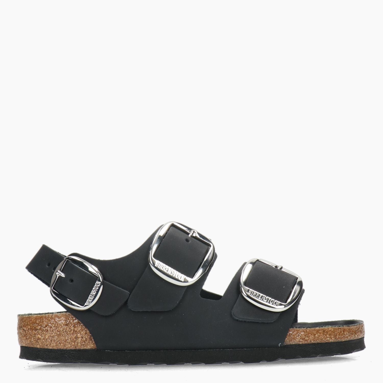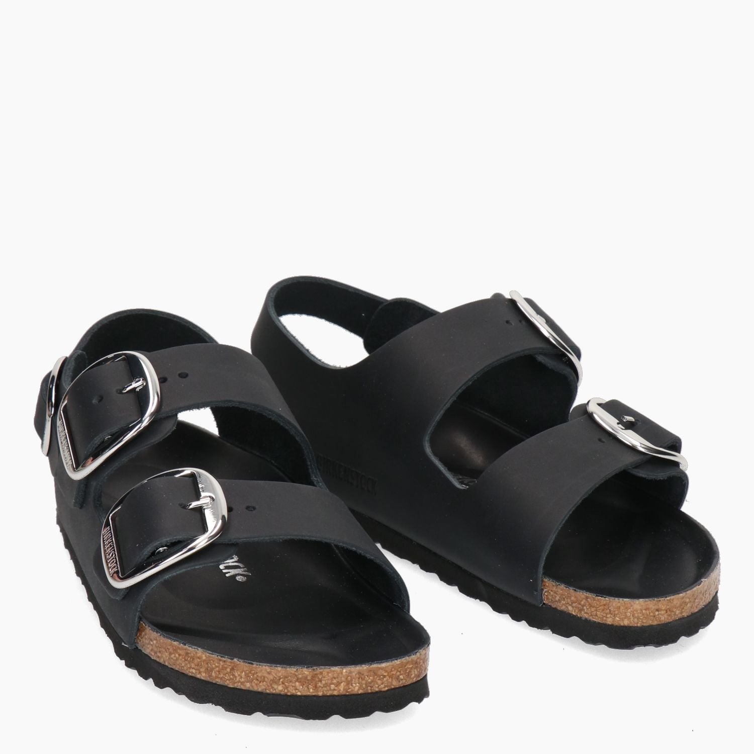 Schwarze Milano-Ledersandale. Große silberne Doppelschnalle mit Logo. Lederfutter. Korksohle mit Gummiprofil. Schmale Passform. Birkenstock Damenkollektion.