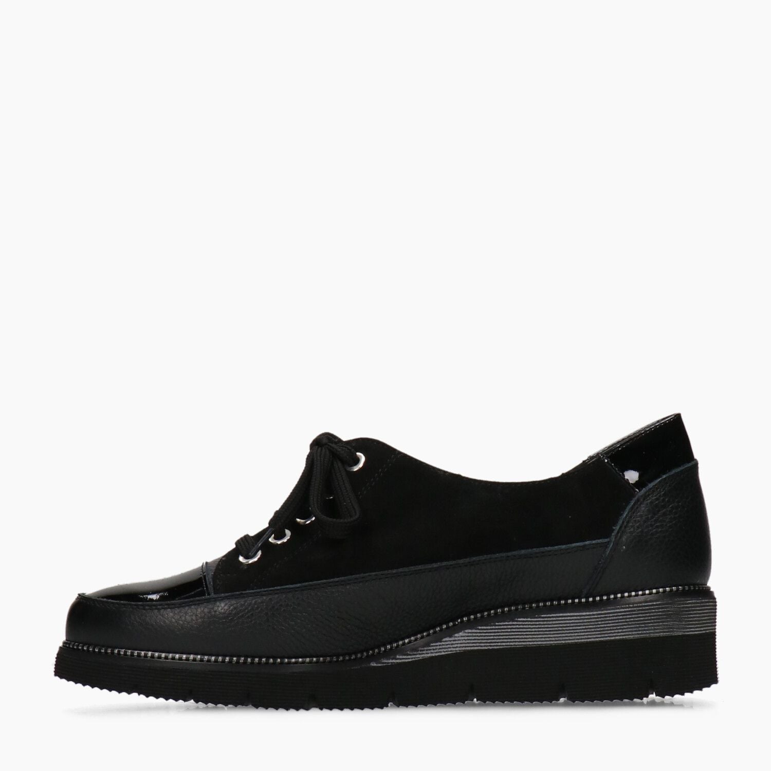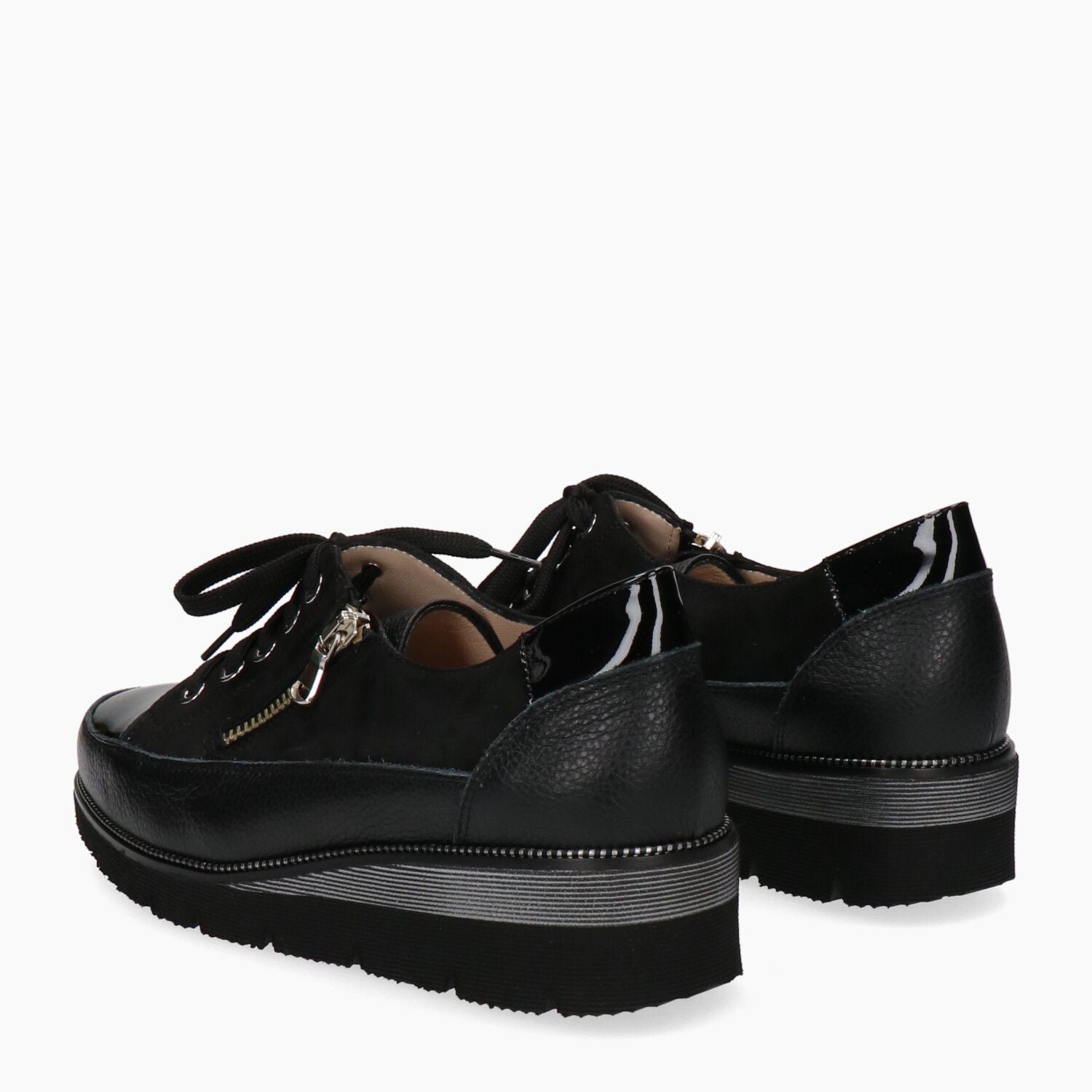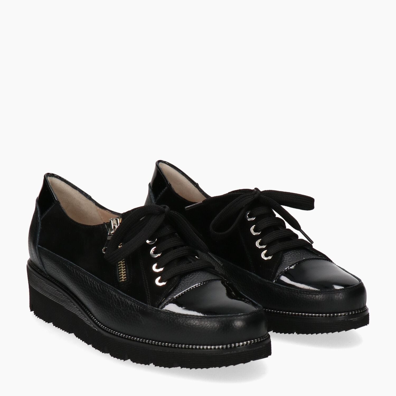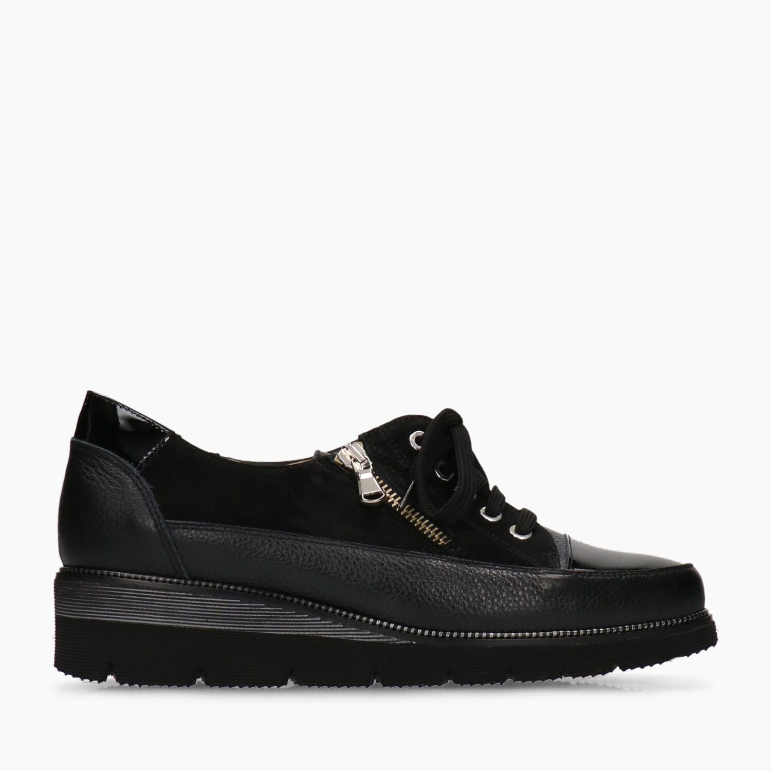 Keilsneaker. Obermaterial aus schwarzem Leder und Veloursleder. Zehenkappe aus schwarzem Lackleder. Beiges Lederfutter. Schnürung und seitlicher Reißverschluss. Schwarze und graue, mikroporöse Gummisohle. 4 cm hoher Keilabsatz. Duca di Rialto Damen Herbst/Winter Kollektion.