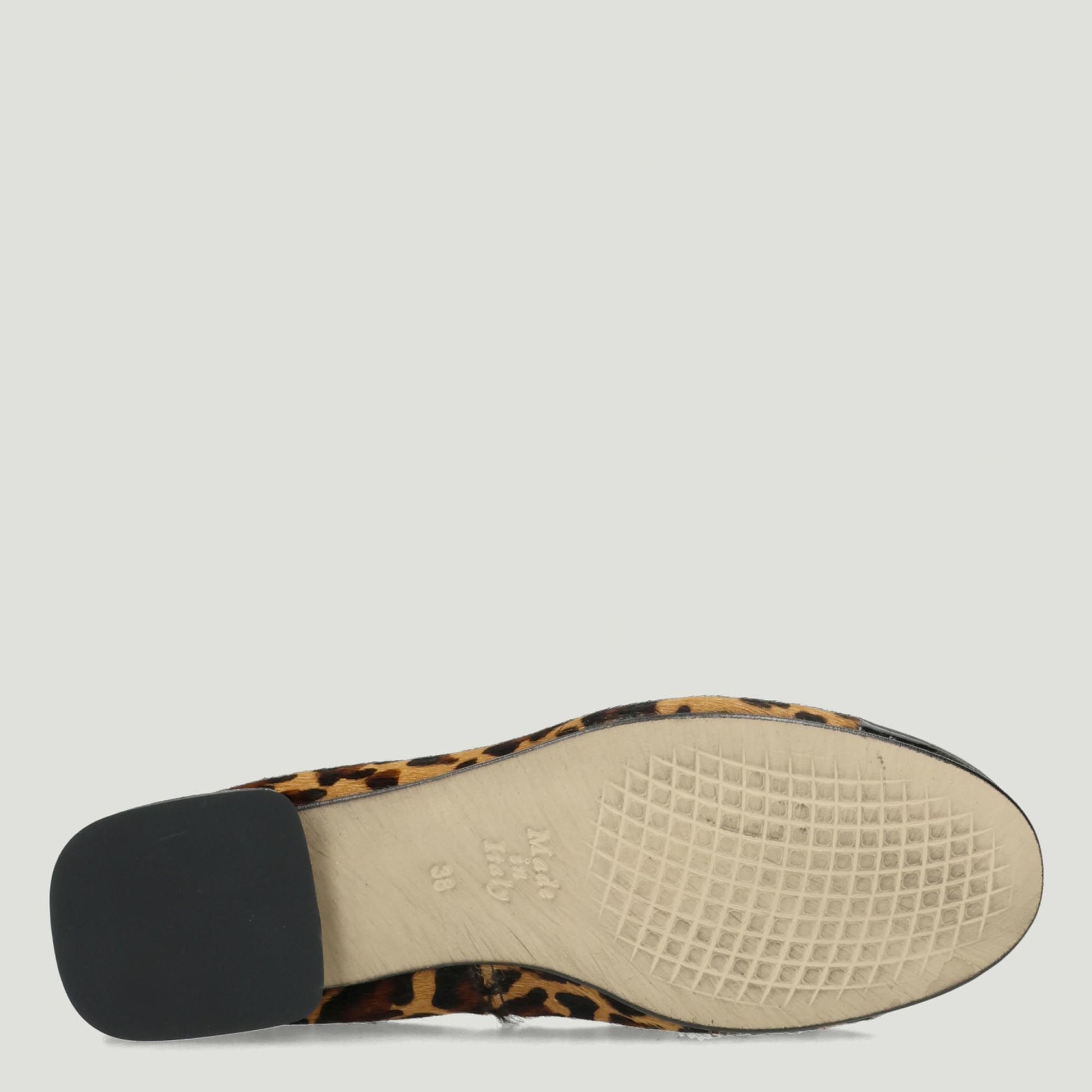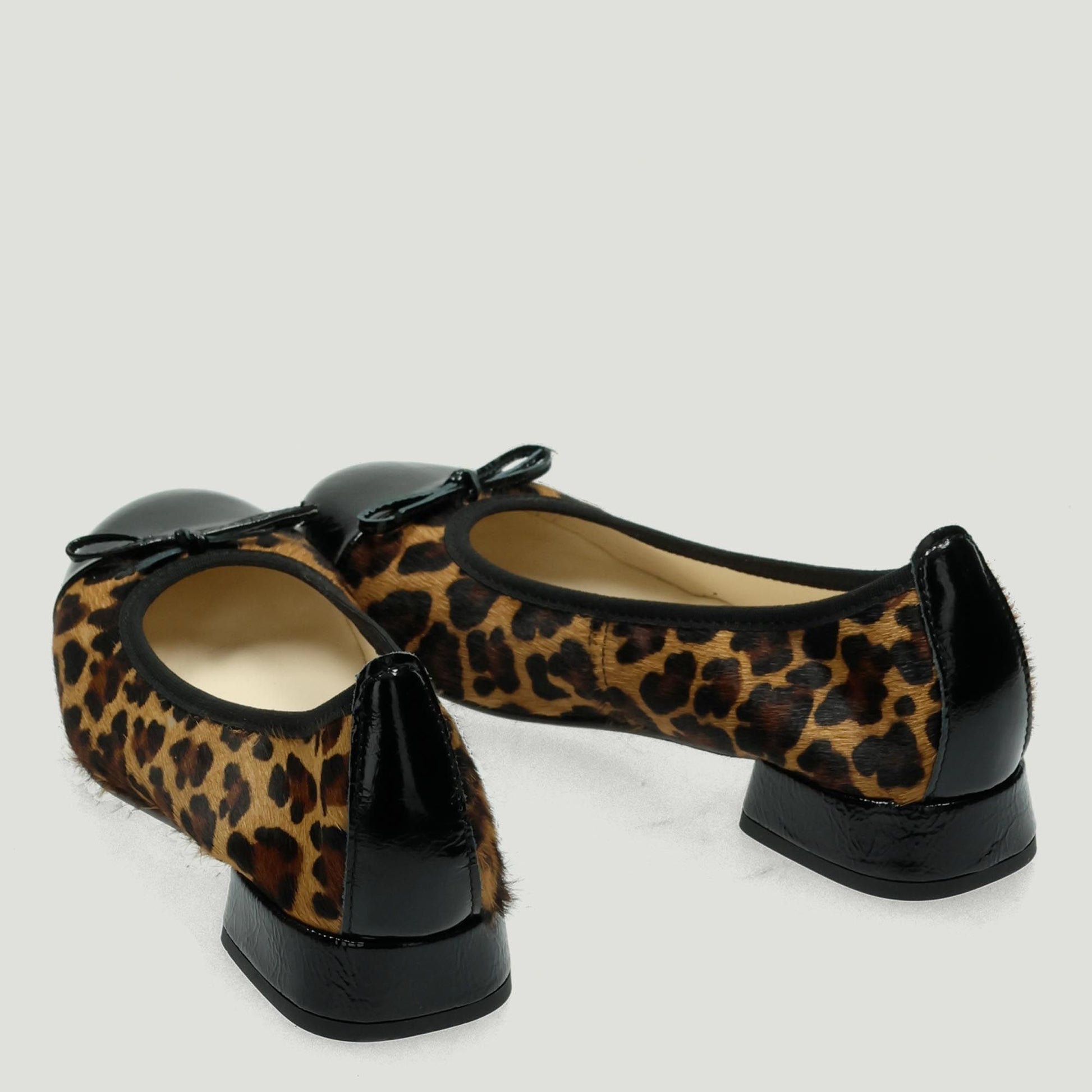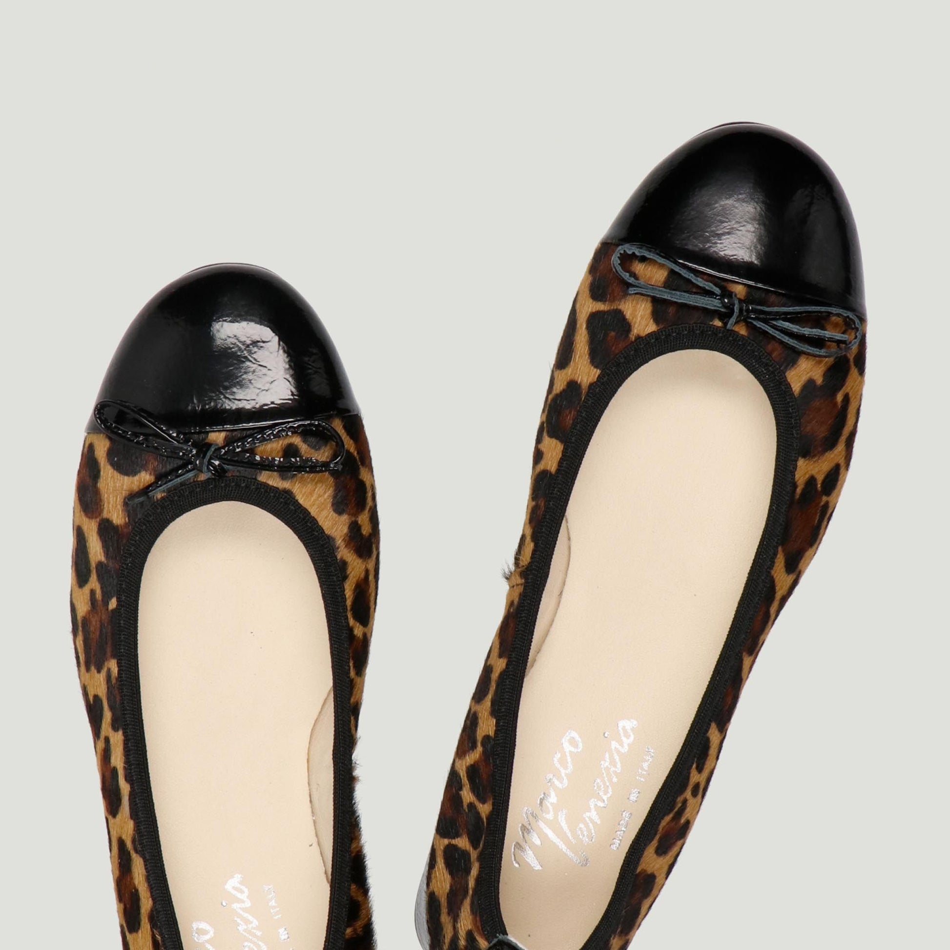 Ballerinas aus gepunktetem Ponyfell mit schwarzer Lackleder-Zehenkappe und Schleife. Elastischer Bund. Lederfutter. Gummisohle mit 2,5 cm Absatz. Marco Venexia Damen-Herbst-/Winterkollektion.