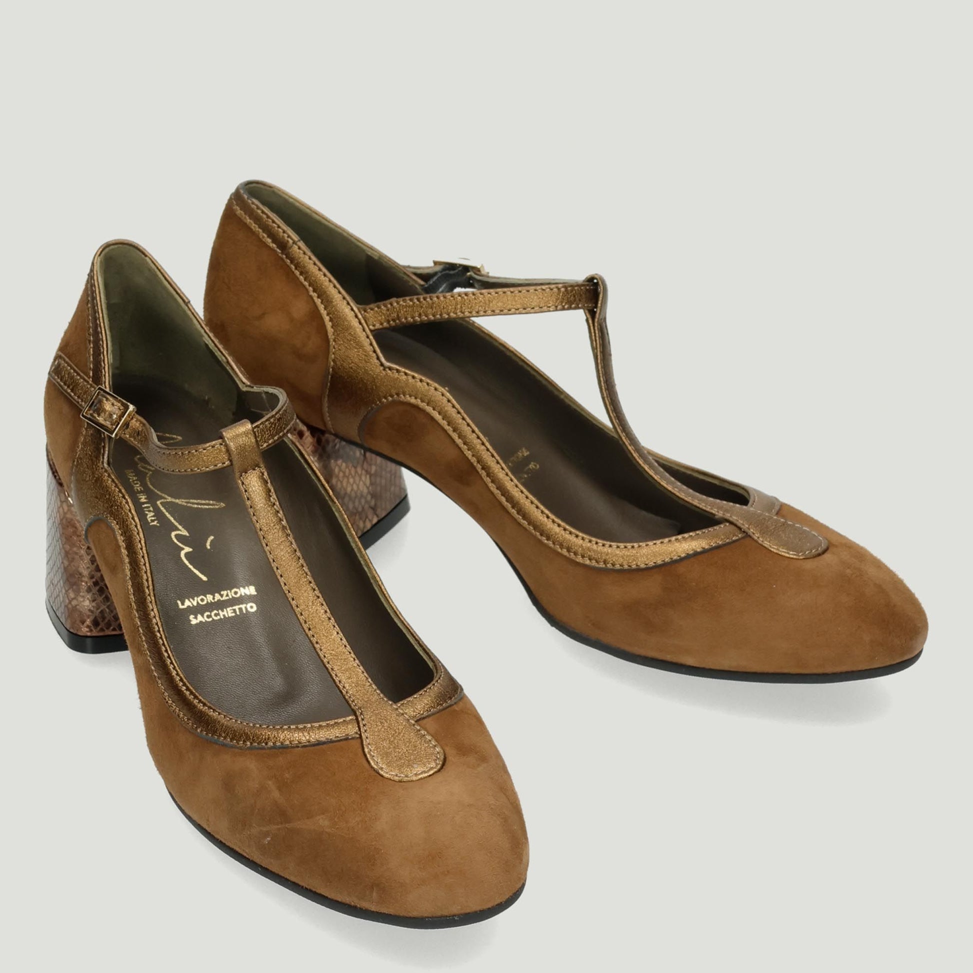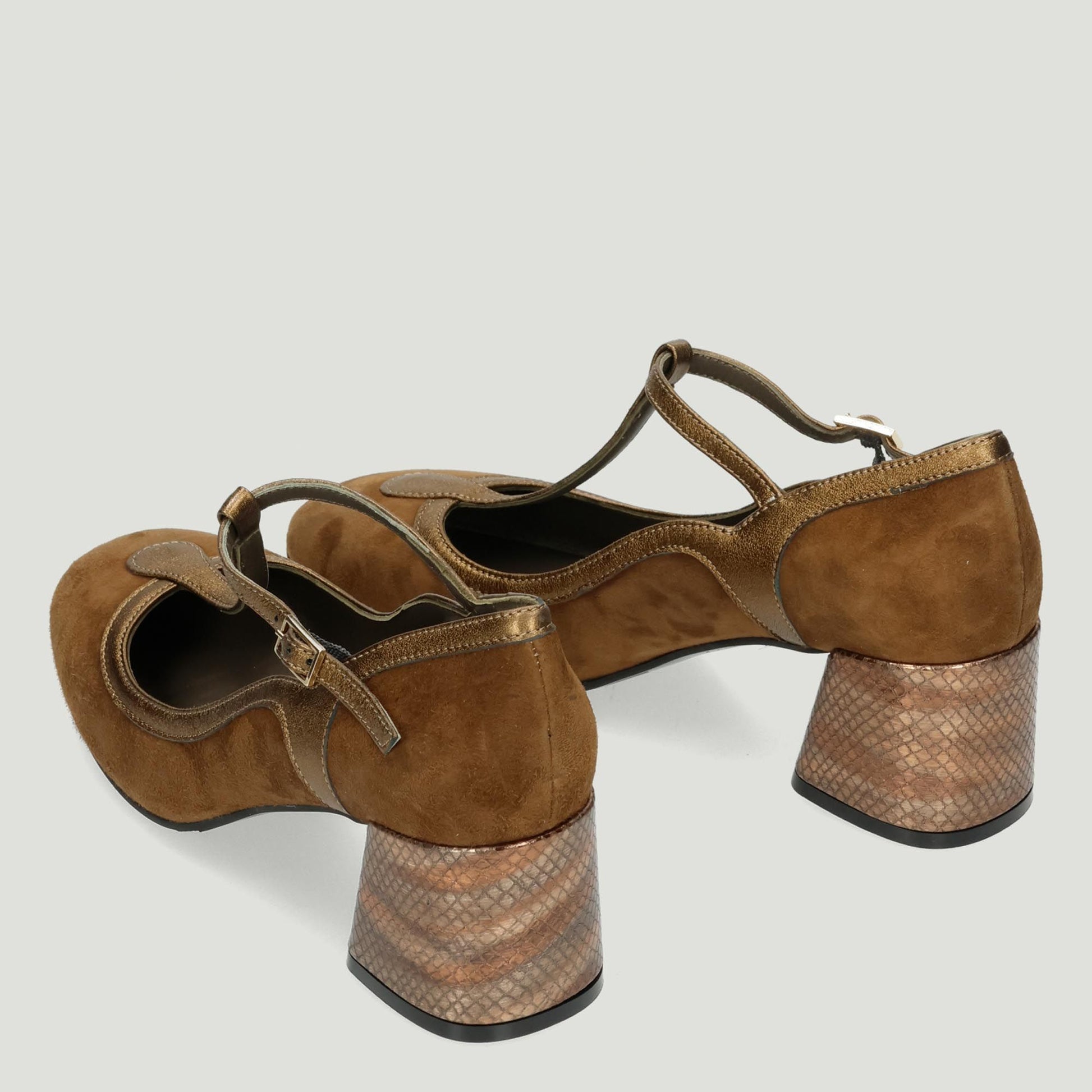 Brandyfarbene Wildleder-Pumps mit T-Riemen und bronzefarbenem Lederbesatz. Innenfutter aus Leder im Satchel-Stil. Gummisohle mit 5 cm Absatz. Malu Damen-Herbst-/Winterkollektion.