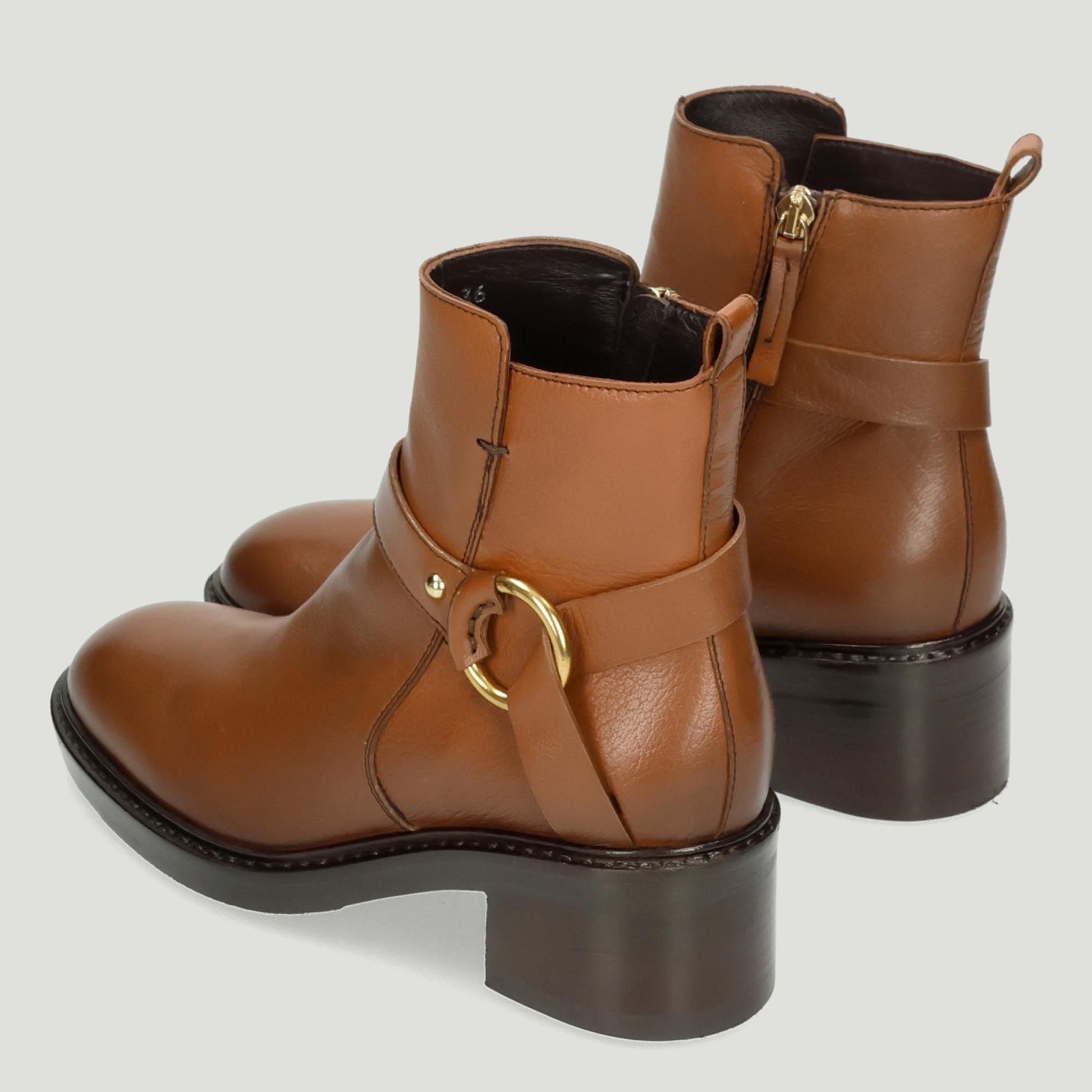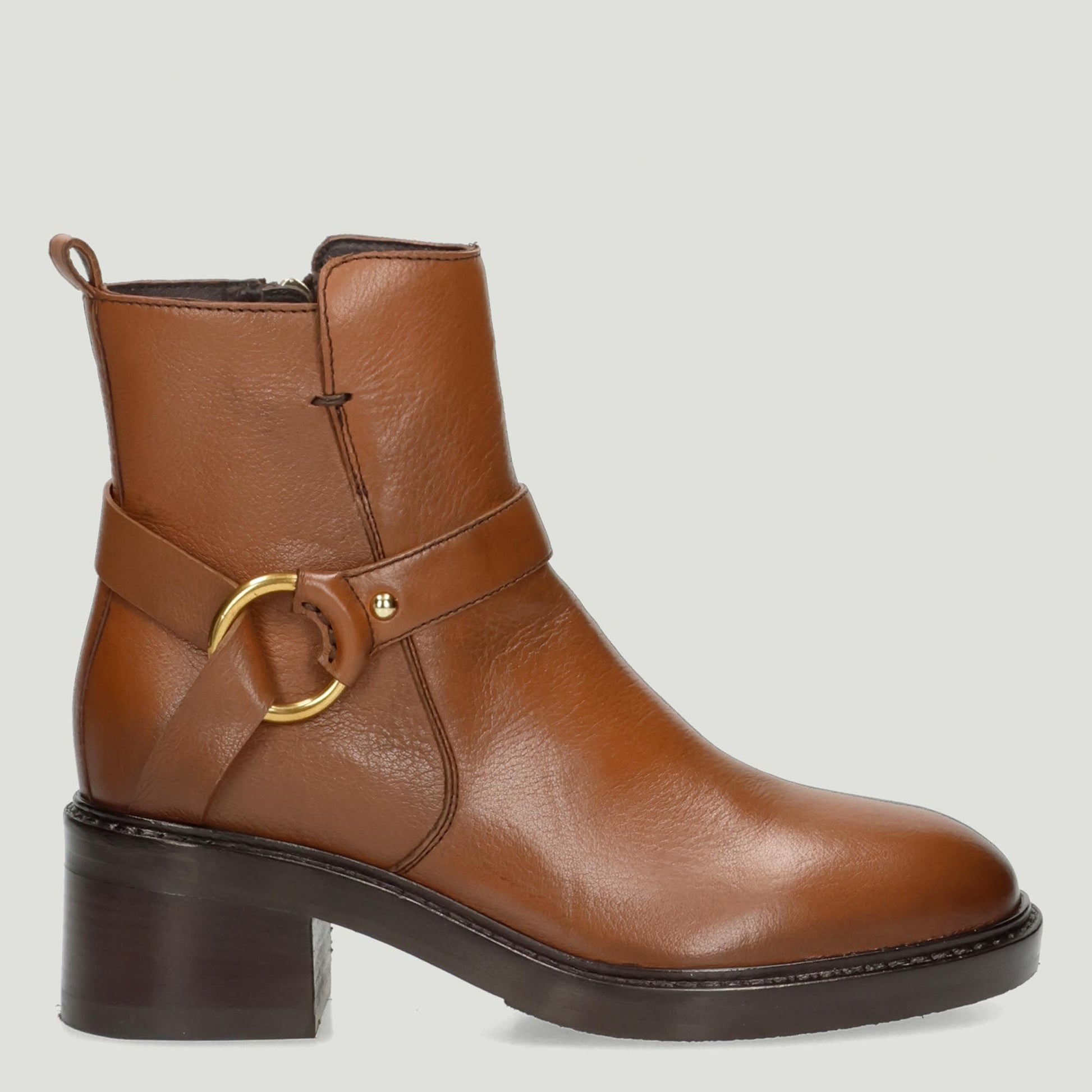 Stiefelette aus hellbraunem Leder mit Riemen und festem Goldring. Lederfutter. Gummisohle mit 5 cm Absatz. Triver Flight Damen-Herbst-/Winterkollektion.