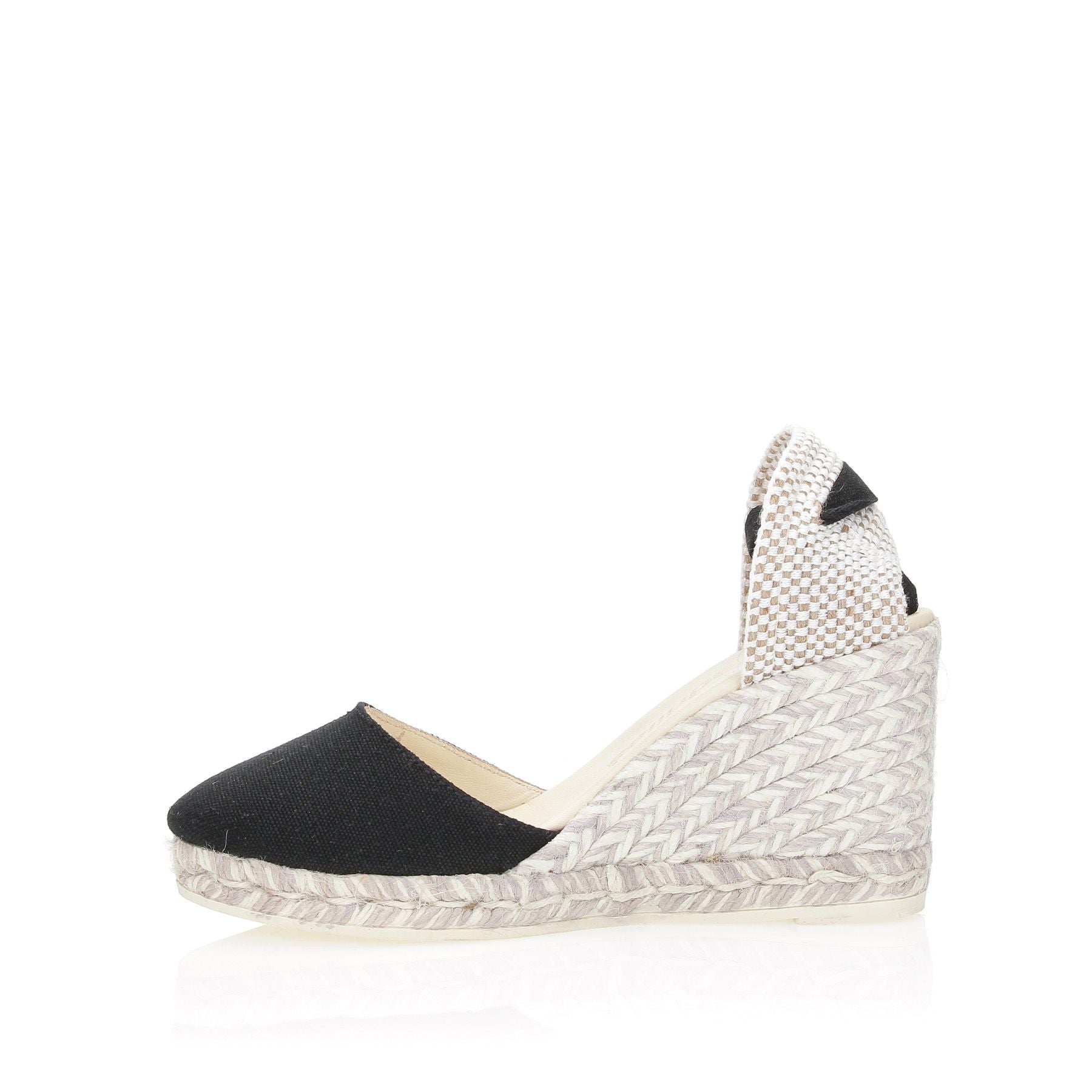 Espadrilles mit schwarzem Canvas-Obermaterial. Runde Zehenpartie. Schnürverschluss am Knöchel. Futter aus Textil und Leder. Gummisohle. 9 cm hoher Keilabsatz. Damen-Espadrilles-Kollektion Frühjahr/Sommer.