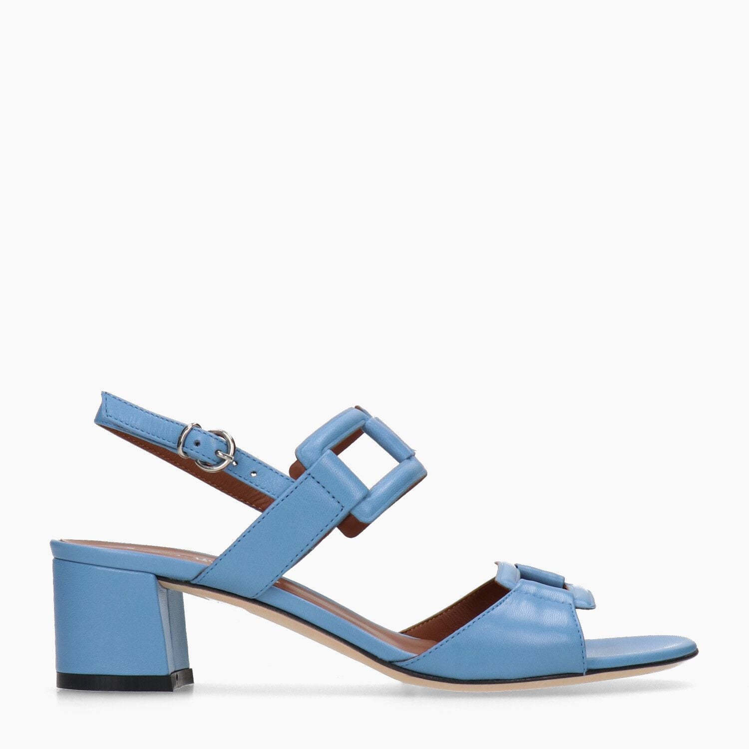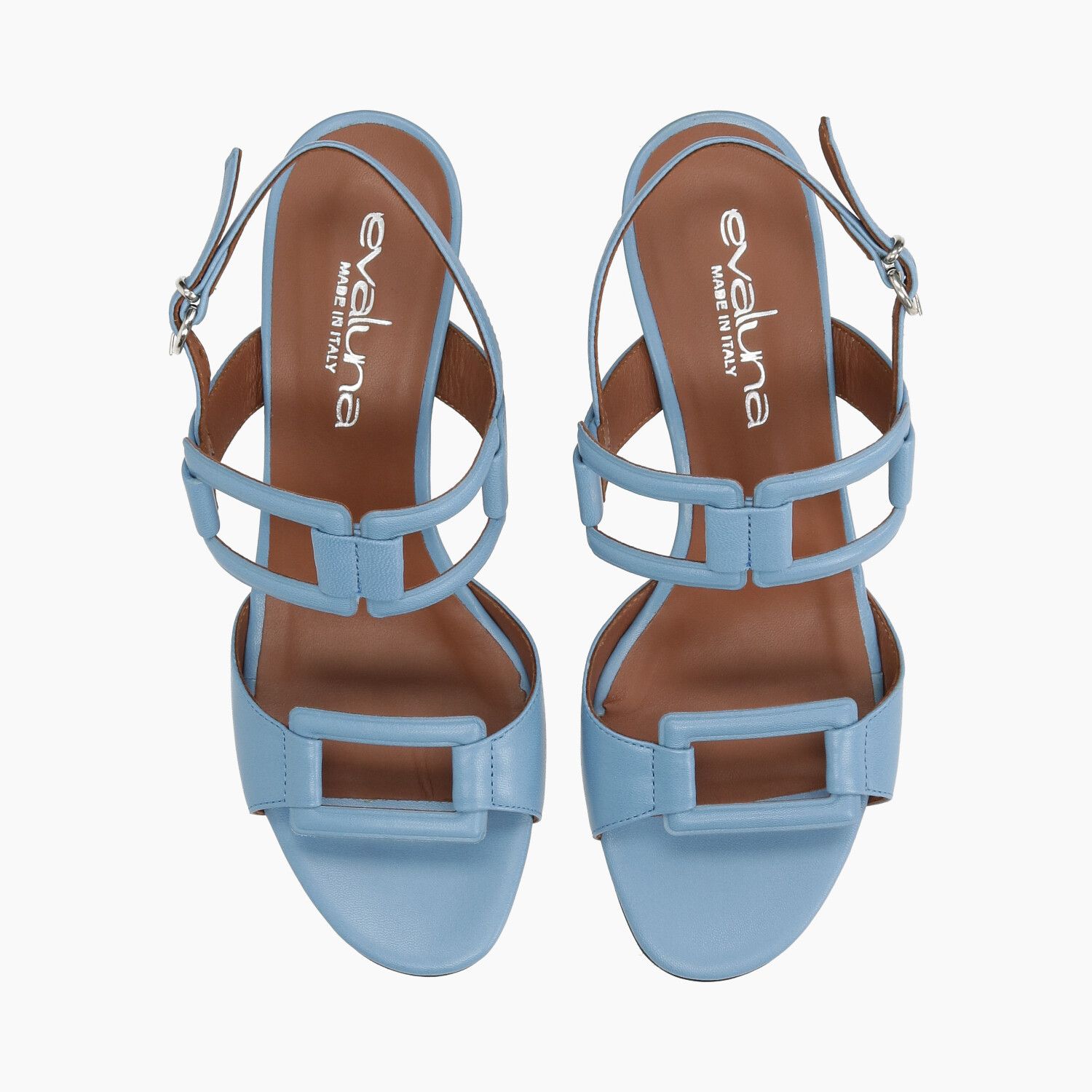 Hellblaue Ledersandalen mit rechteckigem Muster, Ledersohle.