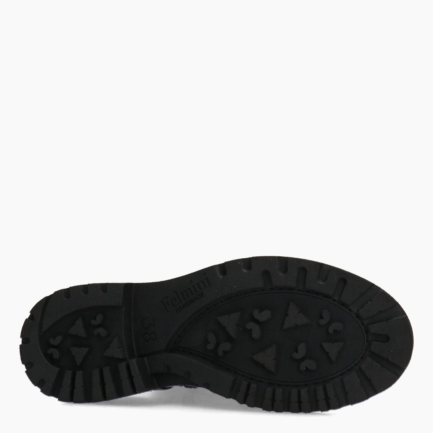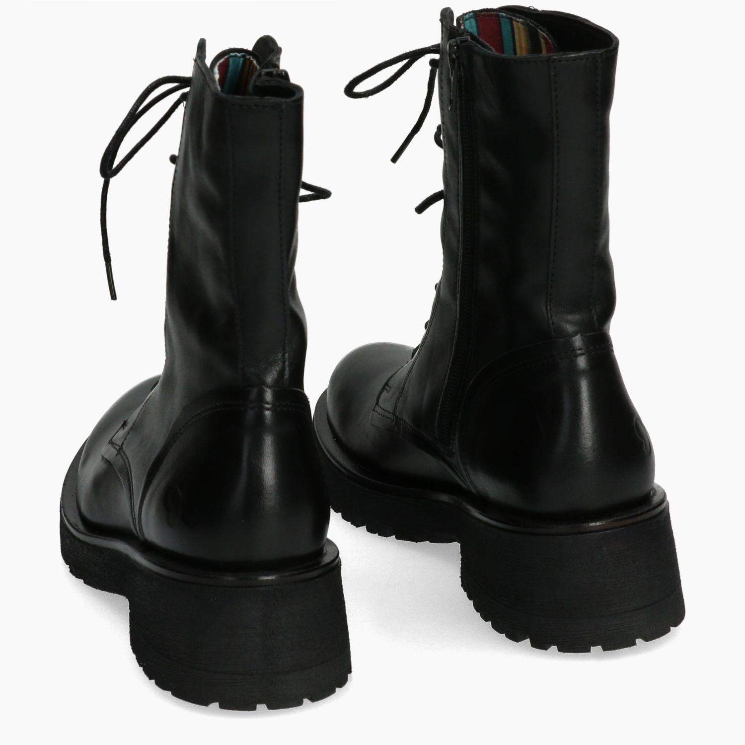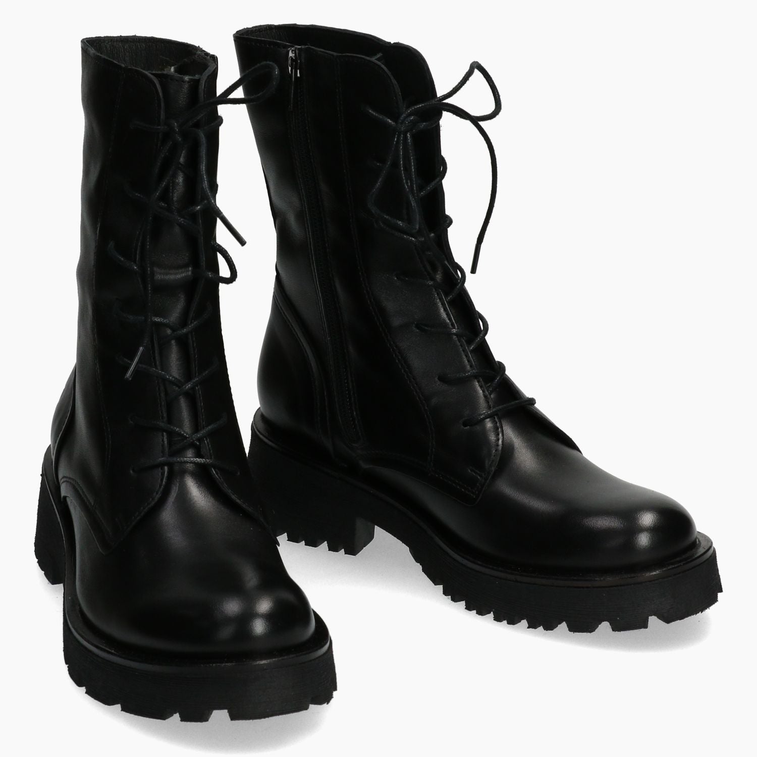 Schwarzer Leder-Combat-Boot. Seitlicher Reißverschluss und farblich abgestimmte Schnürsenkel. Futter aus Leder und Textil. Feste Innensohle. Gummisohle mit 4,5 cm Absatz. Felmini Damen Herbst/Winter Kollektion.