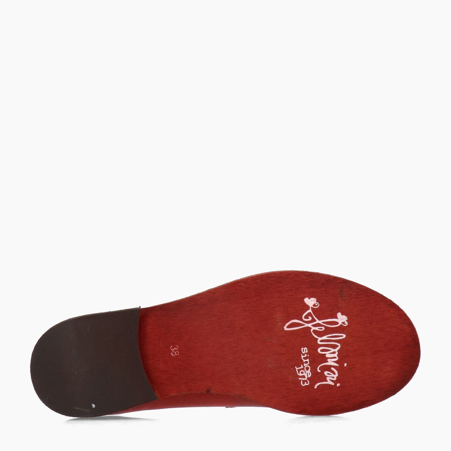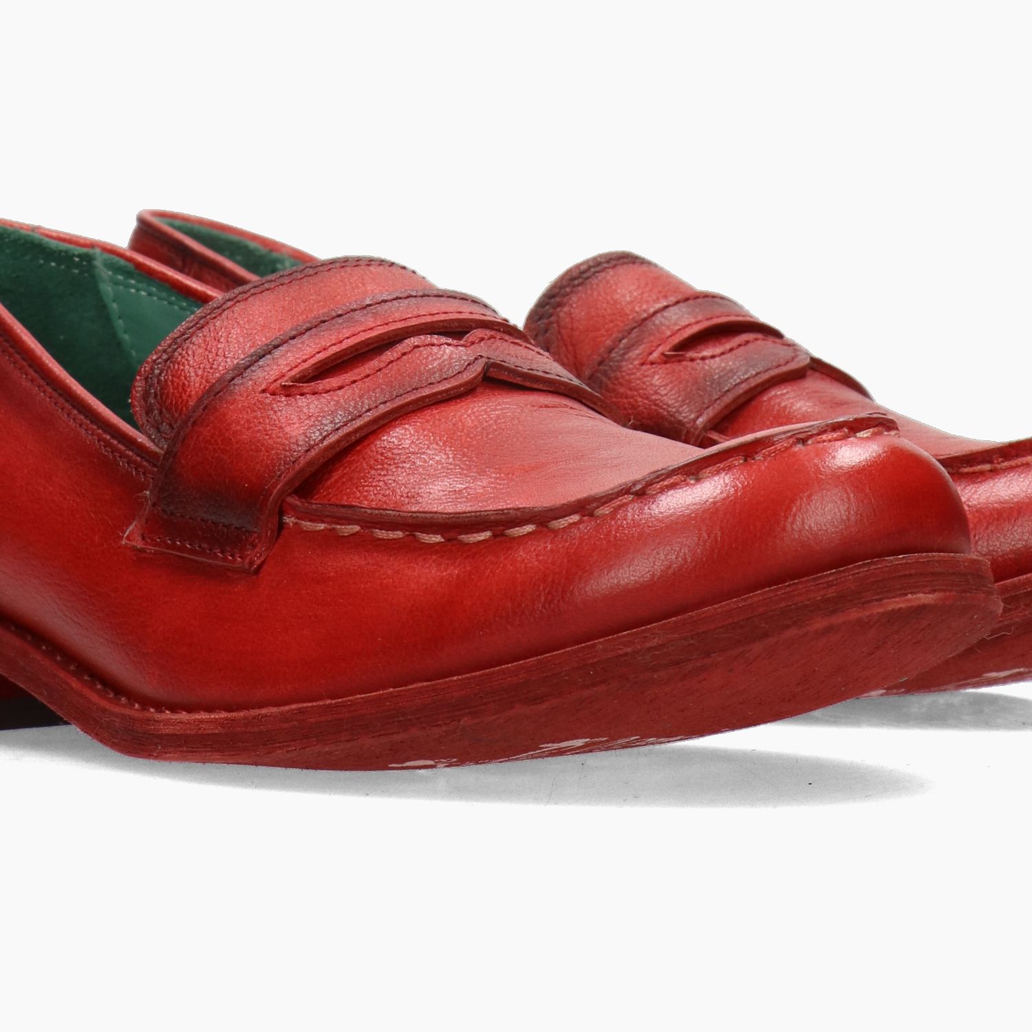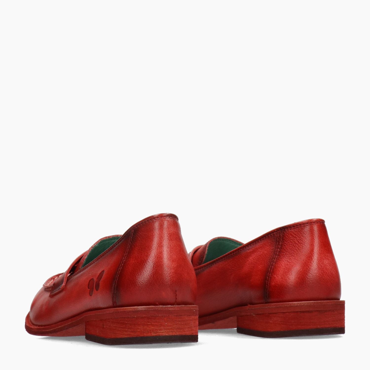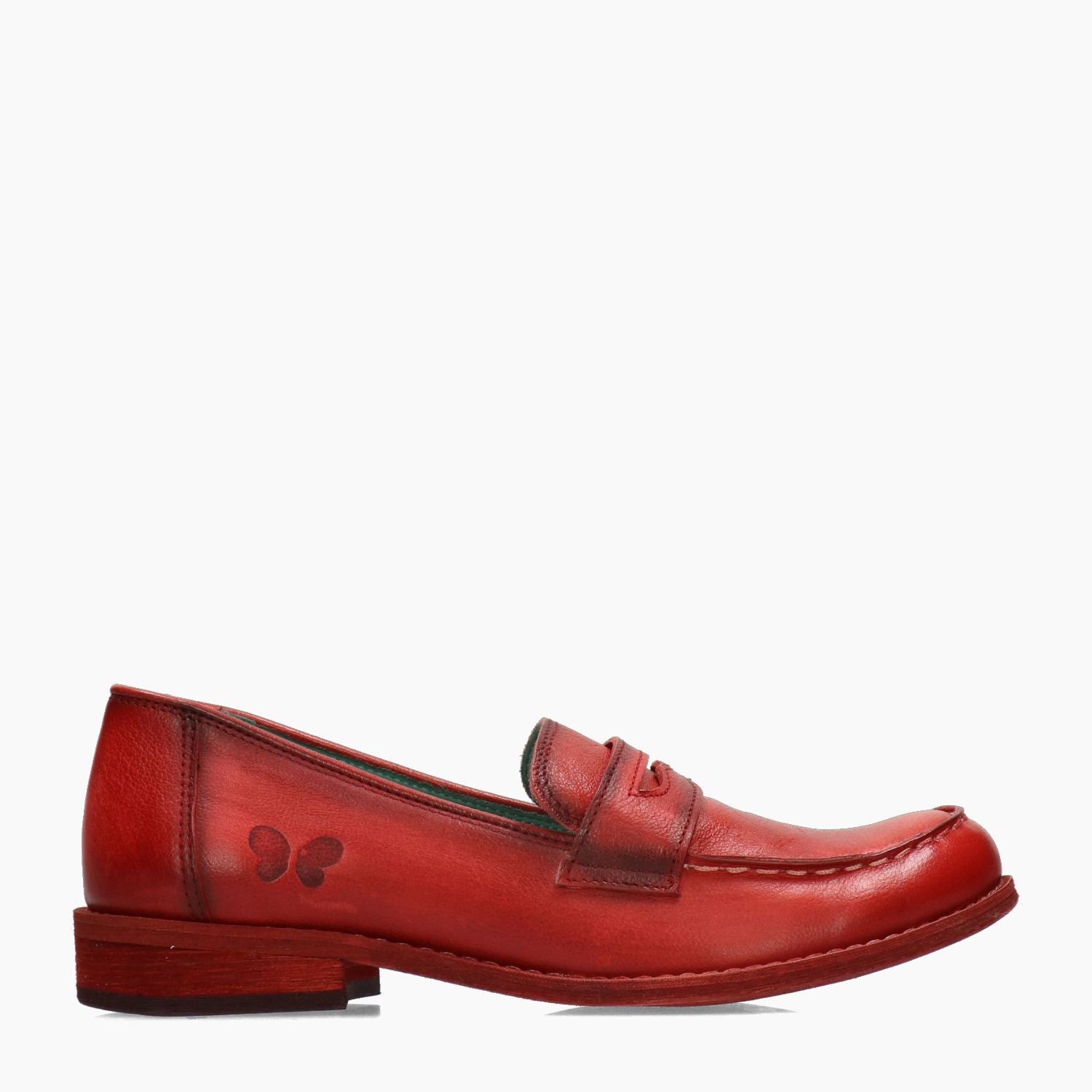 Felmini-Loafer mit rotem Obermaterial aus Used-Leder. Runde Zehenpartie. Lederfutter. Gummisohle. 2 cm Sohlenhöhe. Felmini Damenkollektion.