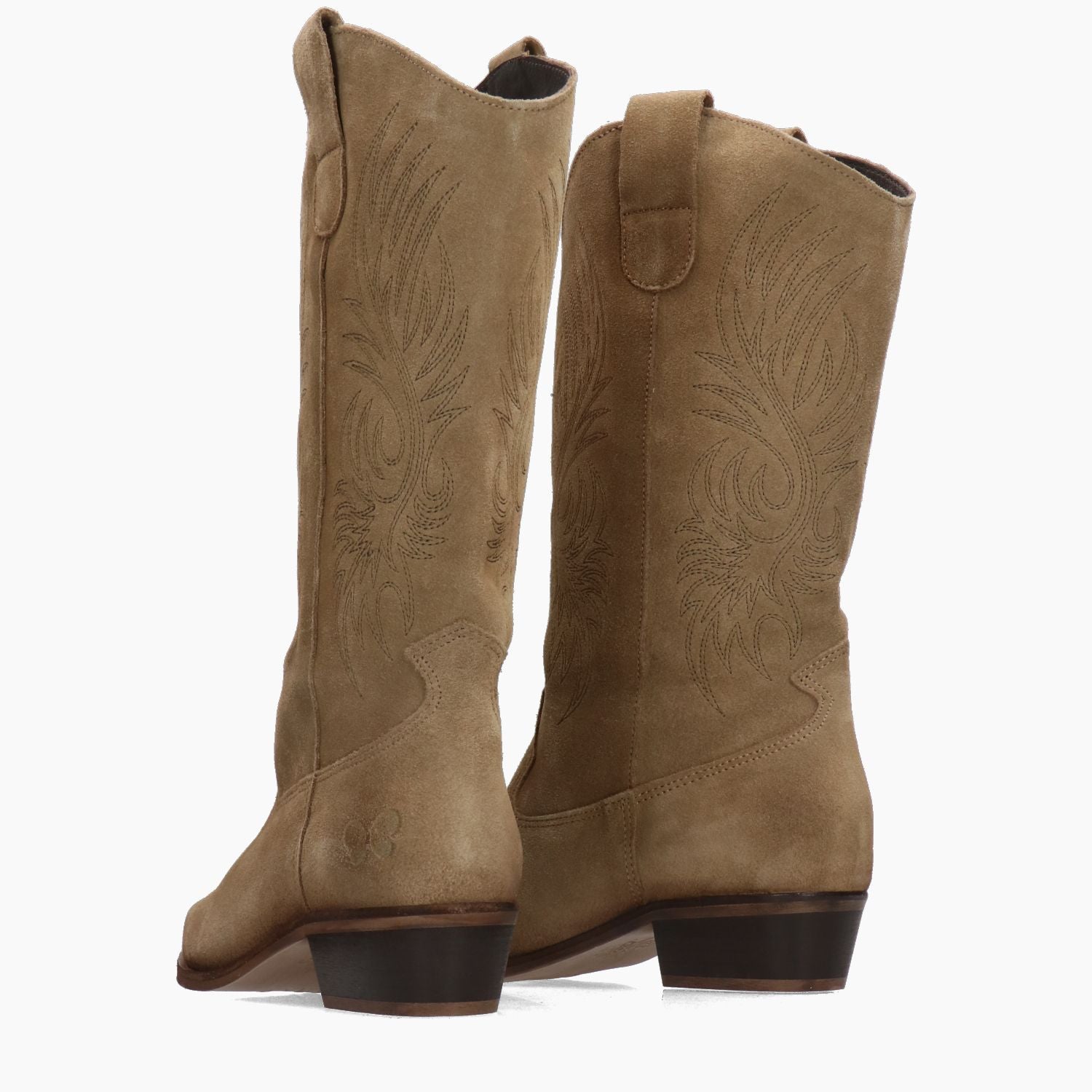 Beigefarbener Wildleder-Schlauchstiefel im Texan-Stil mit passender Stickerei. Futter aus Felminis charakteristischem, farbenfrohem Stoff. Gummisohle mit 3,5 cm Absatz. Felmini Damenkollektion.