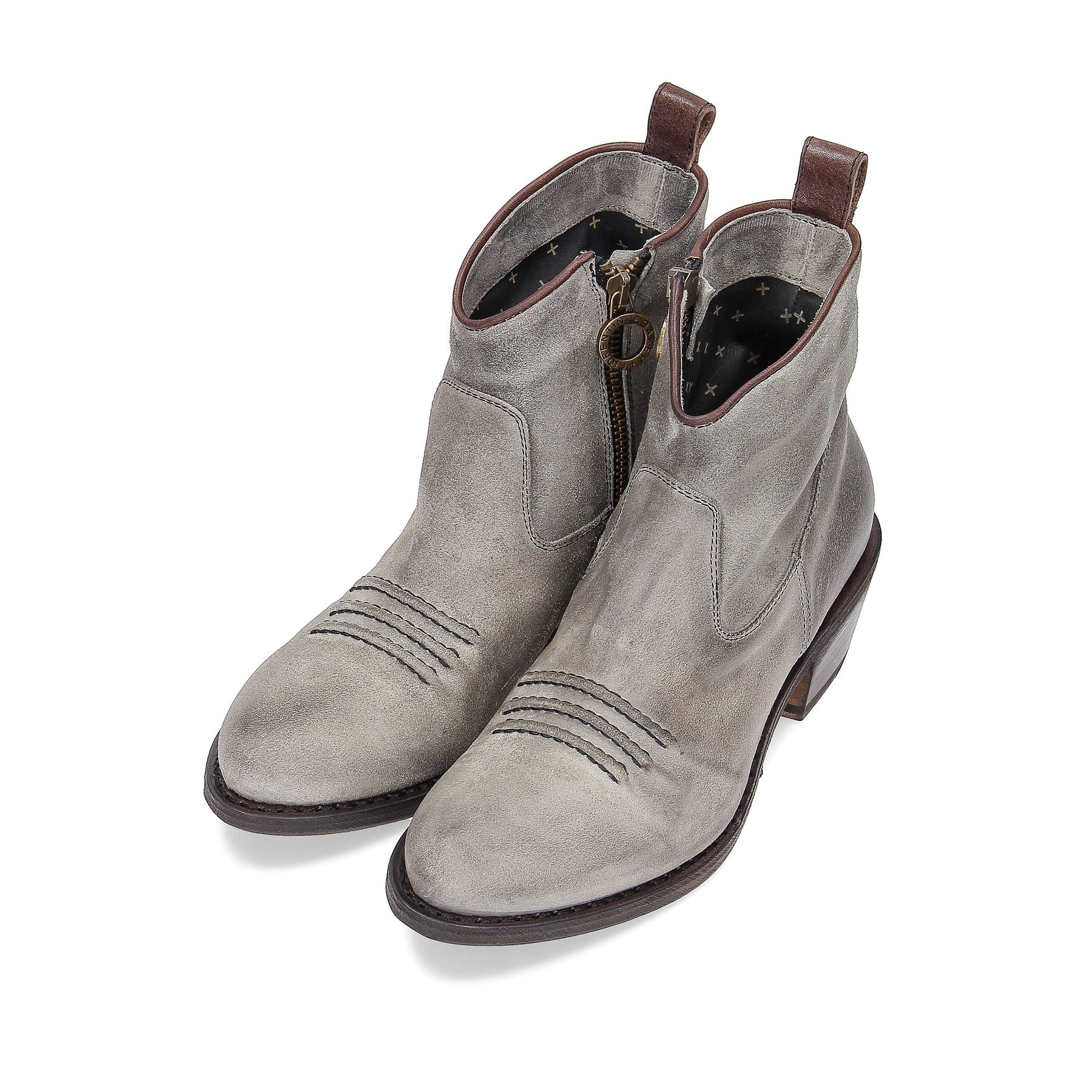 Stiefeletten aus gealtertem Wildleder in Steinoptik, dunkelbraune Lederdetails, innenliegender Reißverschluss, 40 mm Absatz, Leder- und genähte Gummisohle.