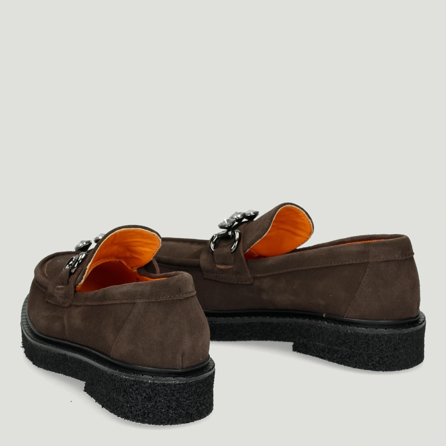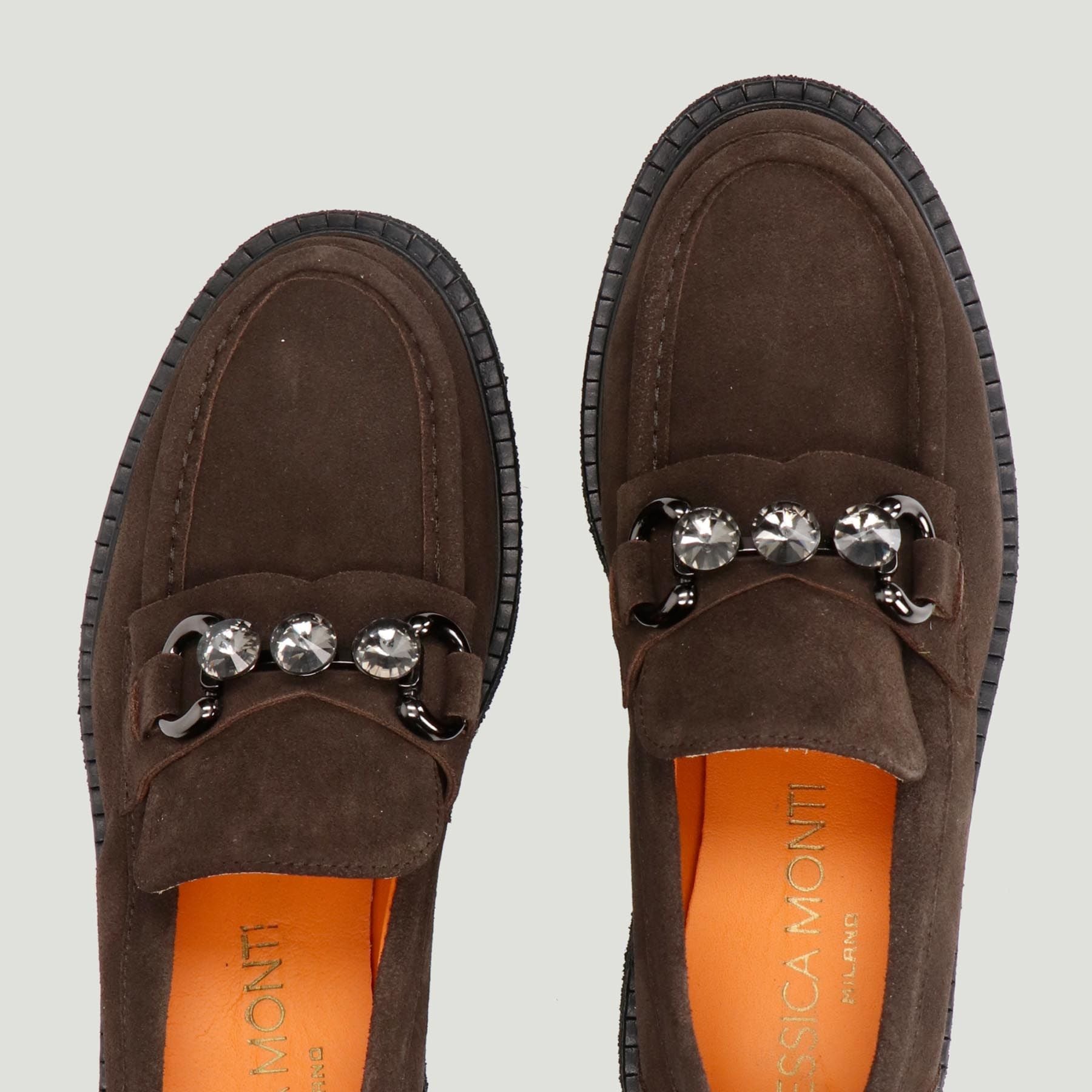 Dunkelbrauner Wildleder-Loafer. Schnalle in Gunmetal-Optik mit Strasssteinen. Lederfutter mit herausnehmbarer Innensohle. Gummisohle mit 3 cm Absatz. Gessica Monti Milano Damen-Herbst-/Winterkollektion.