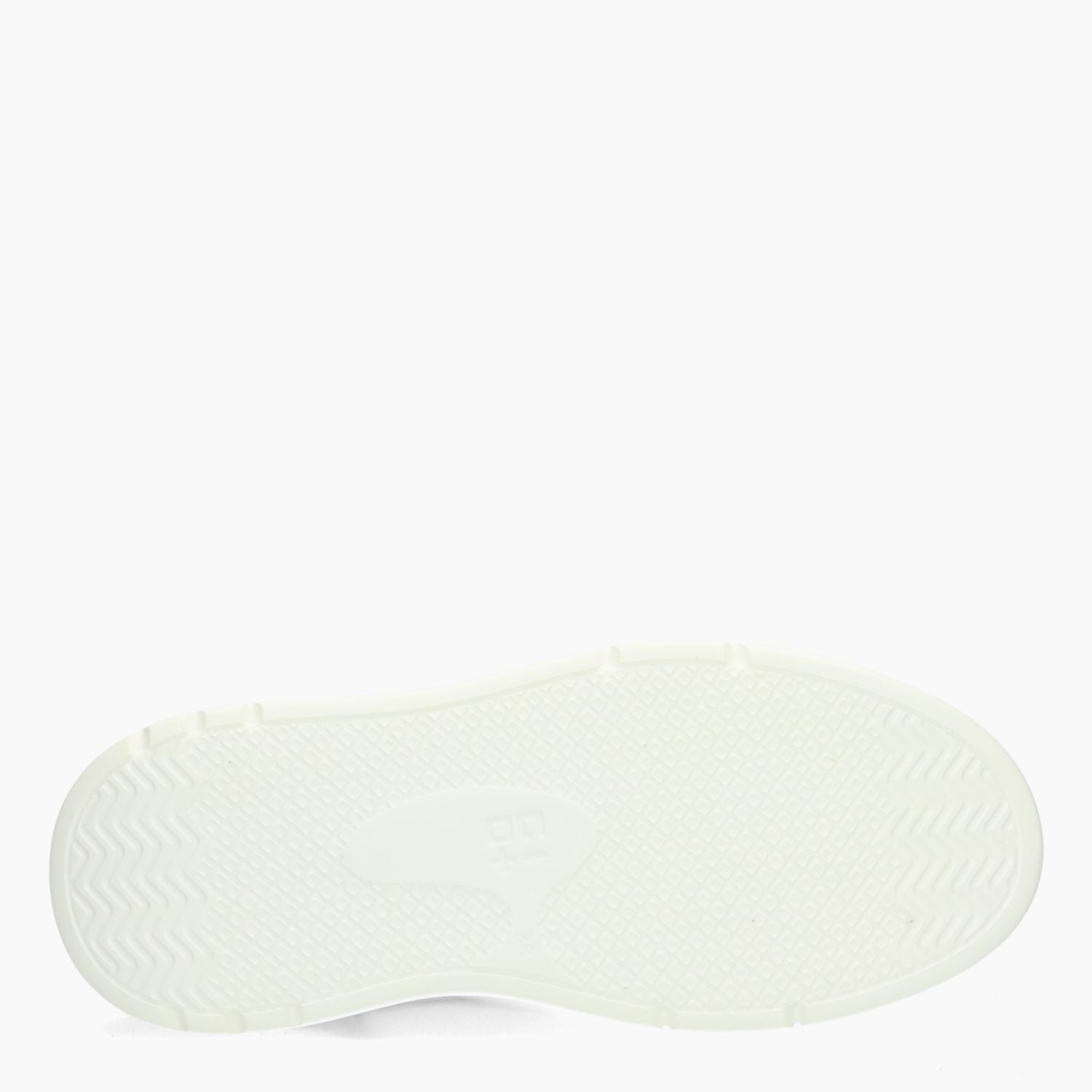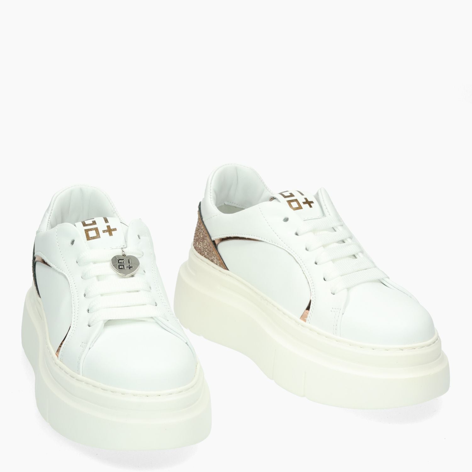 Gio+ Sneaker mit weißem Leder-Obermaterial. Baumwollschnürsenkel mit Logo-Verzierung. Goldene Glitzer-Fersenlasche. Leder- und Textilfutter mit herausnehmbarer Innensohle. Gummisohle mit 4 cm Plateau. Gio+ Damenkollektion.