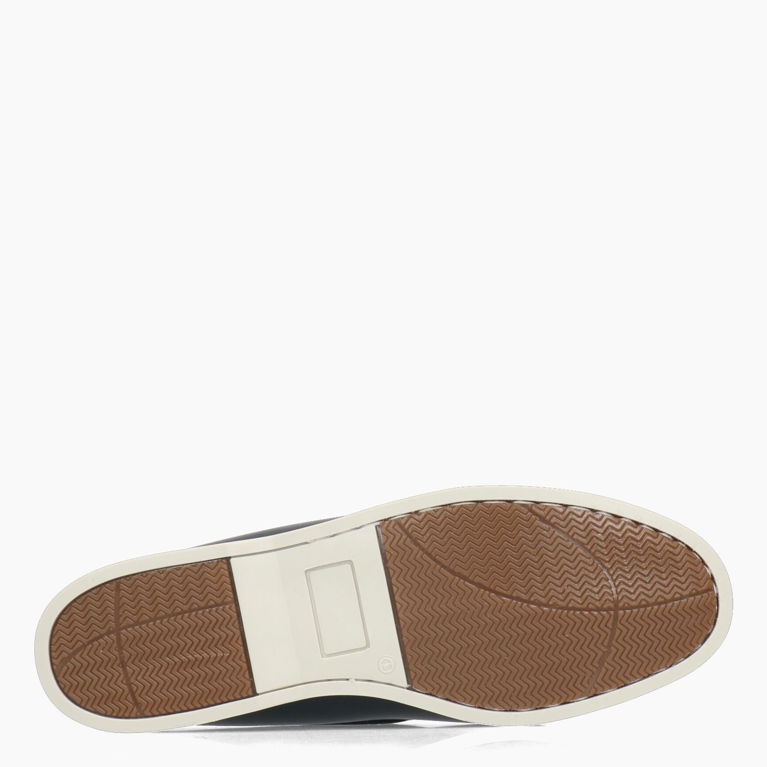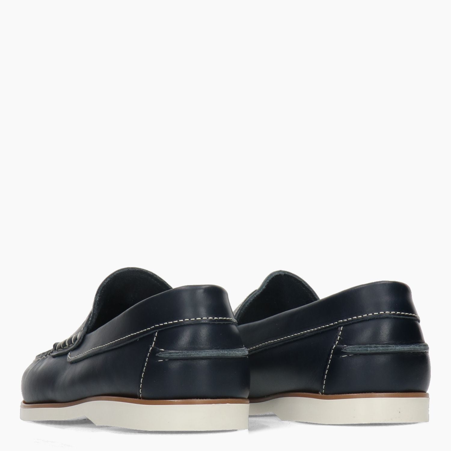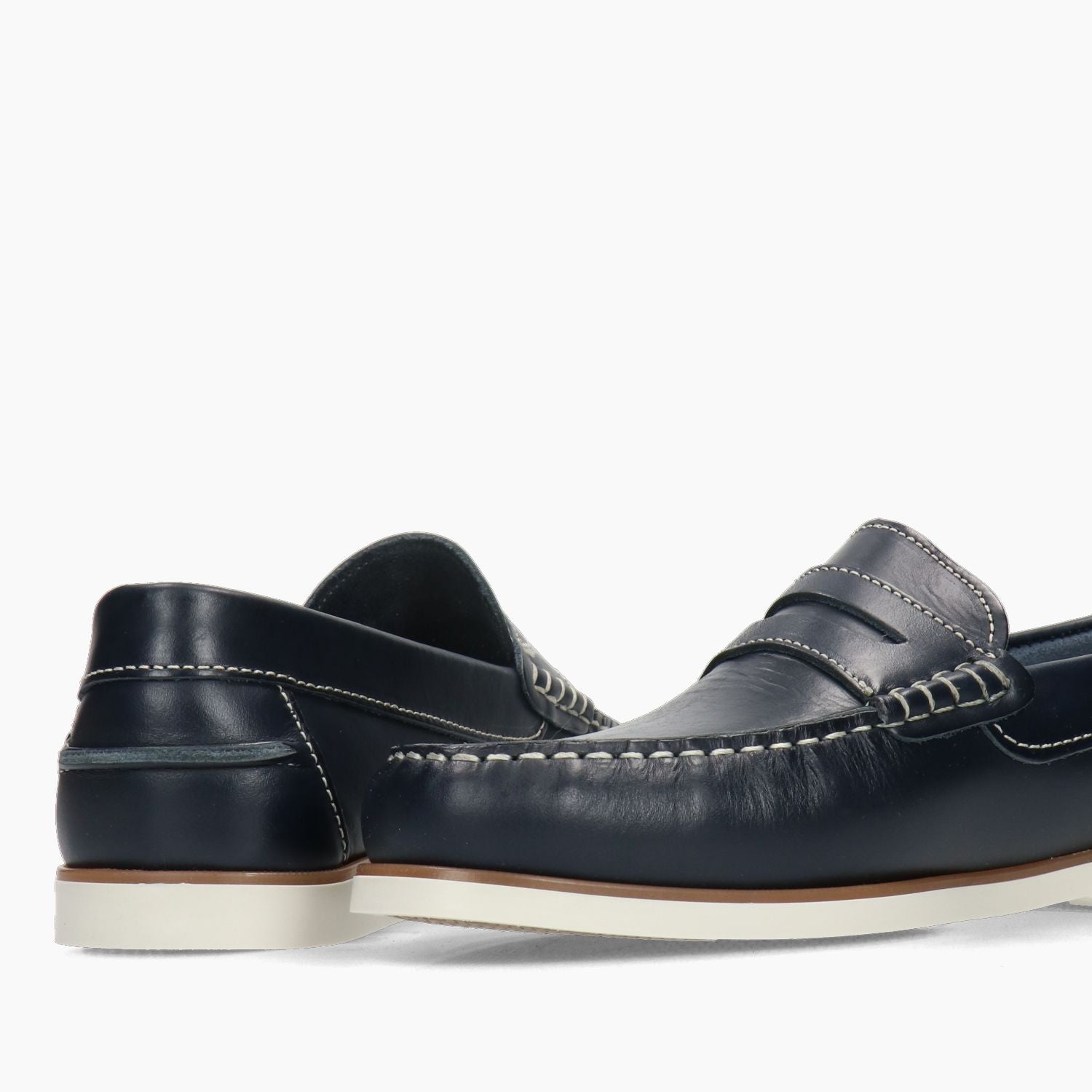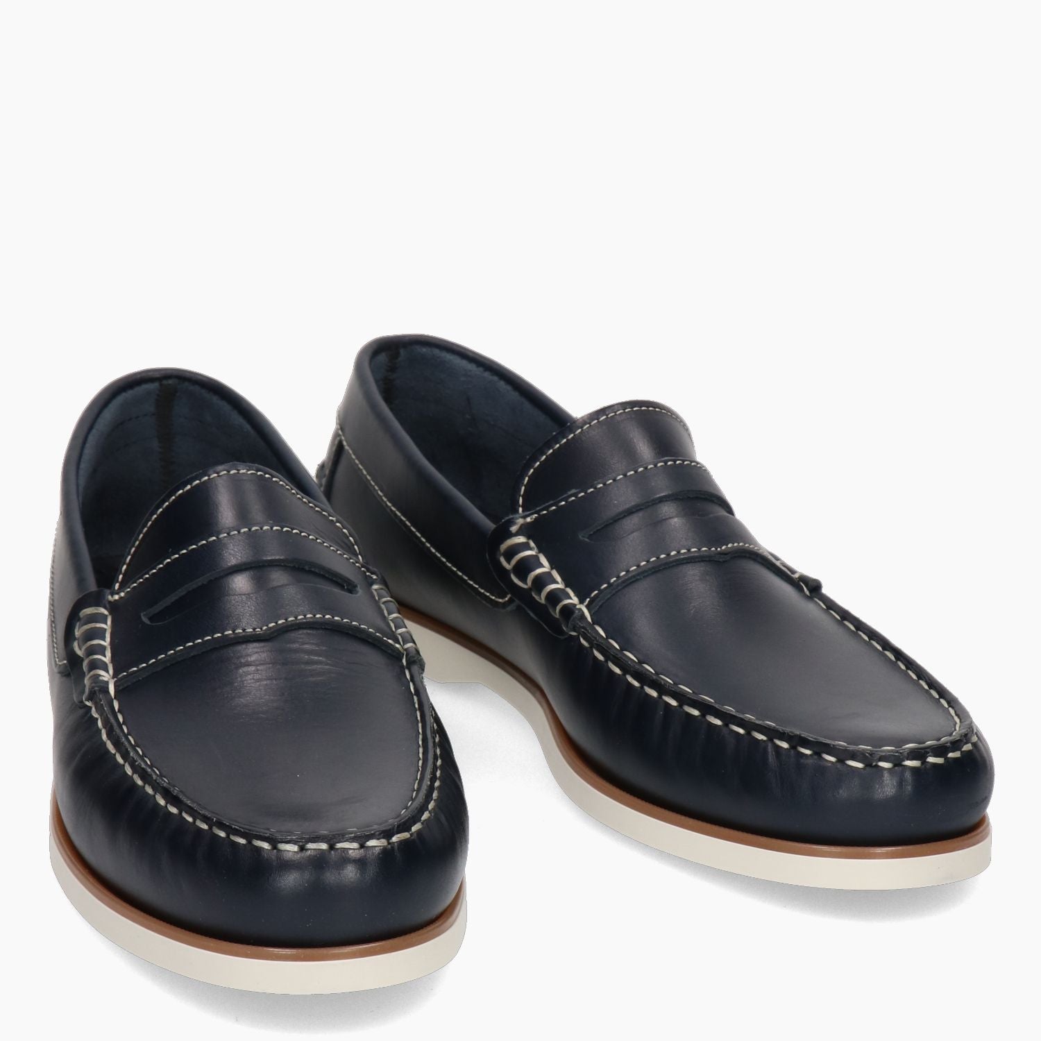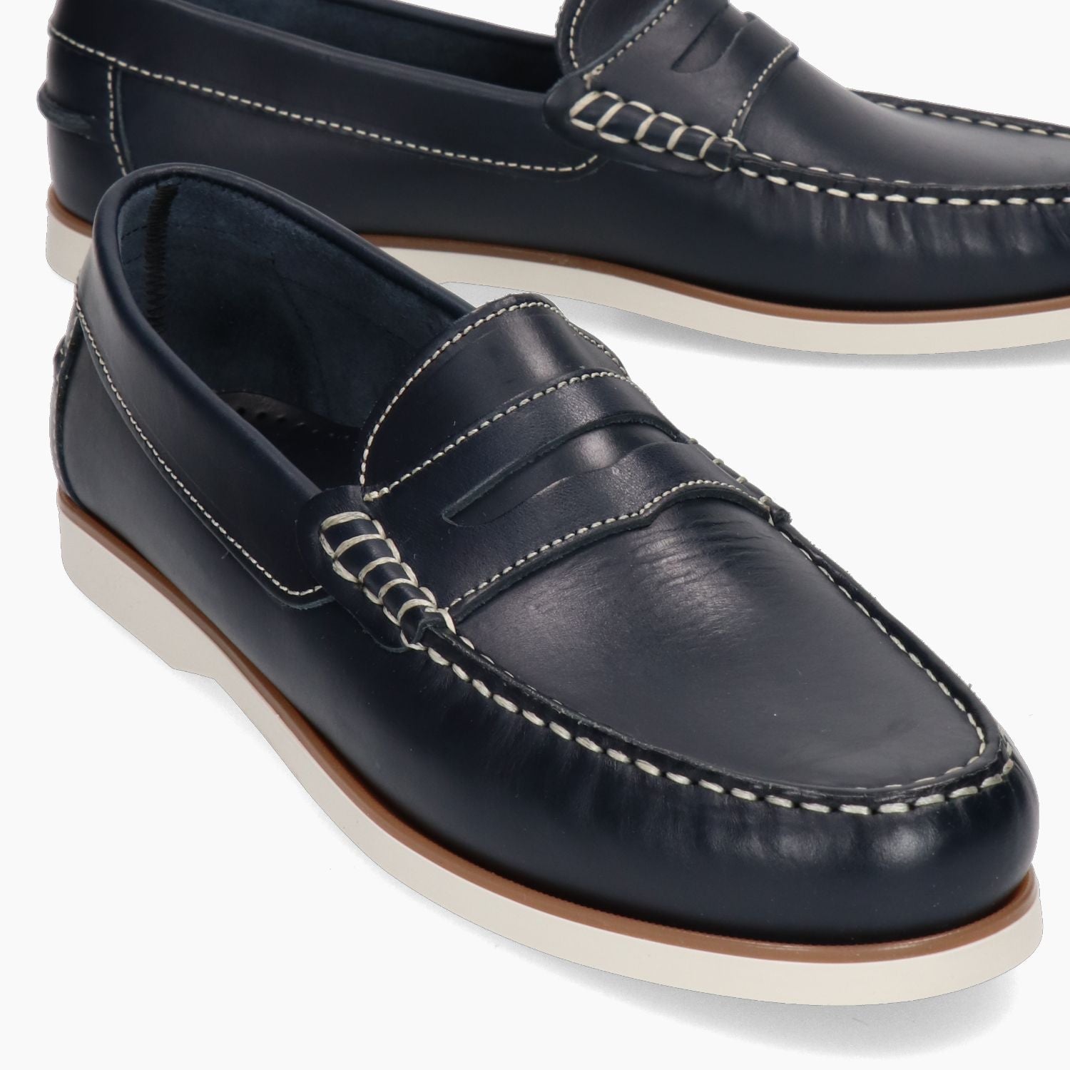 Blaue Lederslipper mit dezenten Kontrastnähten. Lederfutter. Elfenbeinfarbene Gummisohle mit 1 cm Absatz. Aus der Herren-Frühjahr/Sommer-Kollektion.