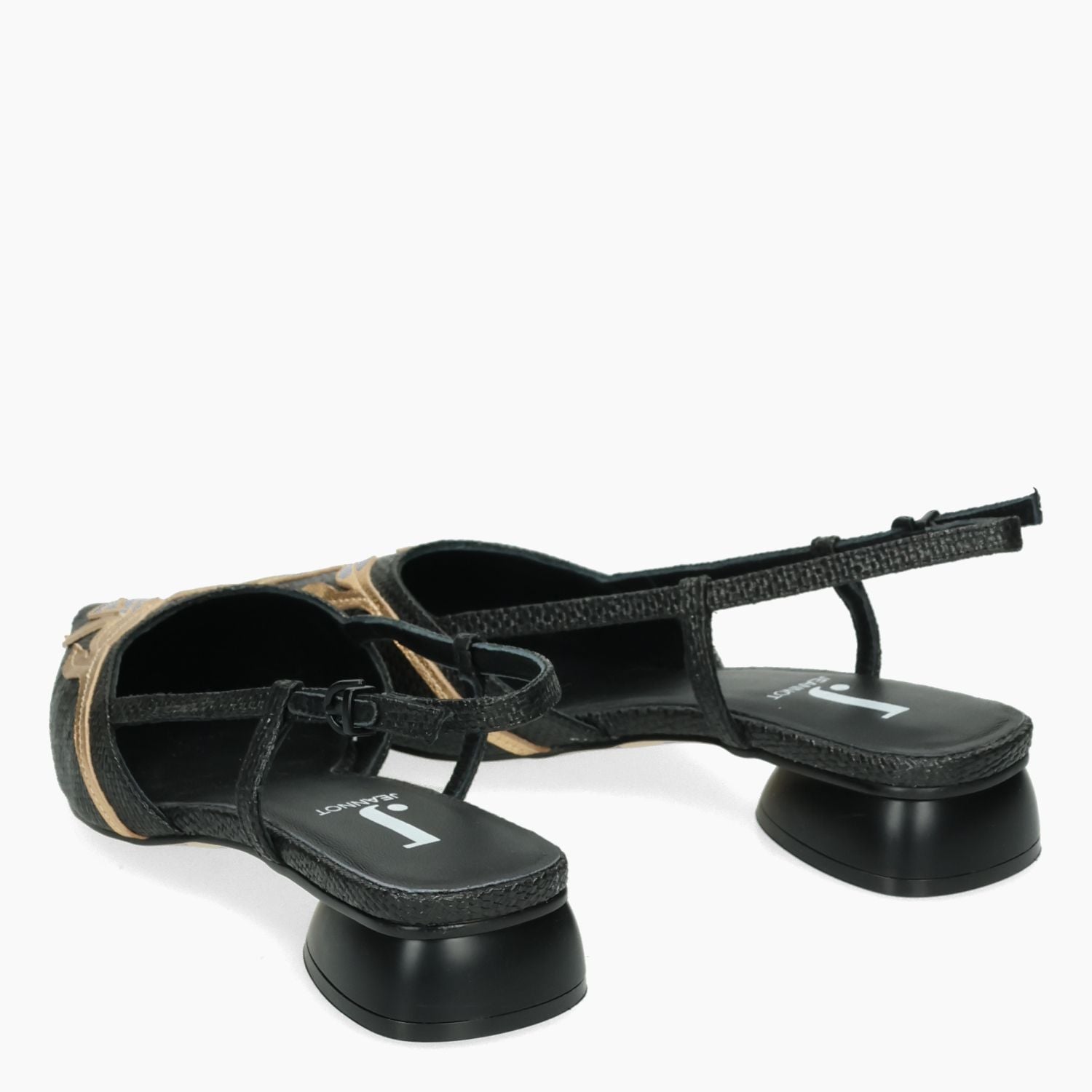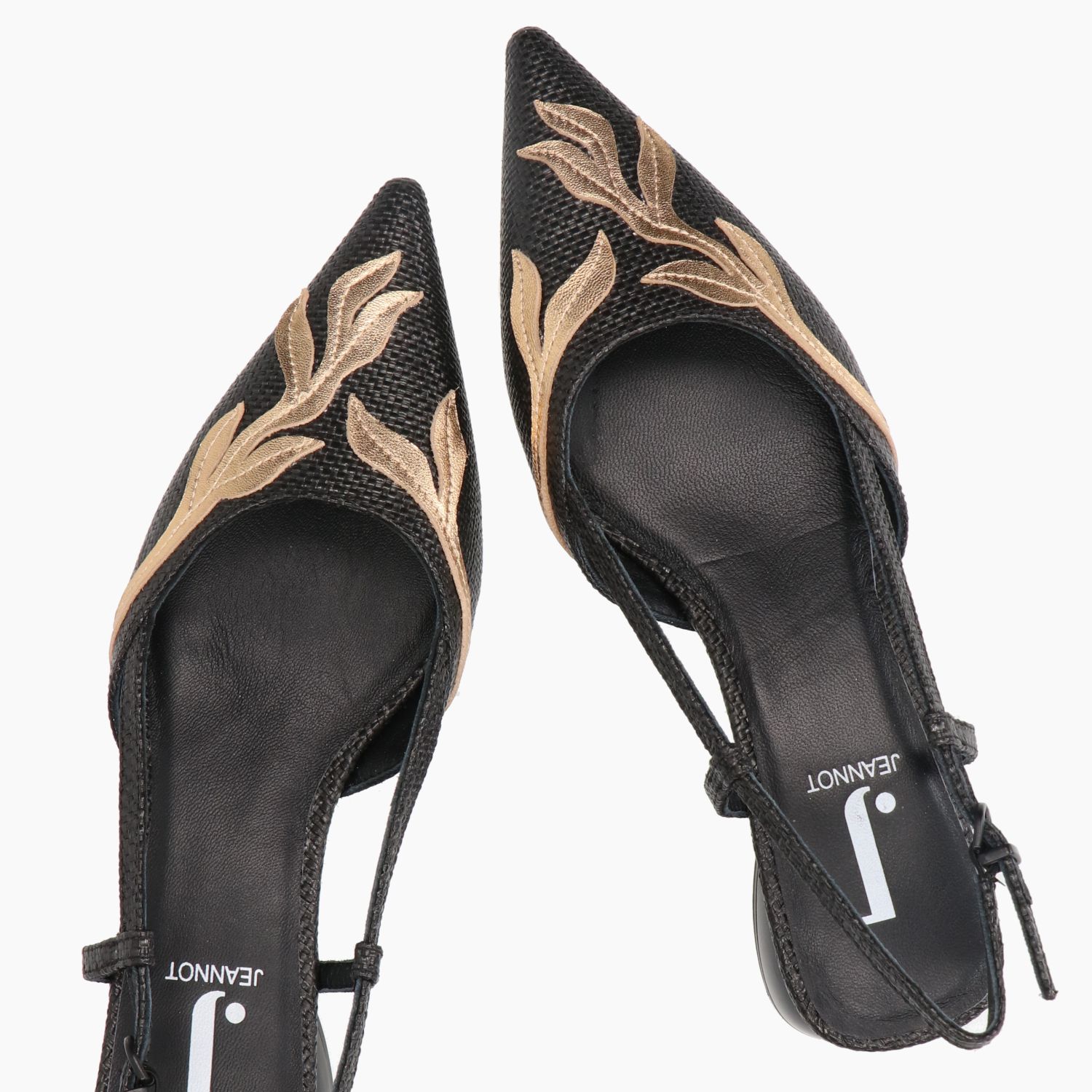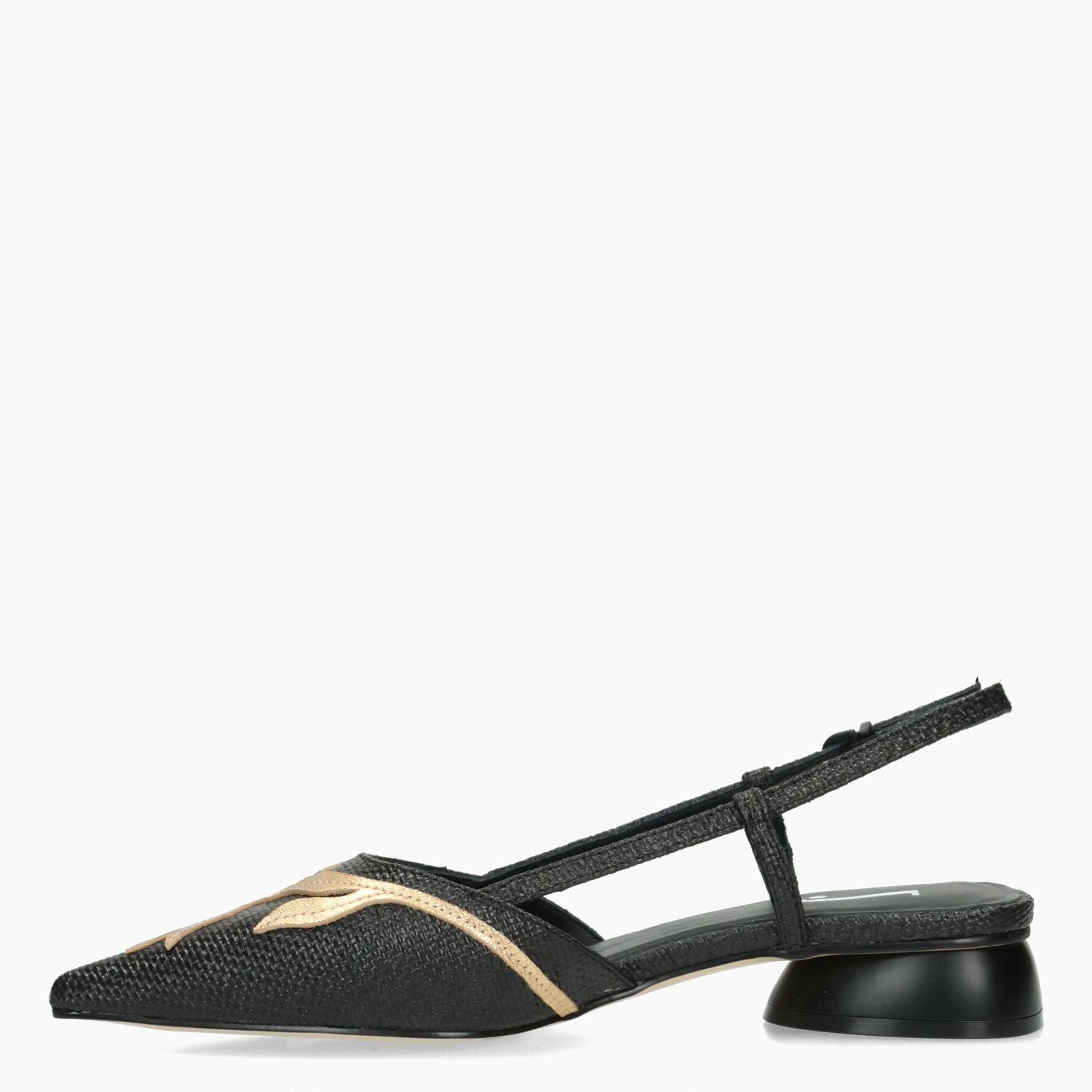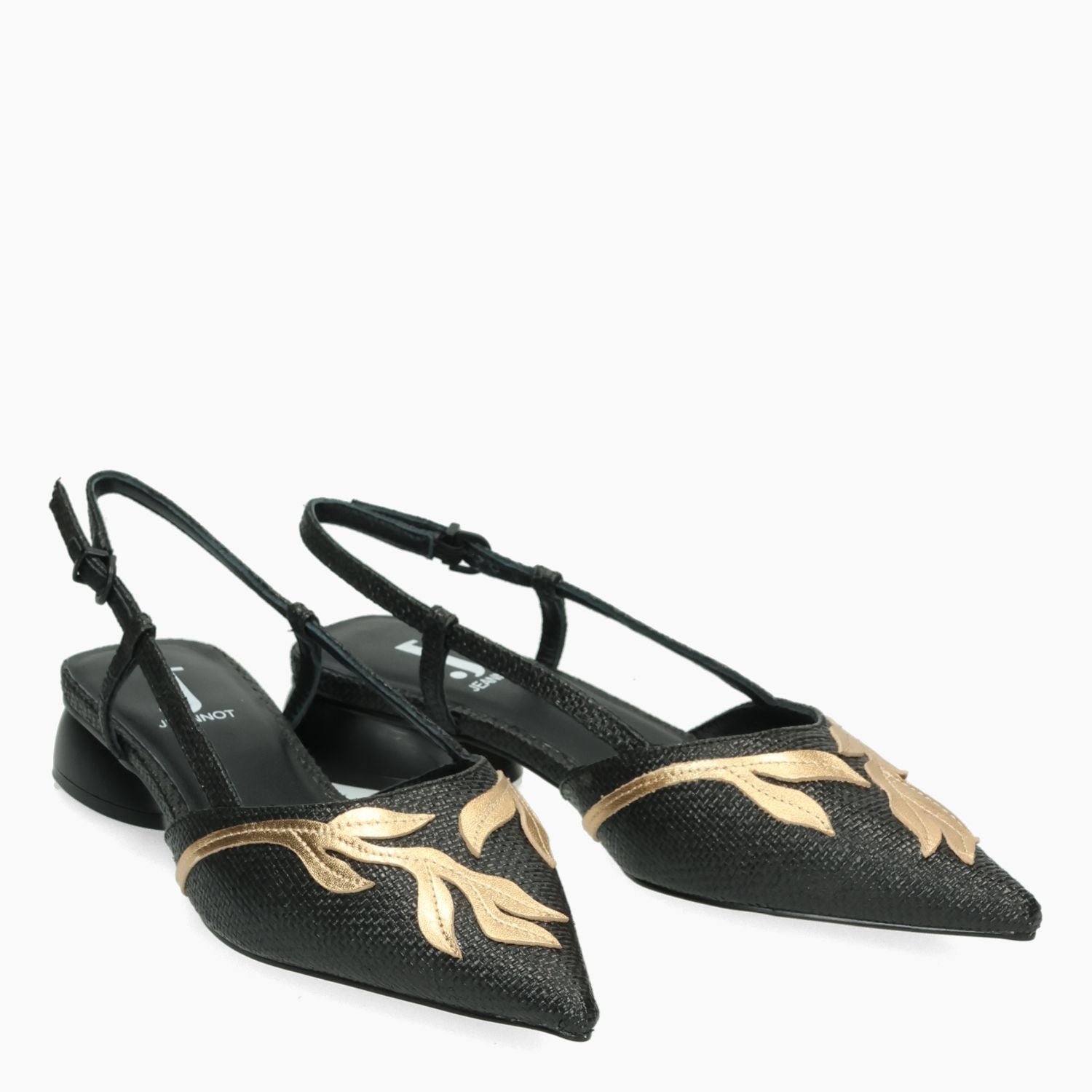 Schwarze Slingback-Pumps aus Bast mit goldfarbenem, laminiertem Lederbesatz. Lederfutter. Gummisohle mit 2,5 cm Absatz. Jeannot Damen-Frühjahr/Sommer-Kollektion.