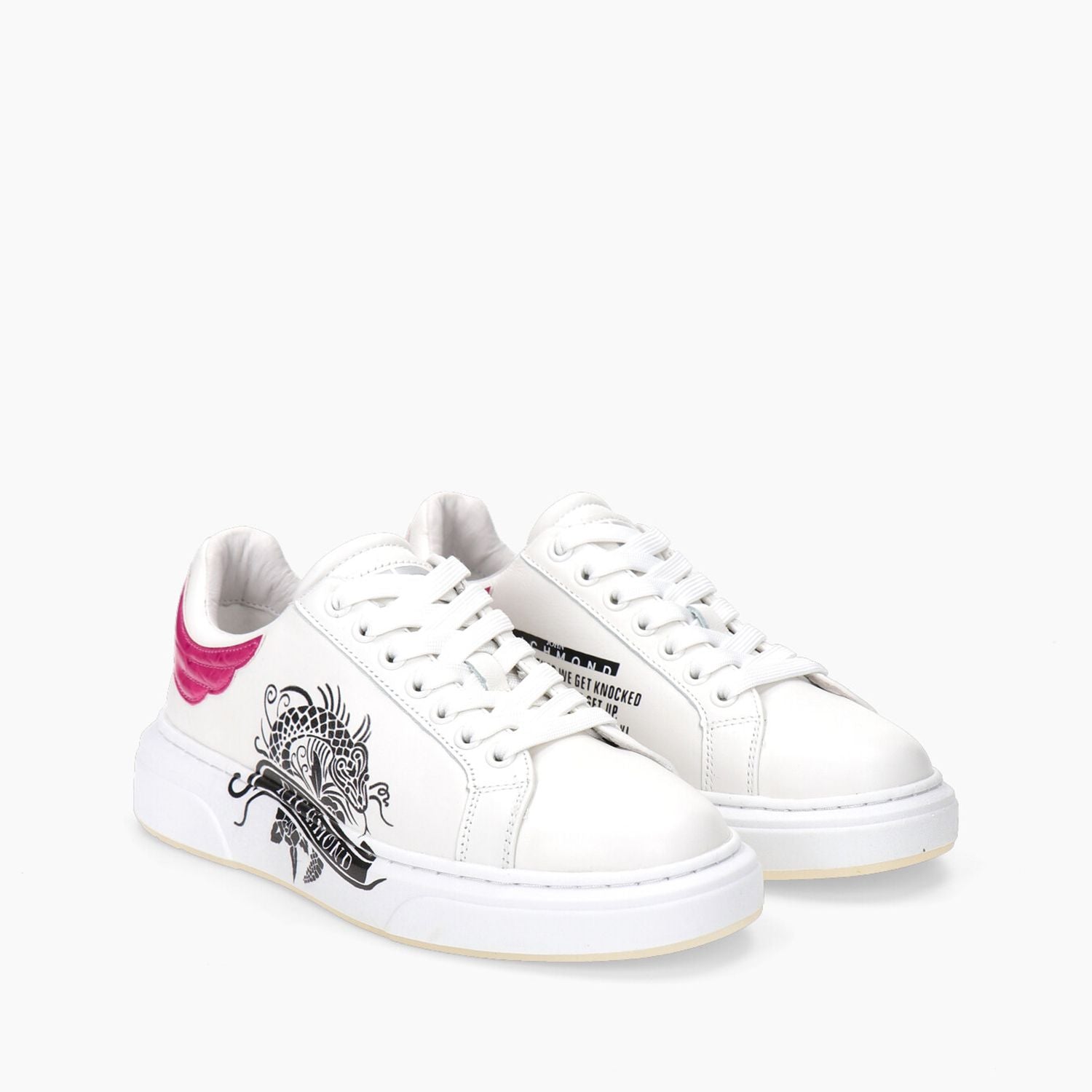 Weiße Ledersneaker mit seitlichem Aufdruck und fuchsiafarbenem Lederspoiler, 5 cm Plateau, Gummisohle.