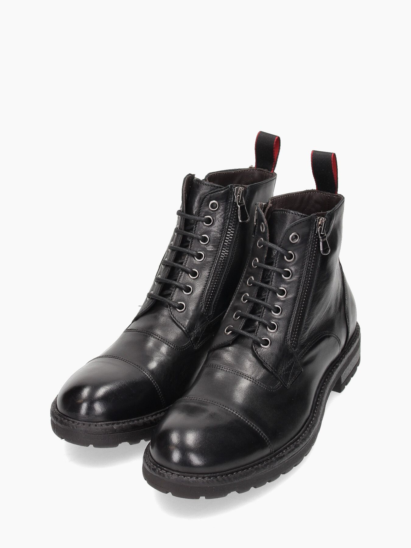Stiefelette aus Leder. Obermaterial aus schwarzem Leder. Runde Zehenpartie. Ton-in-Ton-Schnürsenkel, Ösen und seitlicher Reißverschluss. Ton-in-Ton-Fersenlasche aus Leder. Lederfutter. Feste Innensohle. Schwarze Gummisohle. 3,5 cm Absatz. JP David Herren Herbst/Winter Kollektion.