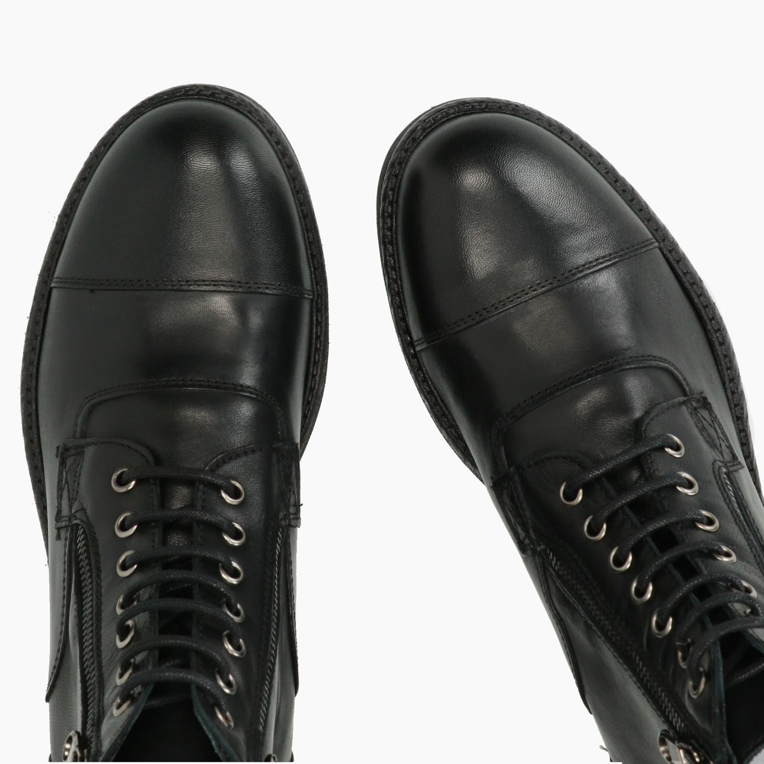Stiefelette aus Leder. Obermaterial aus schwarzem Leder. Runde Zehenpartie. Ton-in-Ton-Schnürsenkel, Ösen und seitlicher Reißverschluss. Ton-in-Ton-Fersenlasche aus Leder. Lederfutter. Feste Innensohle. Schwarze Gummisohle. 3,5 cm Absatz. JP David Herren Herbst/Winter Kollektion.