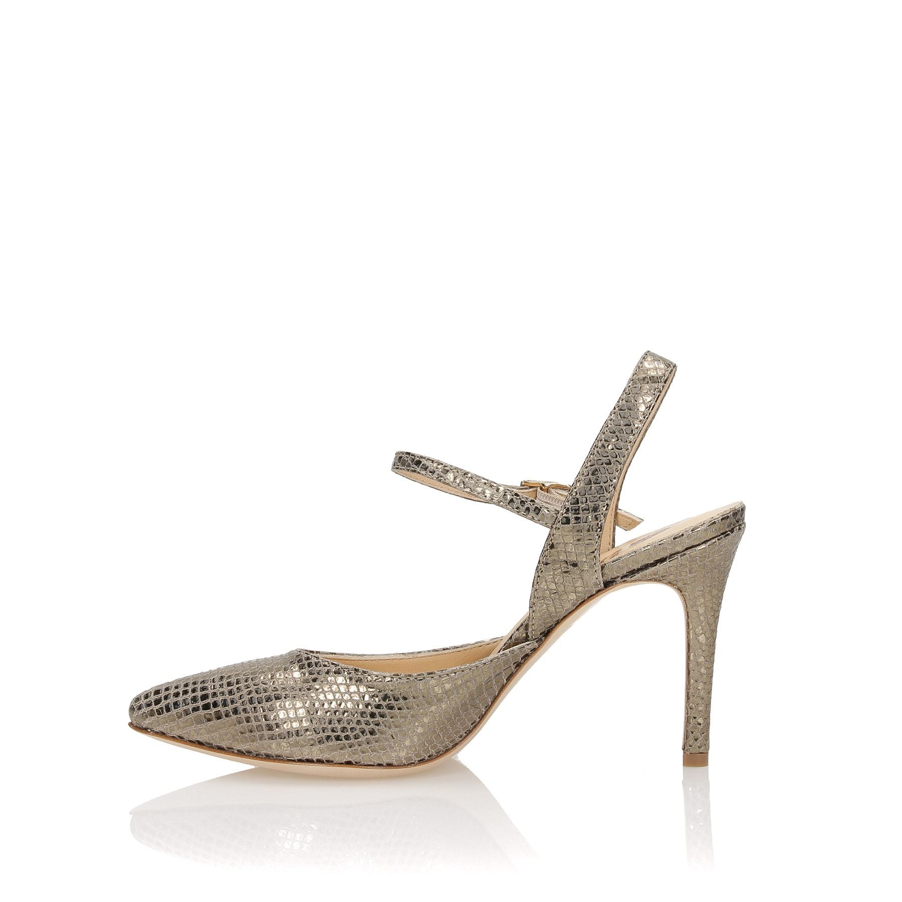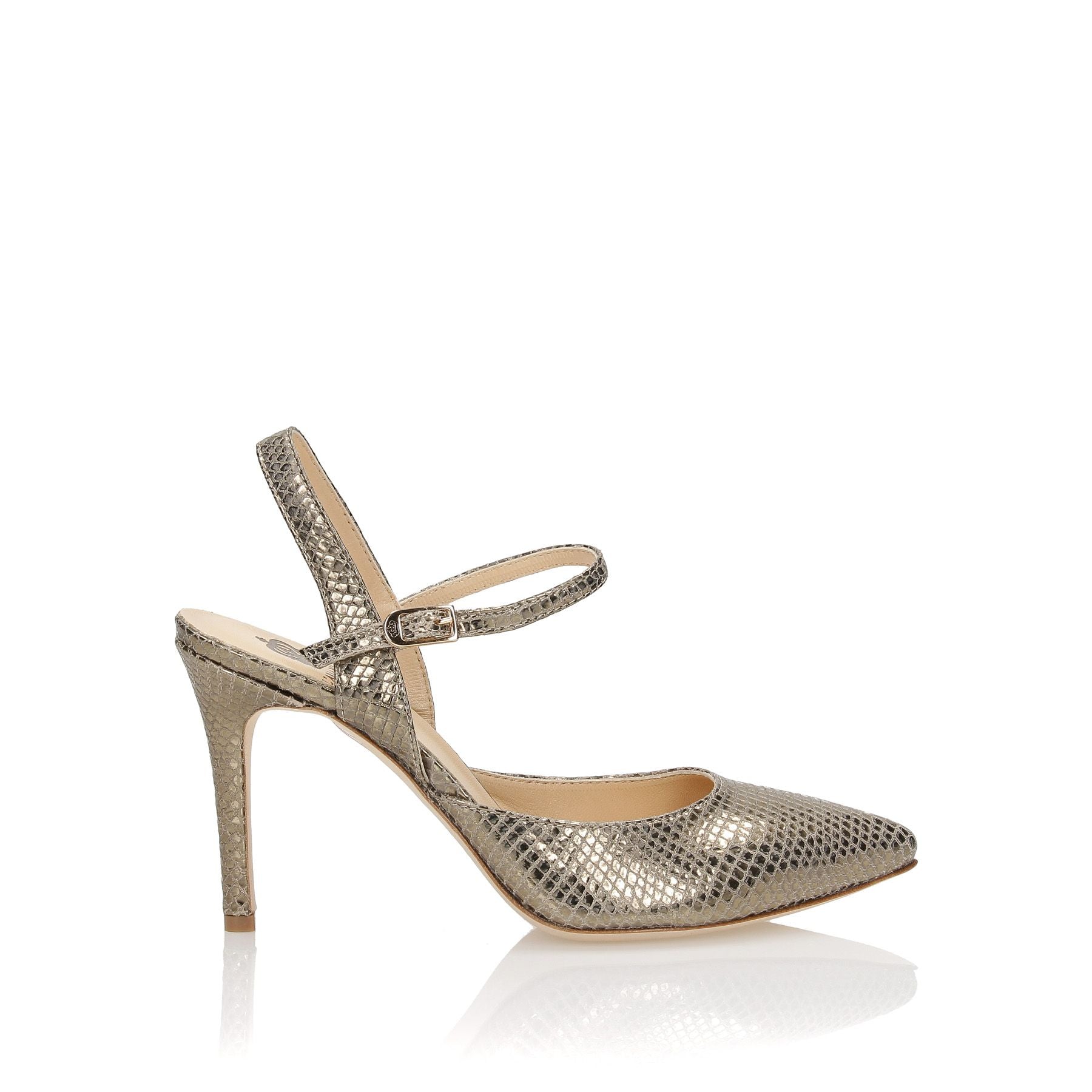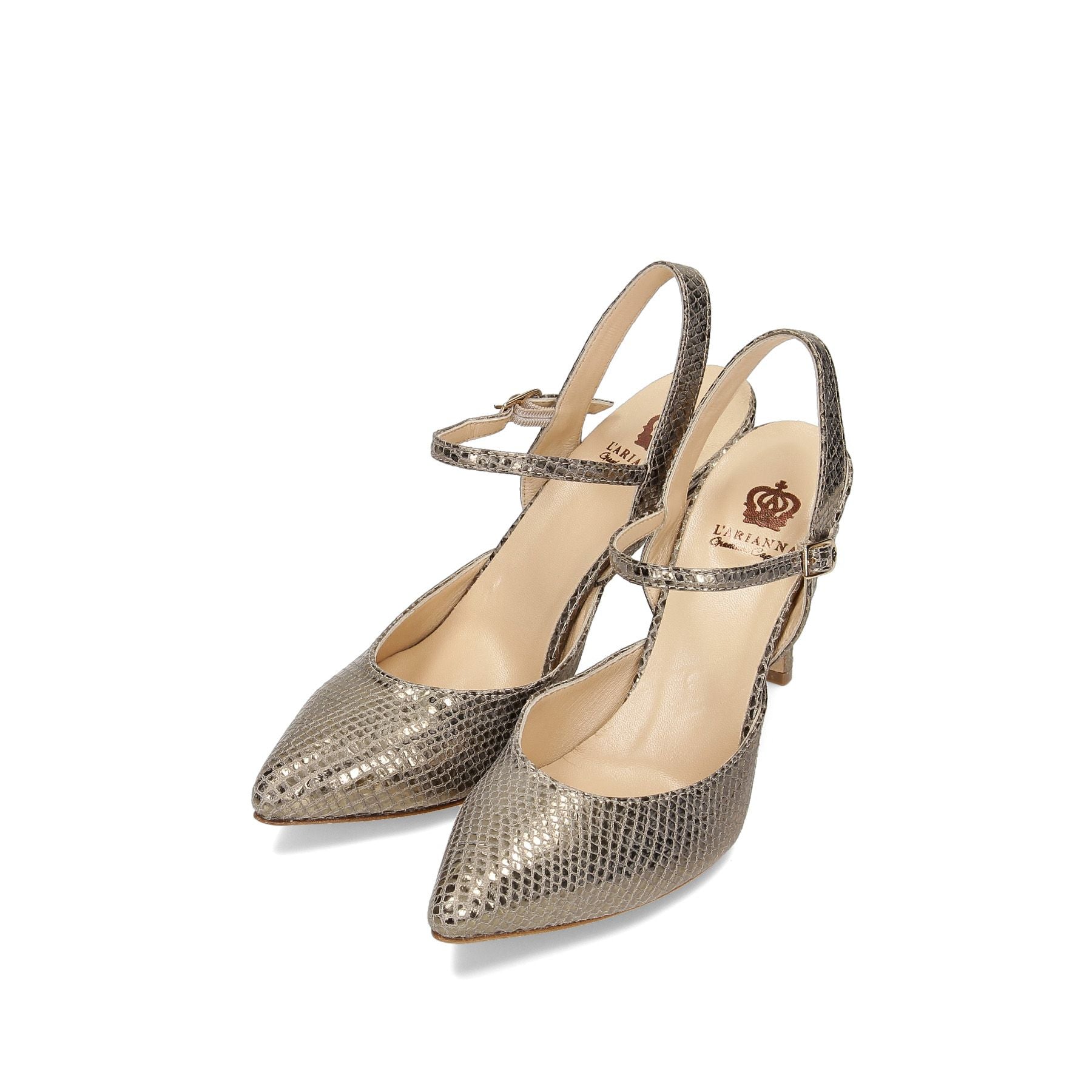 Chanel-Pumps aus laminiertem Leder mit Pythonmuster in Zinnoptik, 90 cm Absatz, Ledersohle.