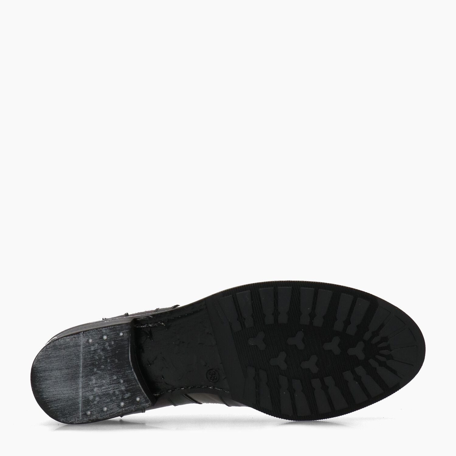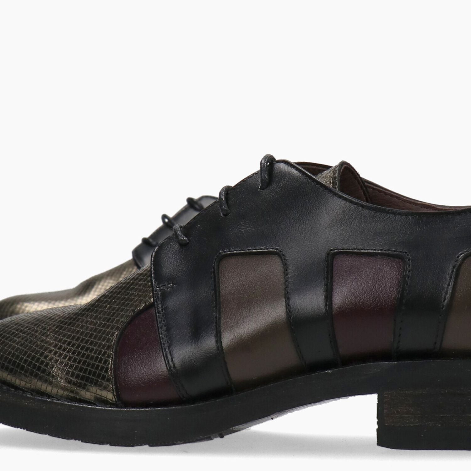 Derby aus bronzefarbenem, laminiertem Leder mit schwarzen, burgunderroten und schlammfarbenen Einsätzen, Gummisohle.