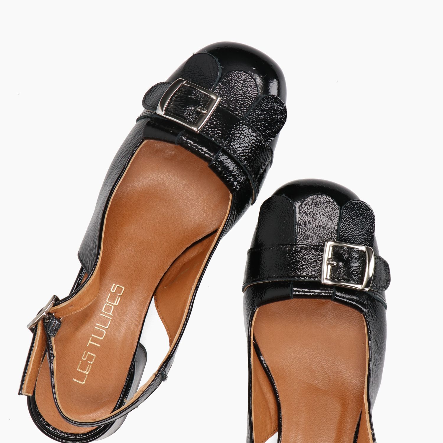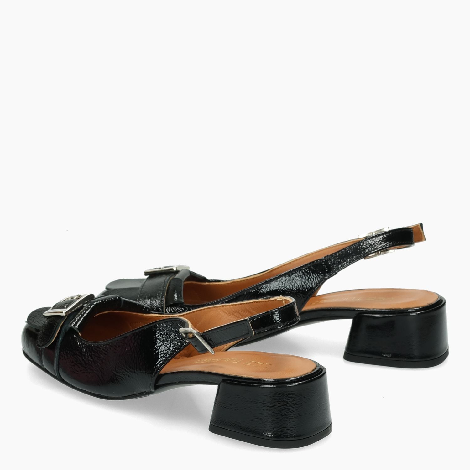 Schwarze Chanel-Tasche aus Naplak-Leder mit Fransen und silberner Schnalle. Verstellbarer Seitenriemen. Lederfutter. Gummisohle mit 3,5 cm Absatz. Les Tulipes Damen-Frühjahr/Sommer-Kollektion.