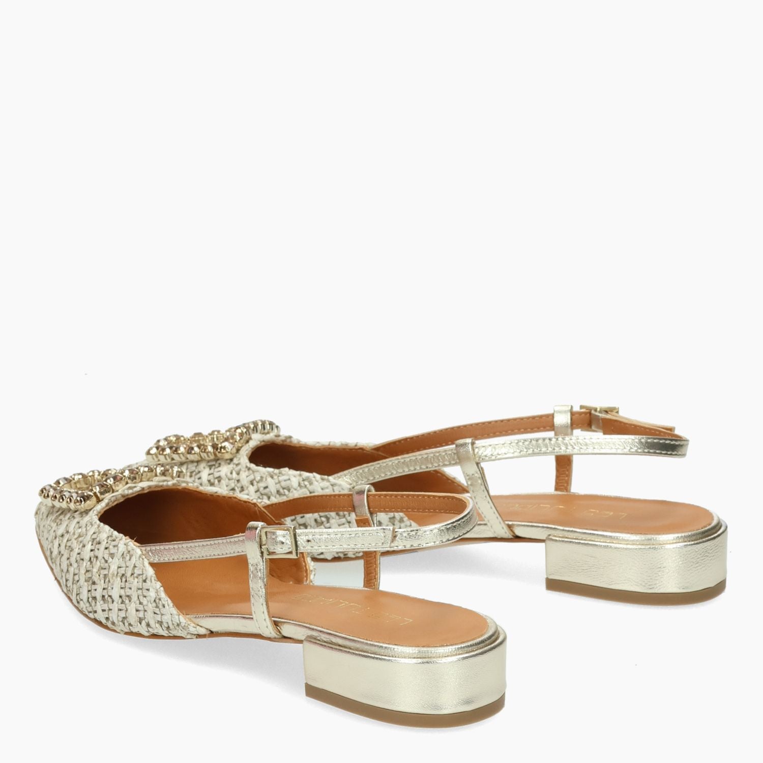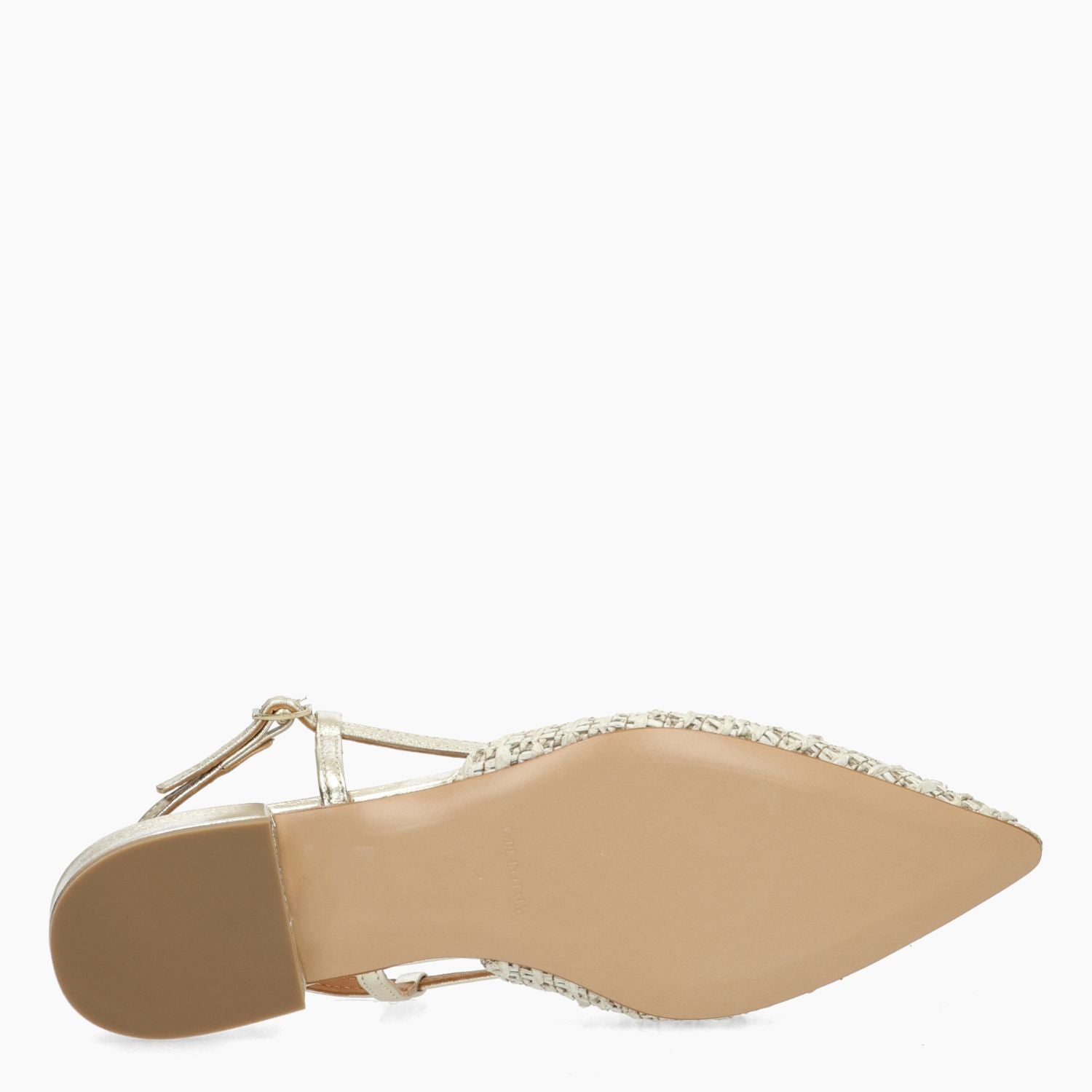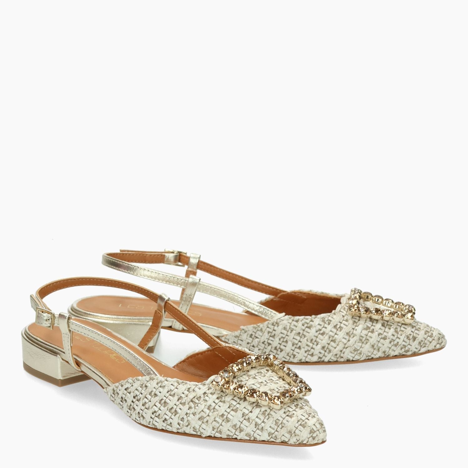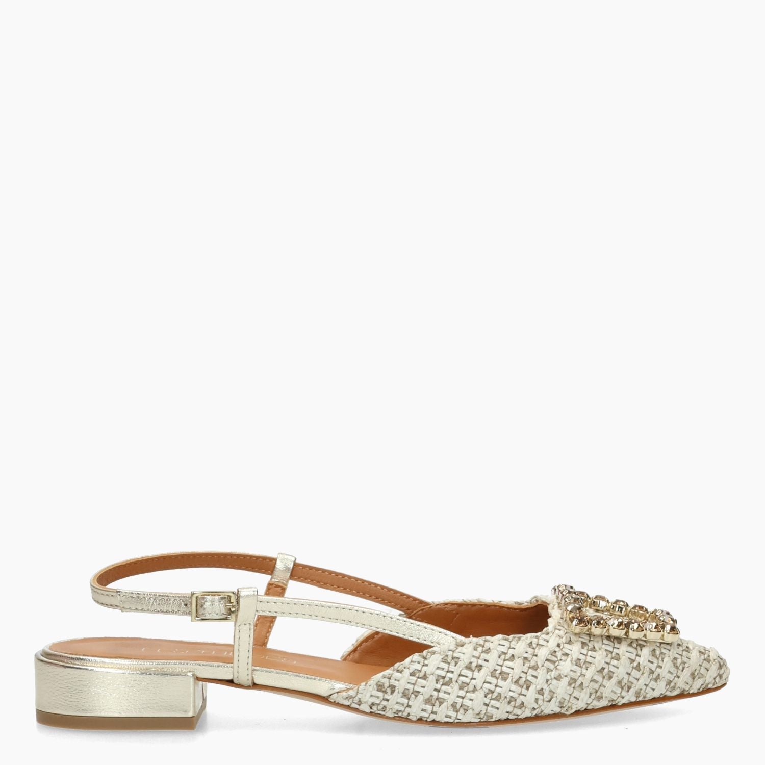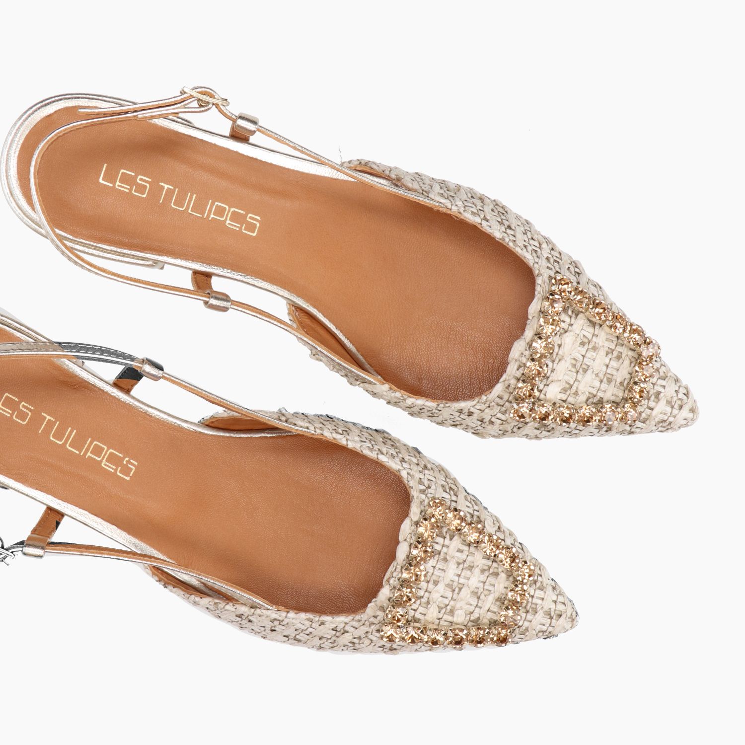 Beigefarbene Chanel-Tasche aus gewebtem Stoff mit goldener Strassschnalle. Vergoldeter Lederriemen mit verstellbarer Schnalle. Lederfutter. Gummisohle mit 2 cm Absatz. Les Tulipes Damen-Frühjahr/Sommer-Kollektion.