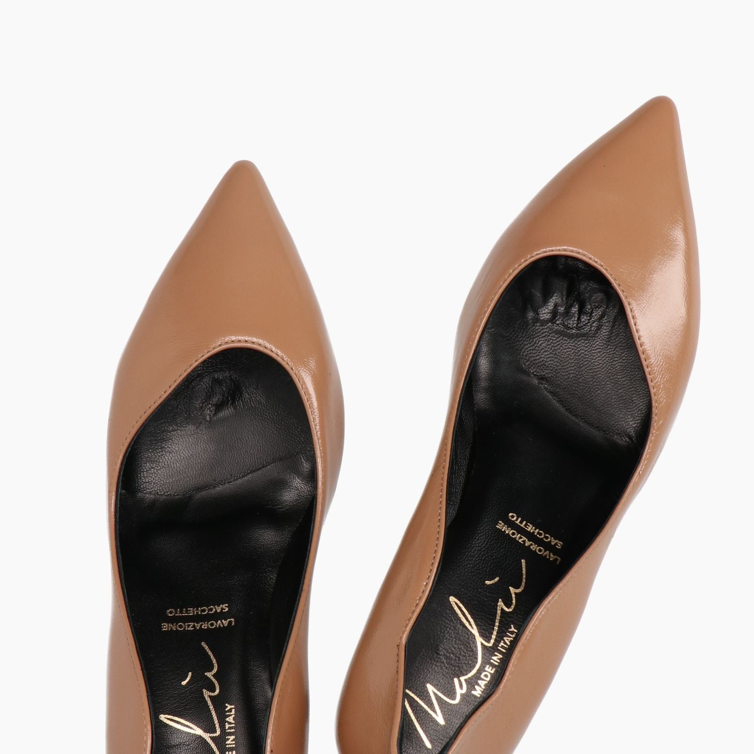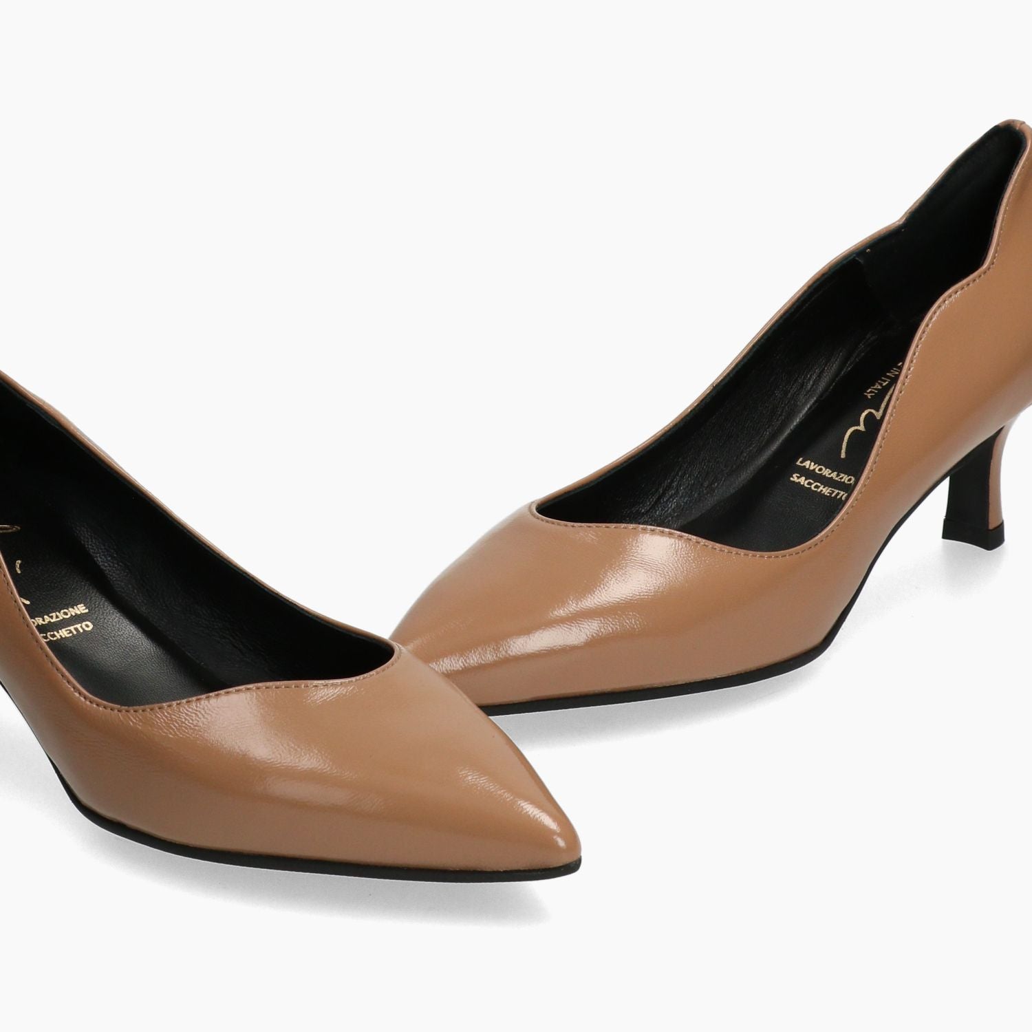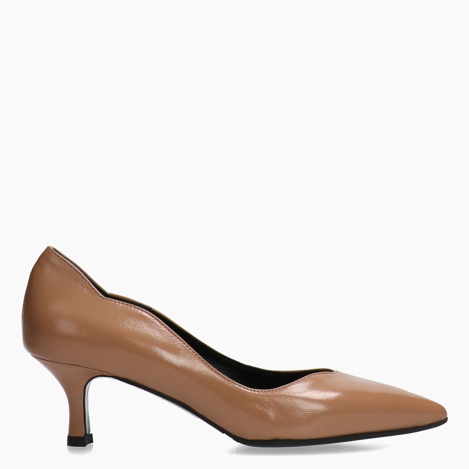 Beige Lacklederpumps. Asymmetrischer Rundhalsausschnitt und geschwungene Seitenpartie. Lederfutter. Gummisohle mit 5 cm Absatz. Malu Damen Herbst/Winter Kollektion.