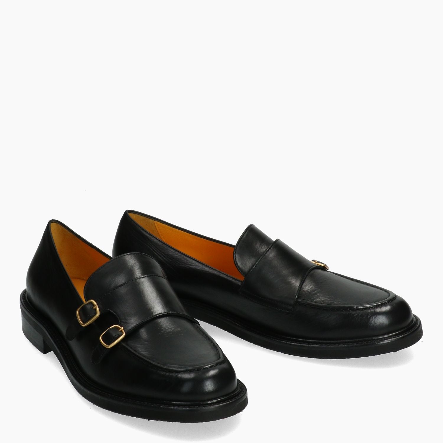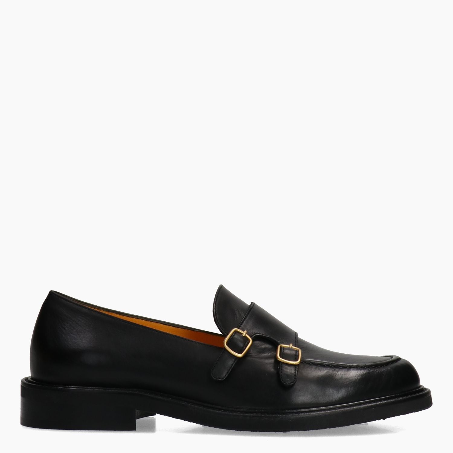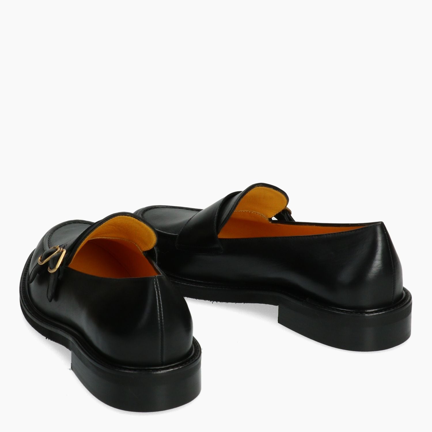 Schwarzer Lederloafer mit goldener Doppelschnalle. Innenfutter aus Leder im Satchel-Stil. Rutschfeste Gummisohle. 2,5 cm Absatz. Mara Bini Damen-Herbst-/Winterkollektion.