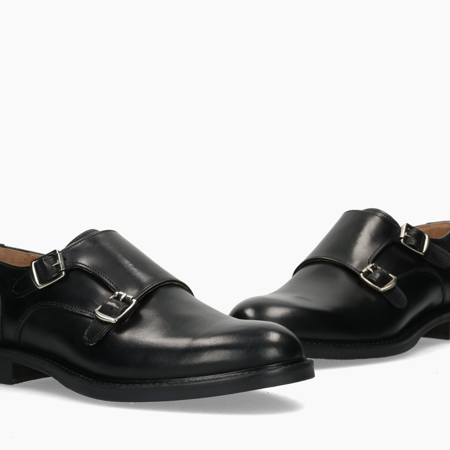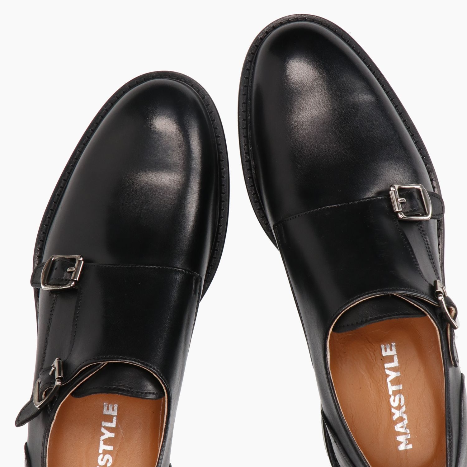 Schwarze Leder-Doppelschnalle. Silberner Schnallenverschluss. Lederfutter. Sohle aus Leder und Gummi mit 2,5 cm Absatz. Maxstyle Herrenkollektion.