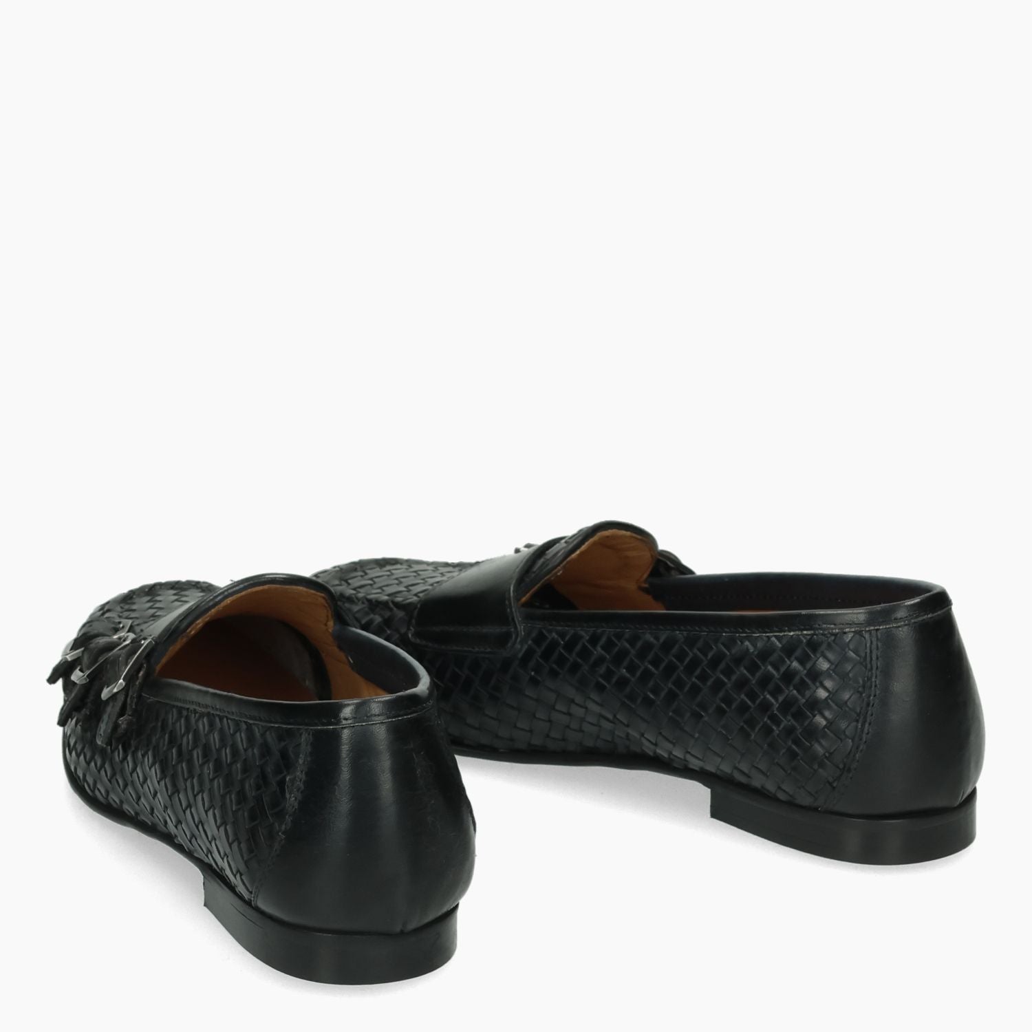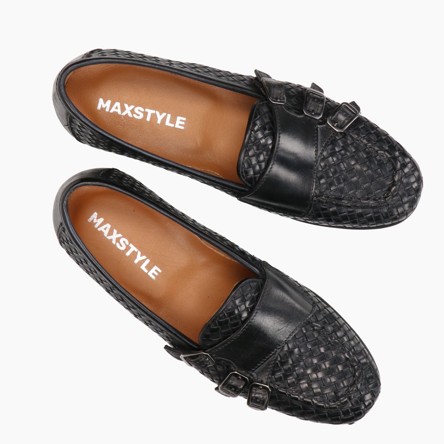Schwarzer Loafer aus gewebtem Leder mit dreifachem Schnallenriemen. Lederfutter. Rutschfeste Gummisohle. 1,5 cm Absatz. Maxstyle Damen-Frühjahr/Sommer-Kollektion.
