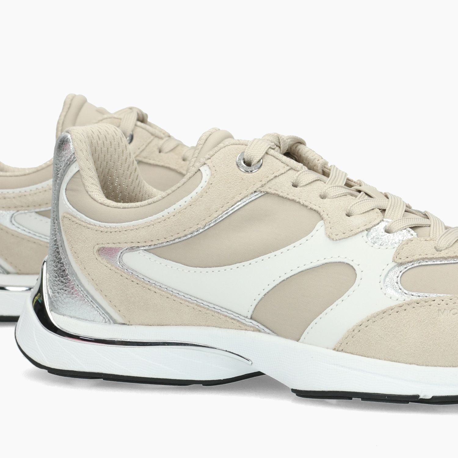 Beige Nylon-Sneaker mit passenden Wildledereinsätzen. Silberfarbener Absatz aus laminiertem Leder. Textilfutter mit fest integrierter Innensohle. 2 cm hohe Gummisohle. Michael Kors Frühjahr/Sommer-Kollektion.