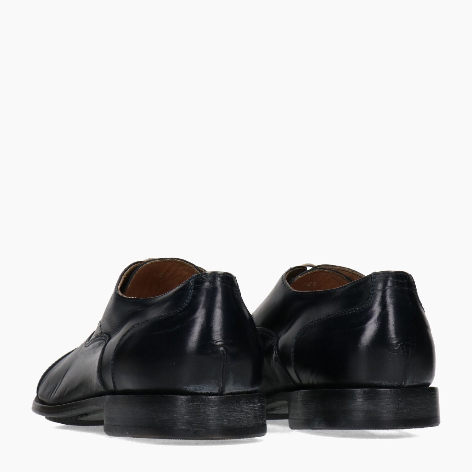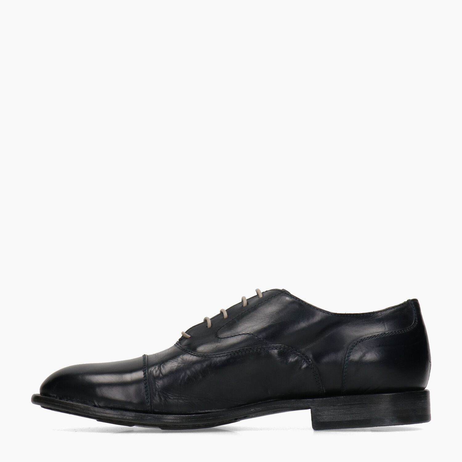 Moma Schnürschuhe mit nachtblauem Leder-Obermaterial und Zehenkappe. Ecrufarbene Baumwollschnürsenkel oder schwarze Ersatzschnürsenkel erhältlich. Lederfutter. Gummisohle mit 2 cm Absatz. Moma Herren Frühjahr/Sommer Kollektion.