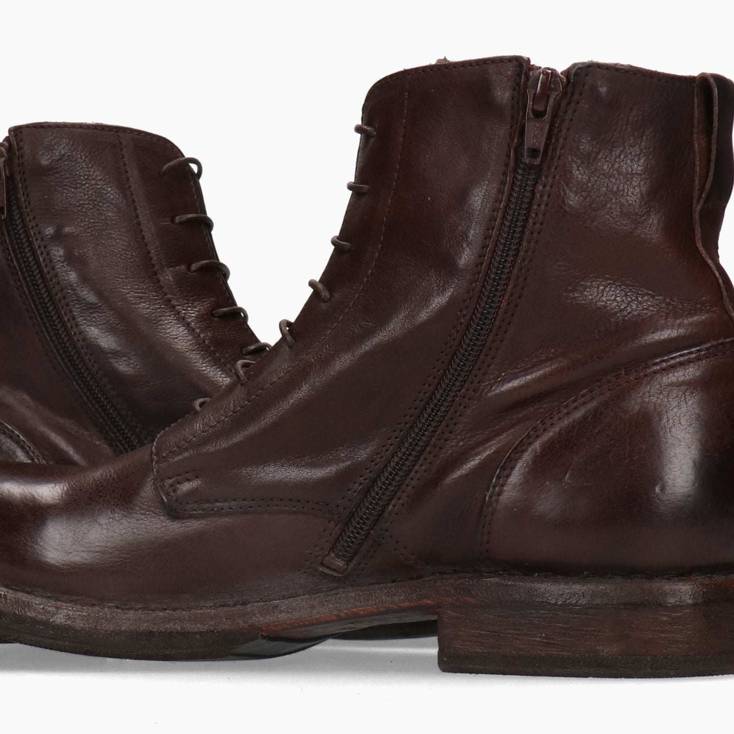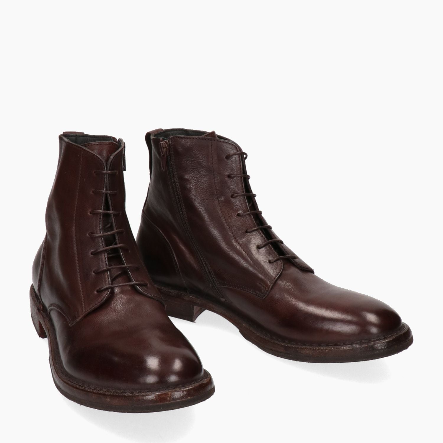 Dunkelbraune Leder-Ankle-Boots von Moma. Runde Zehenpartie. Schnür- und Reißverschluss. Sohle aus Leder und Gummi mit 3 cm Absatz. MoMa Herren-Herbst-/Winterkollektion.