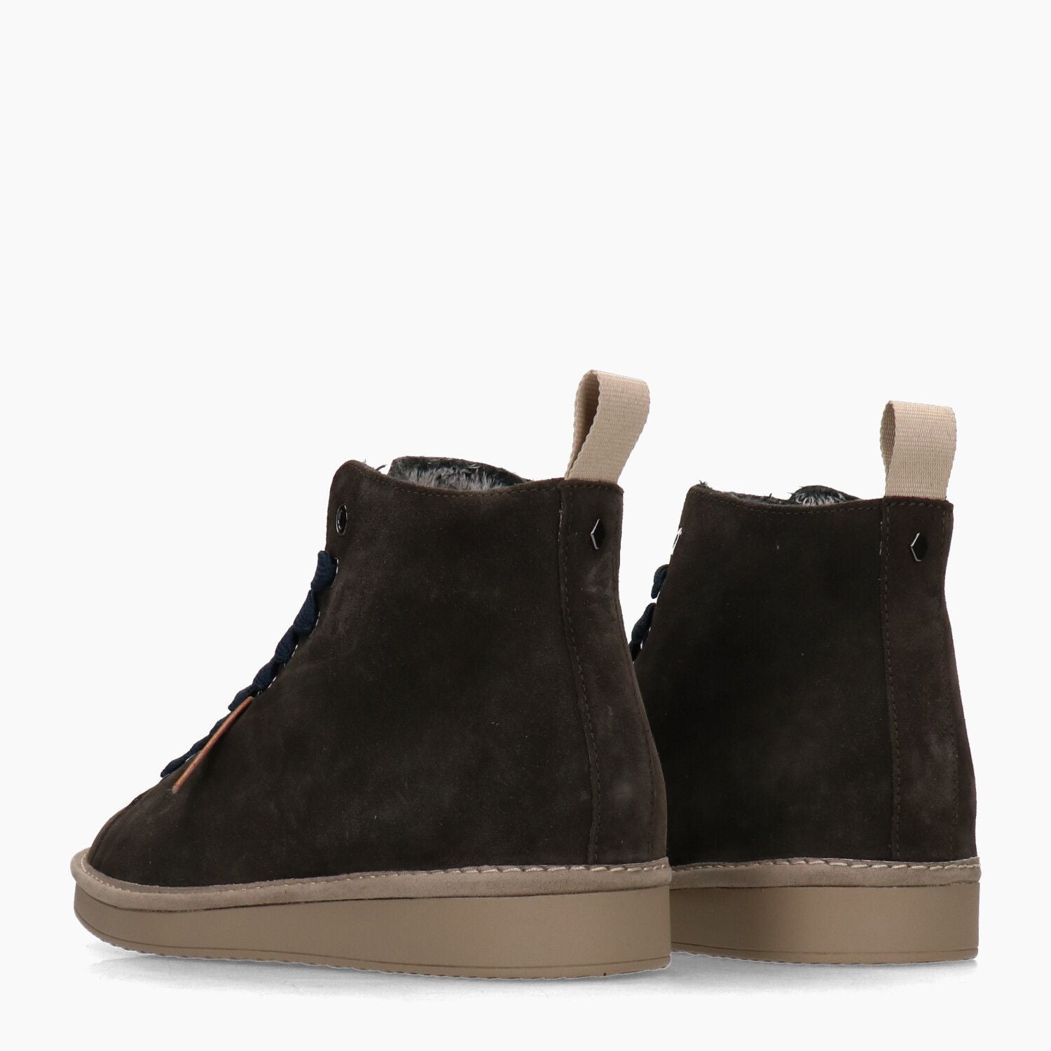 Dunkelbraune Wildleder-Ankle-Boots, Ersatzschnürsenkel in Kamelfarbe, Gummisohle.