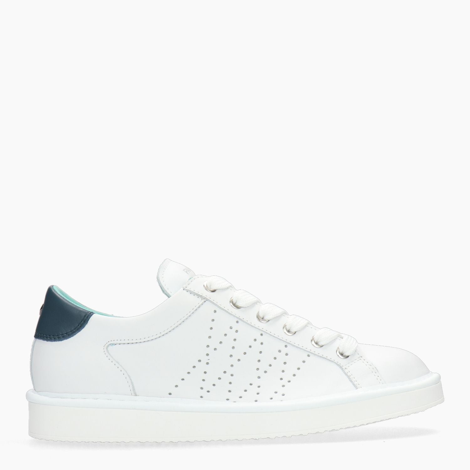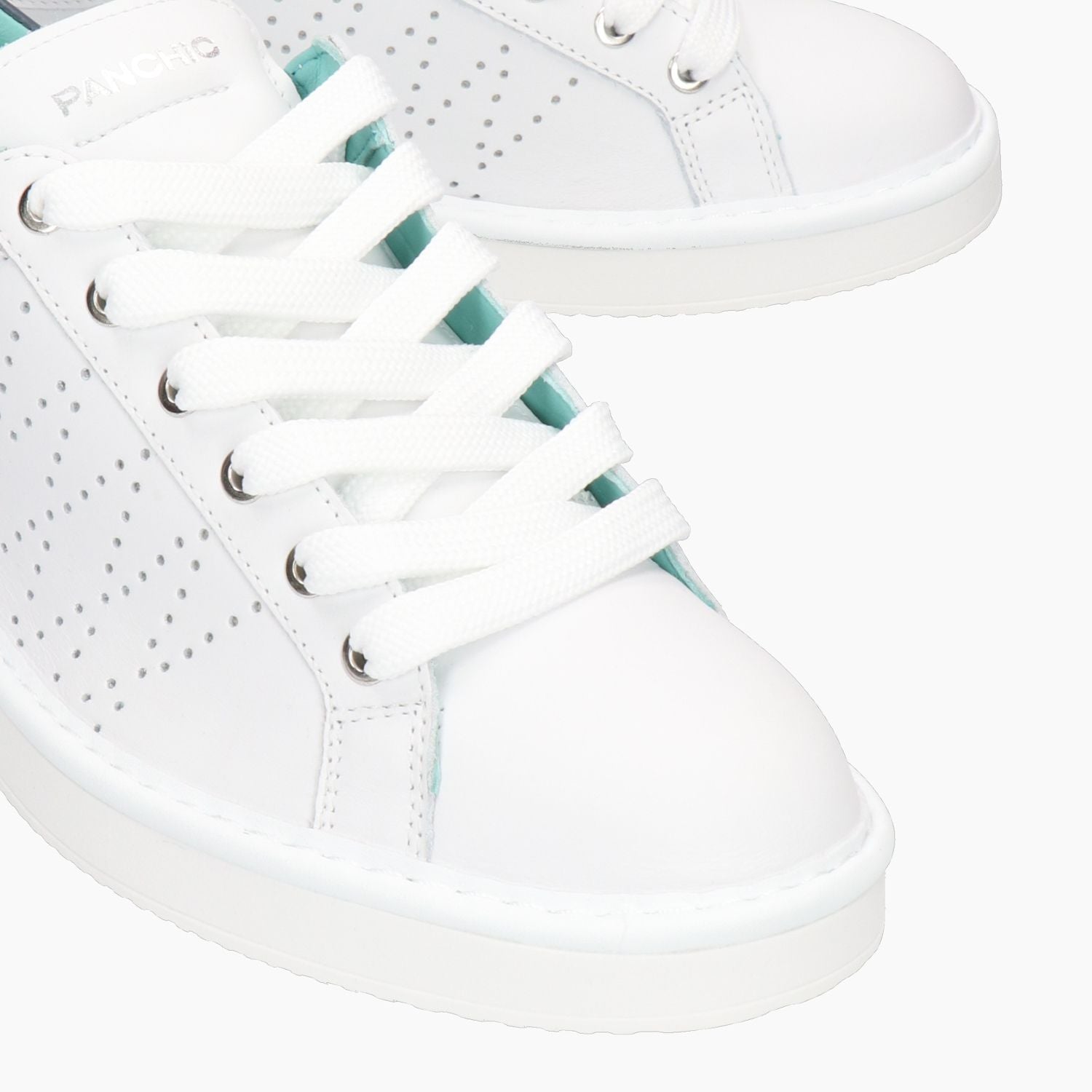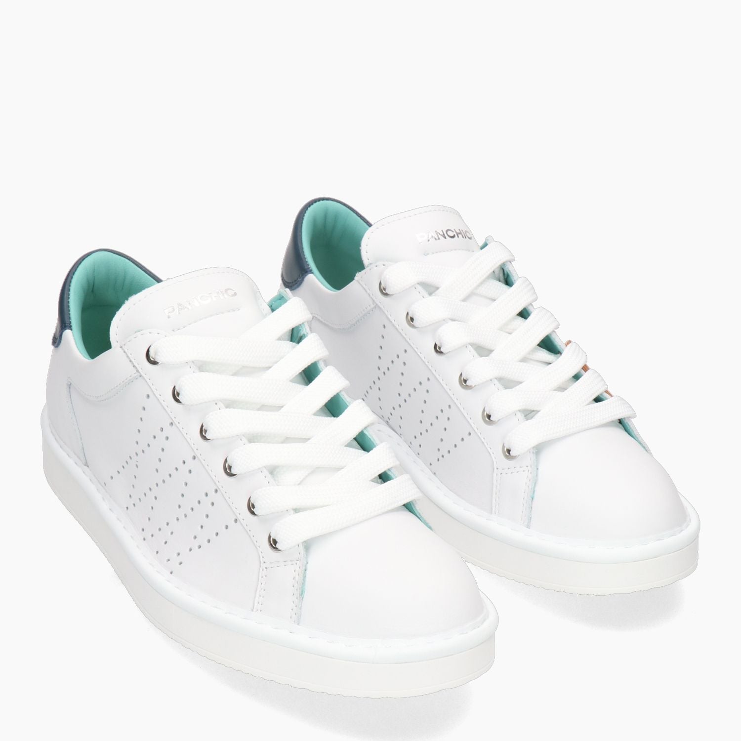Weiße Ledersneaker mit seitlichen, nicht durchgehenden Perforationen. Blaue Leder-Fersenkappe. Weiße Schnürung. Futter aus Textil und Leder. Herausnehmbare Innensohle. 3 cm hohe Gummisohle. Panchic Herren-Frühjahr/Sommer-Kollektion.