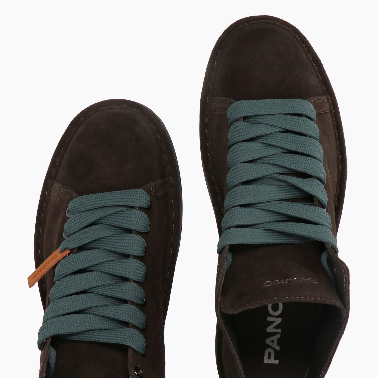 Dunkelbraune Wildleder-Ankle-Boots. Grauer Schnürverschluss. Passende Schnürsenkel. Futter aus Kunstleder. Herausnehmbare Innensohle. 3 cm hohe graue Gummisohle. Panchic Herren Herbst/Winter Kollektion.