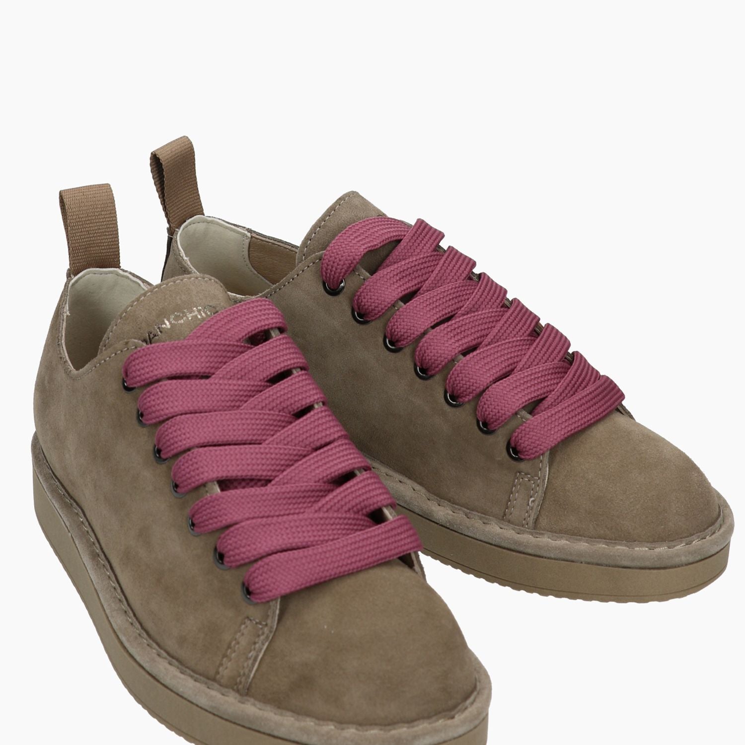 Schnürschuhe aus taupefarbenem Wildleder. Schnürverschluss in Antikrosa mit zusätzlichen hellbraunen Schnürsenkeln. Lederfutter mit herausnehmbarer Mikrofaser-Innensohle. 3 cm hohe Gummisohle. Panchic Damenkollektion.