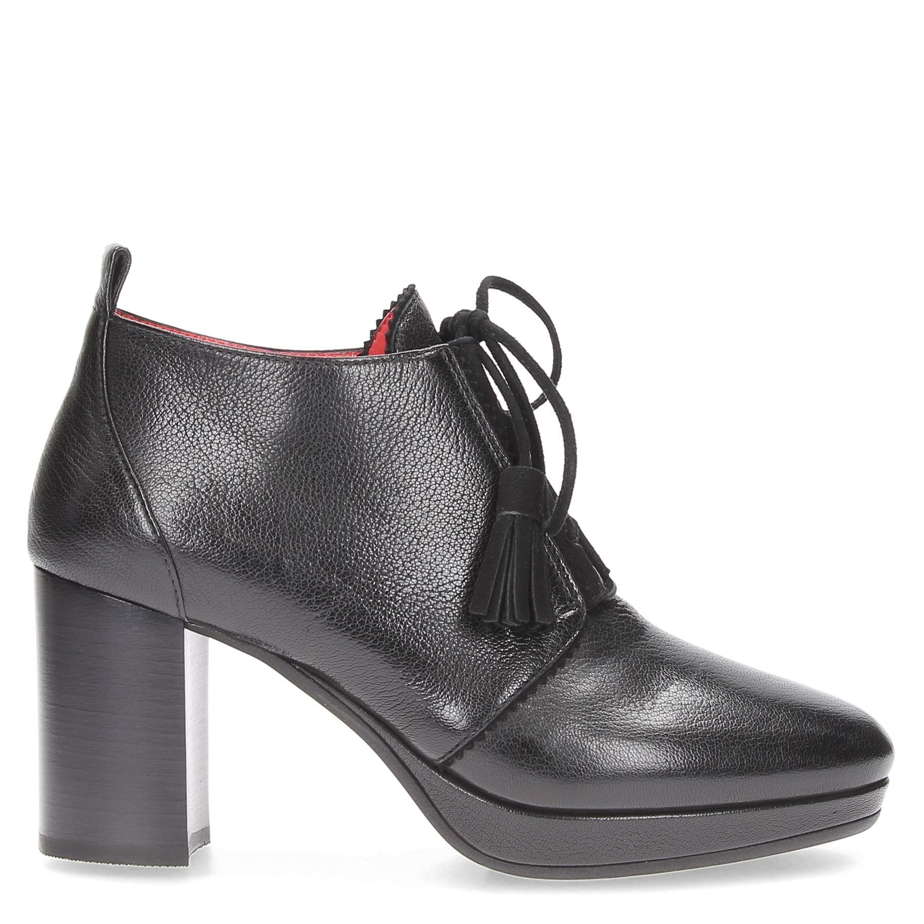 Schwarze Leder-Ankle-Boots, Wildlederschnürung mit Quaste am Ende, 80 cm Absatz, 15 cm Plateau, Gummisohle.