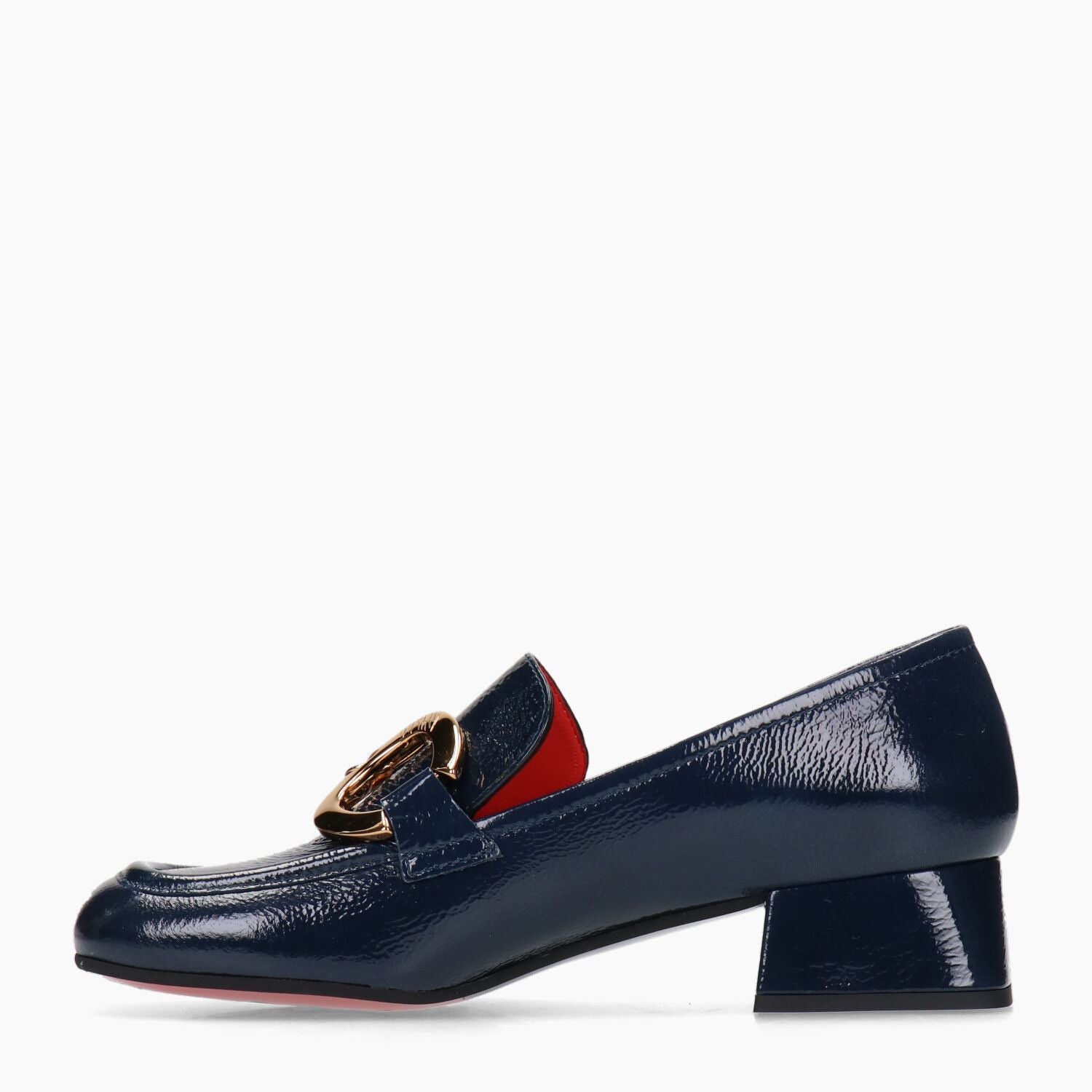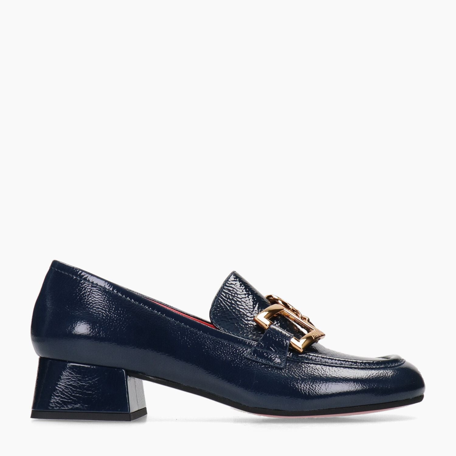 Blaue Lacklederslipper mit goldfarbenem Metallclip und Gummisohle.