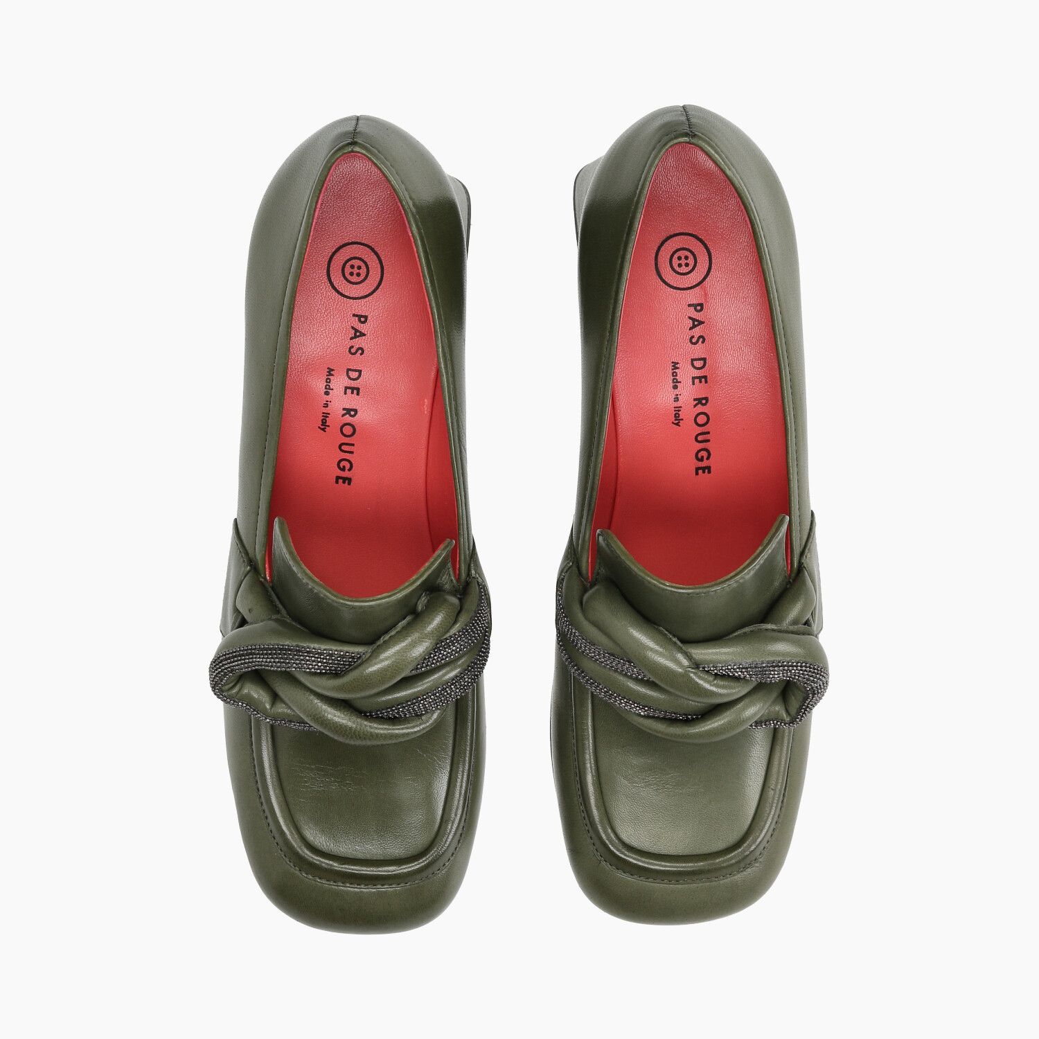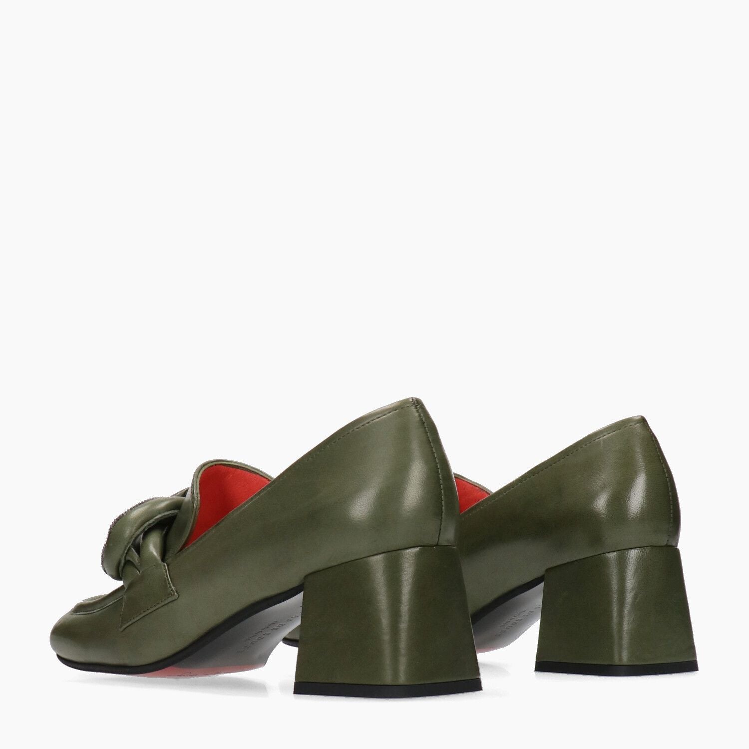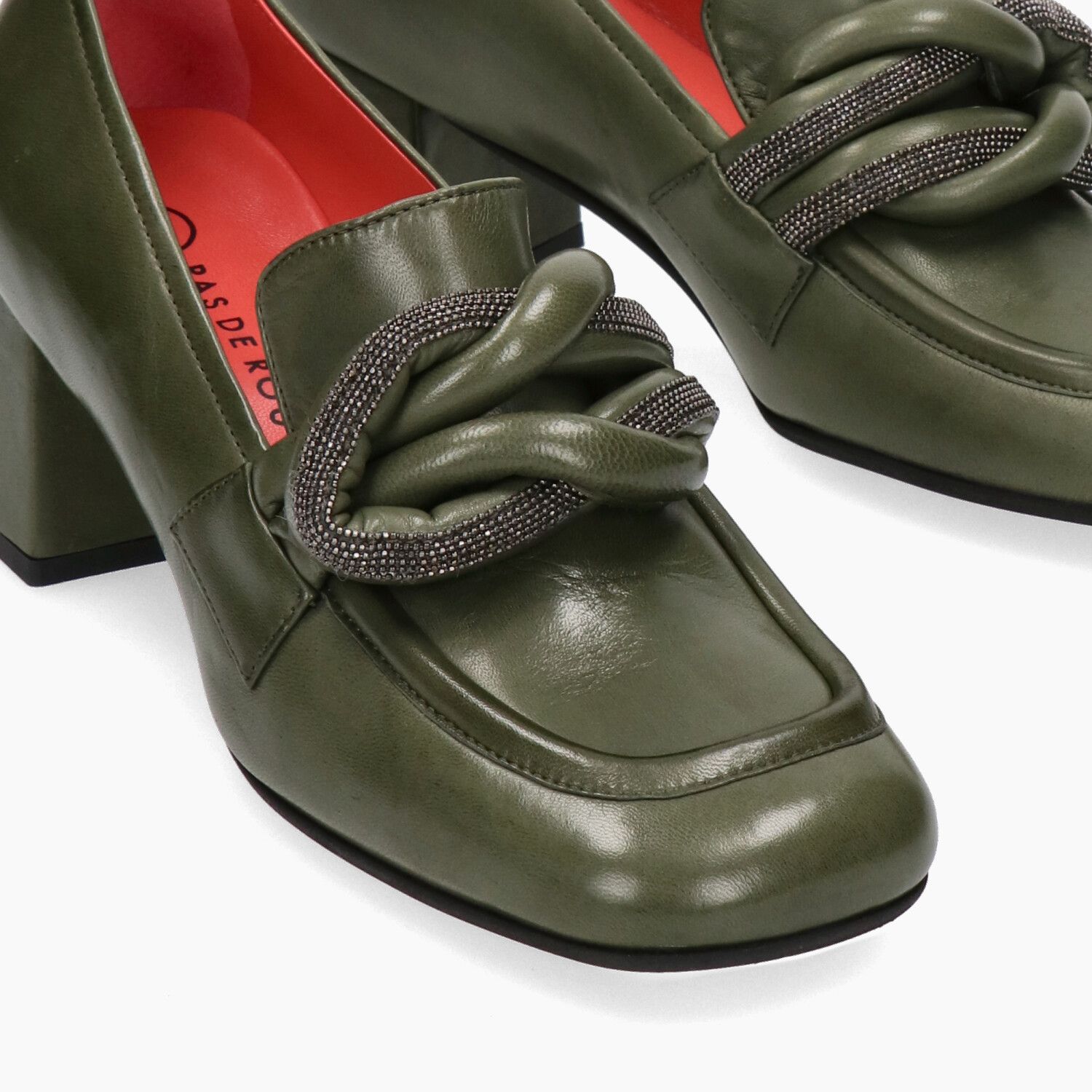 Waldgrüne Lederslipper mit lederbezogenem Clip und Sohle aus Leder und Gummi.