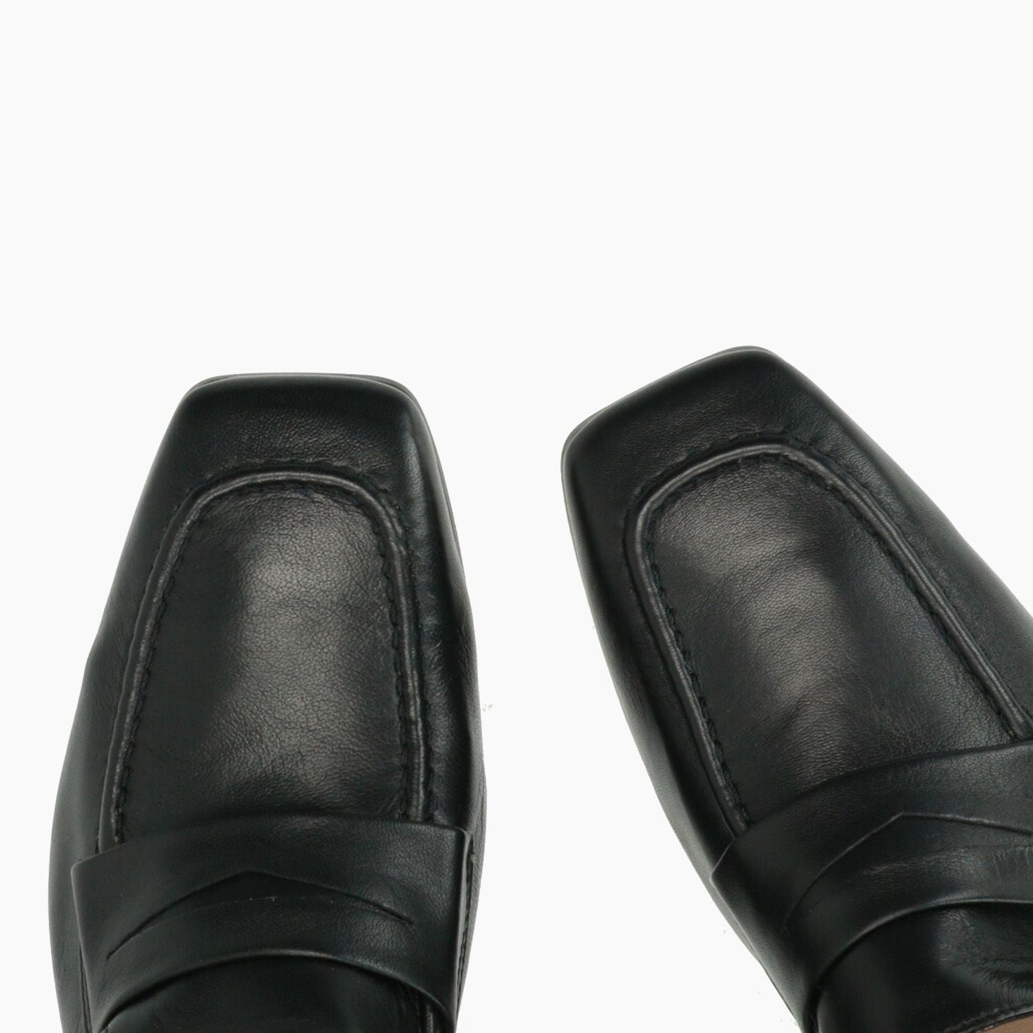 Schwarze Lederslipper. Quadratische Zehenpartie. Lederfutter. Ledersohle mit Gummieinsatz. 5 cm Absatz. Damenkollektion Pomme D'Or.