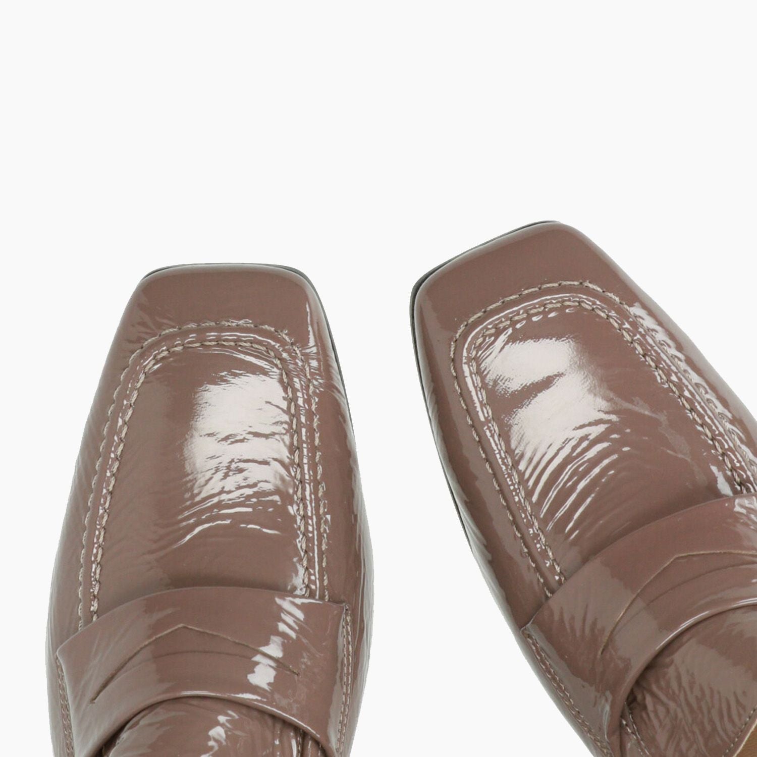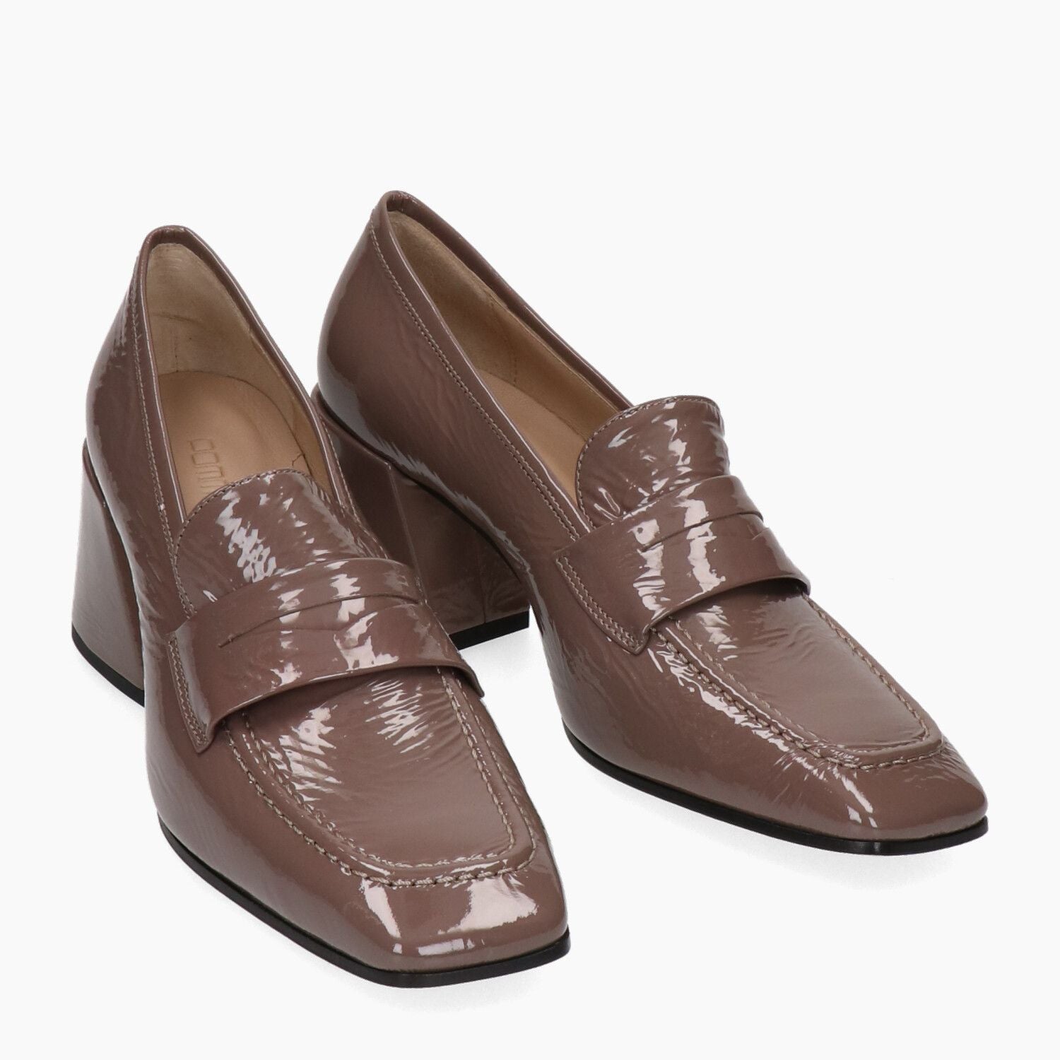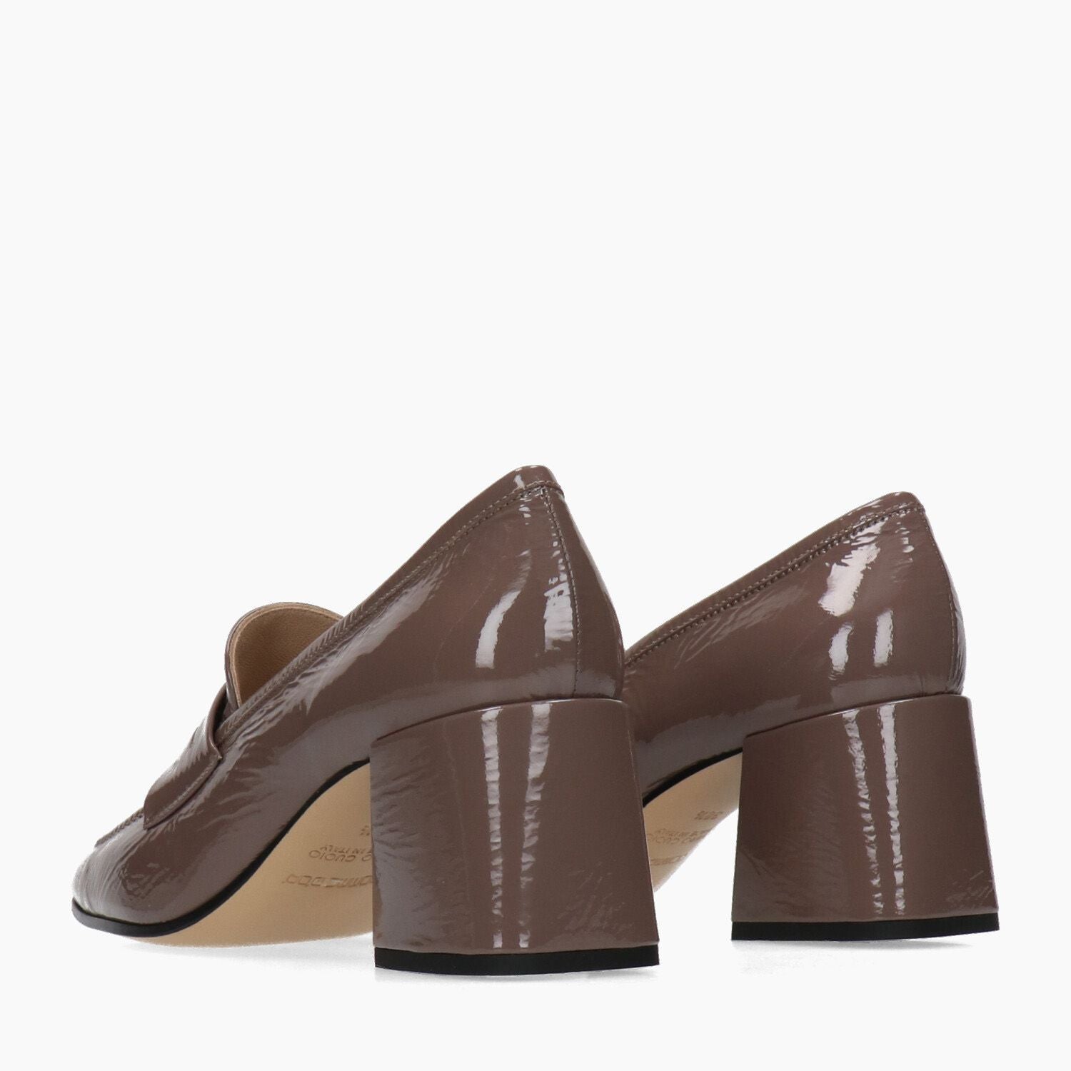 Mokassins mit taubengrauem Lackleder-Obermaterial. Quadratische Zehenpartie. Lederfutter. Ledersohle mit Gummiinnensohle. 5 cm Absatz. Damenkollektion Pomme D'Or.